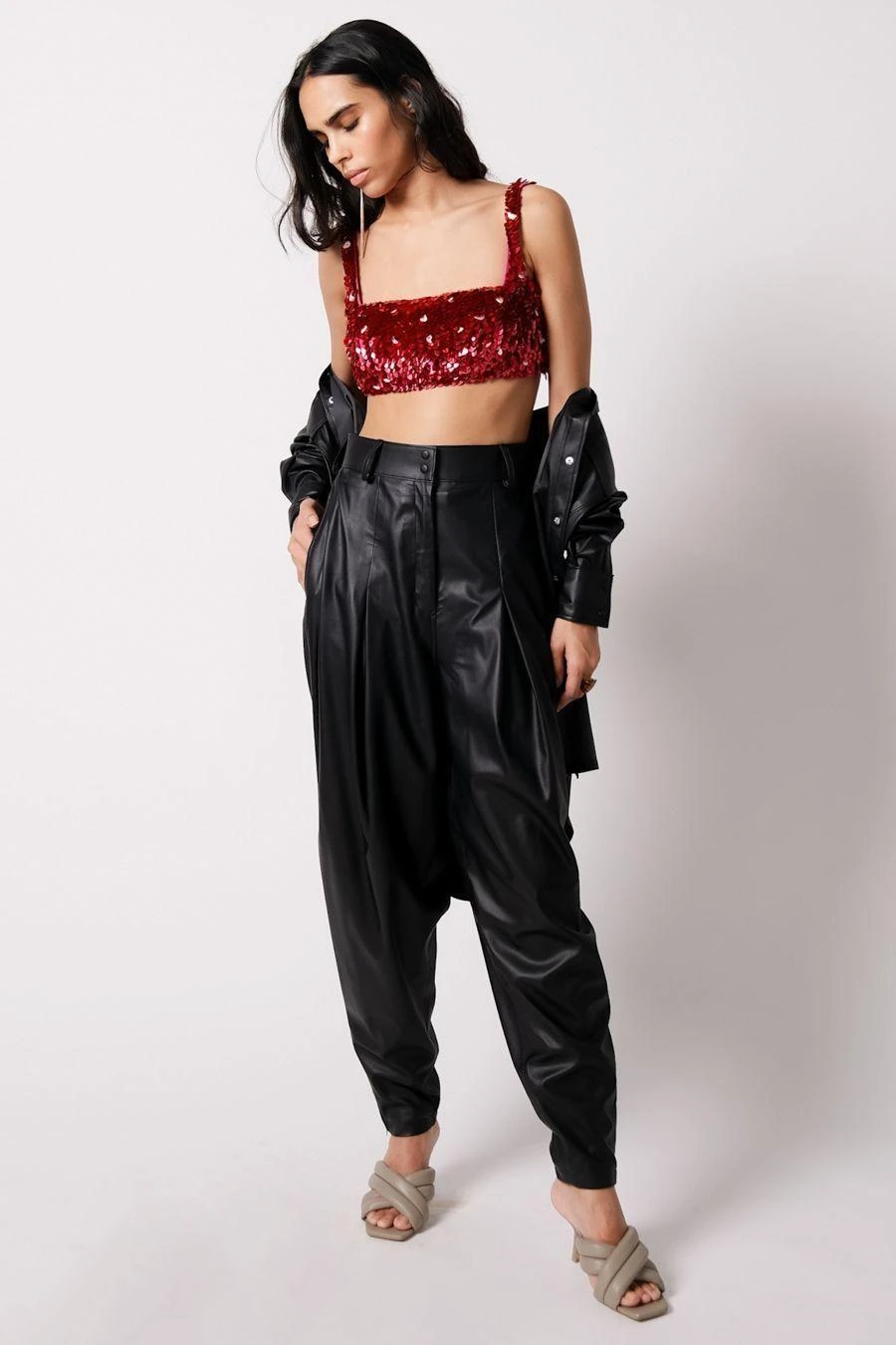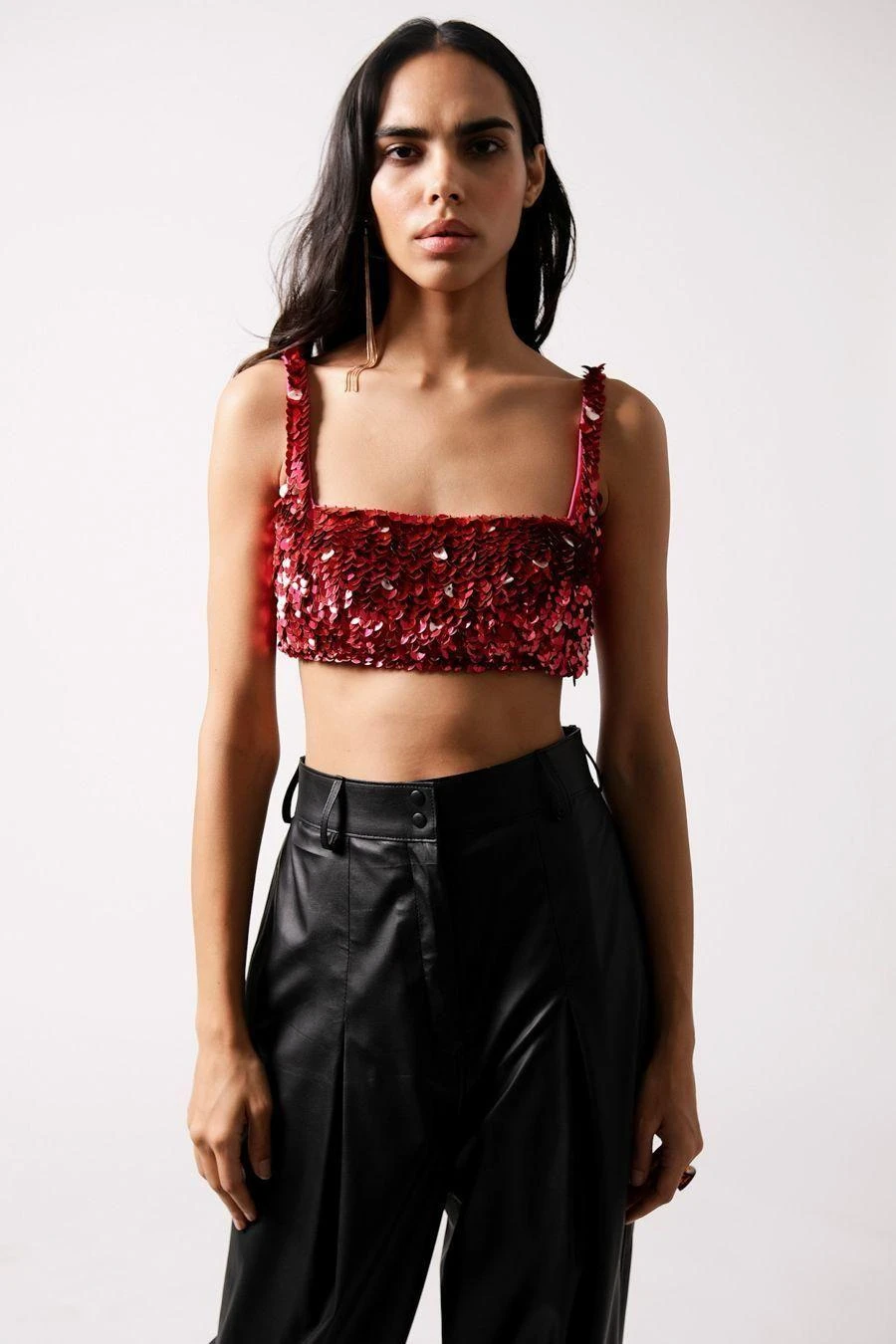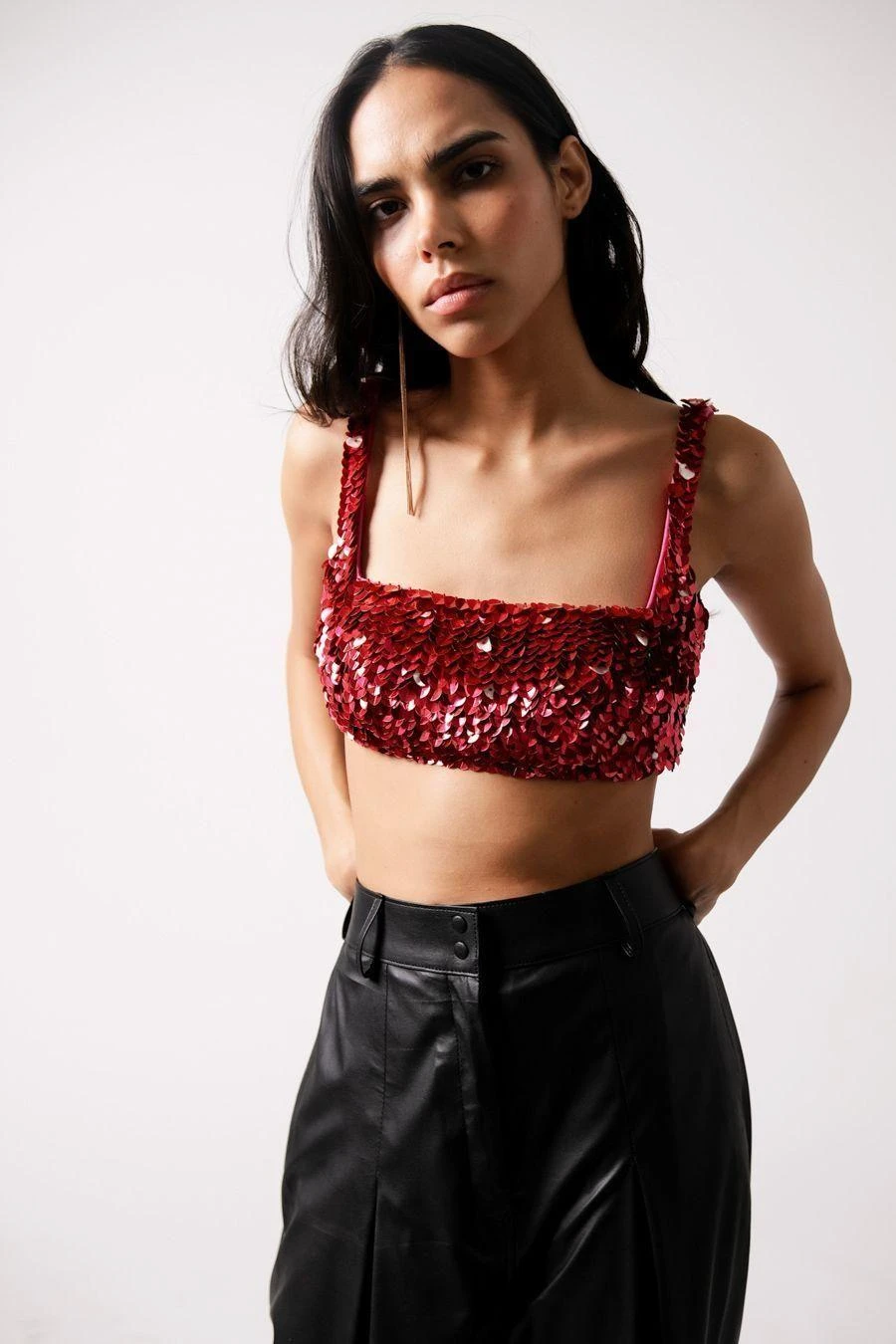 This statement blouse will make dressing up for a party a breeze. Crafted in silk, this blouse is cut with a deep square neckline and thin straps. It is hand embroidered with metallic sequins and shells, it closes on the side with a zipper.