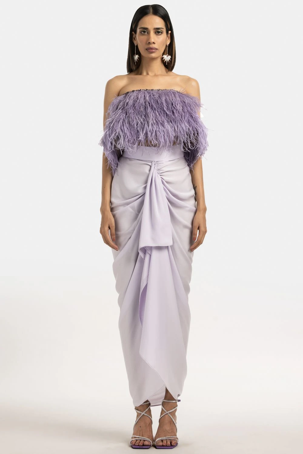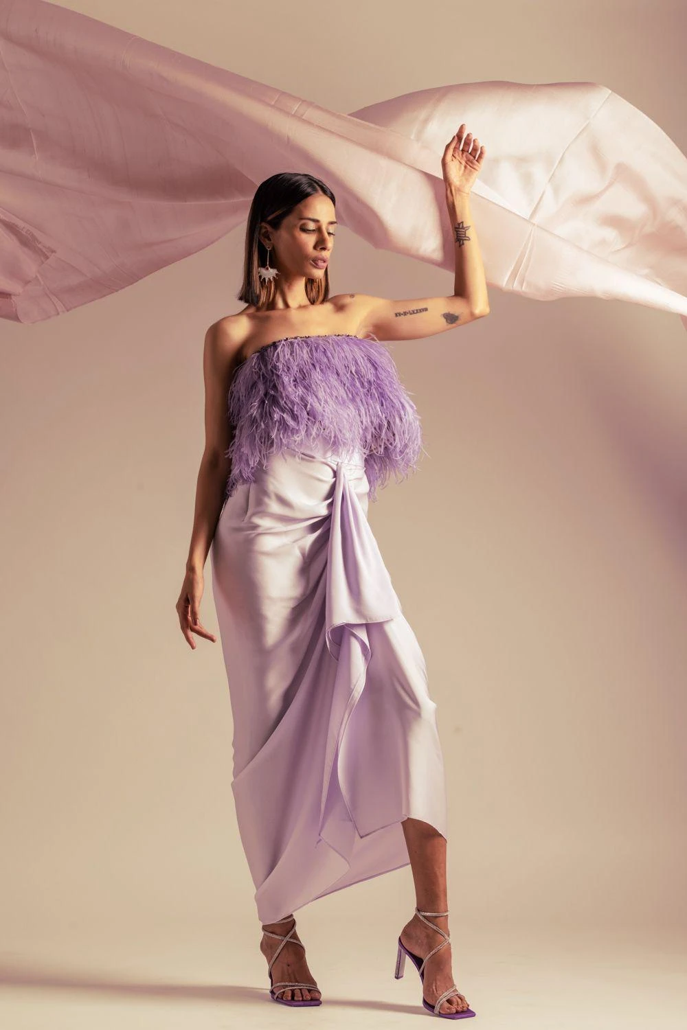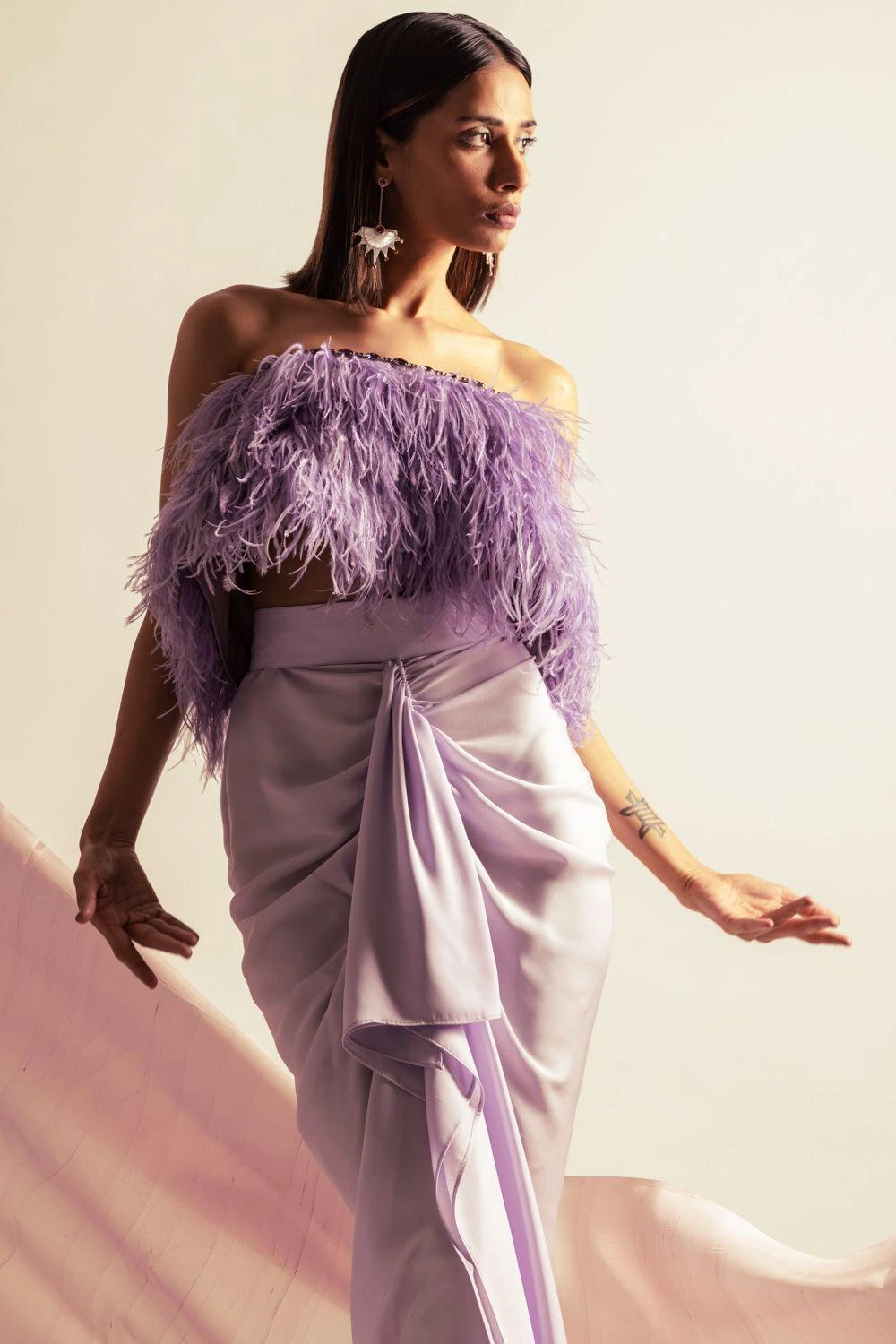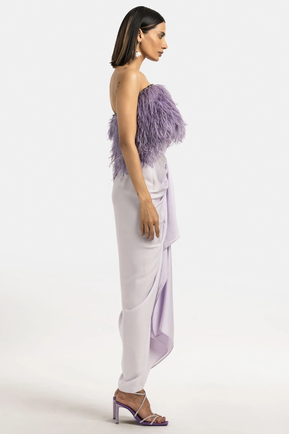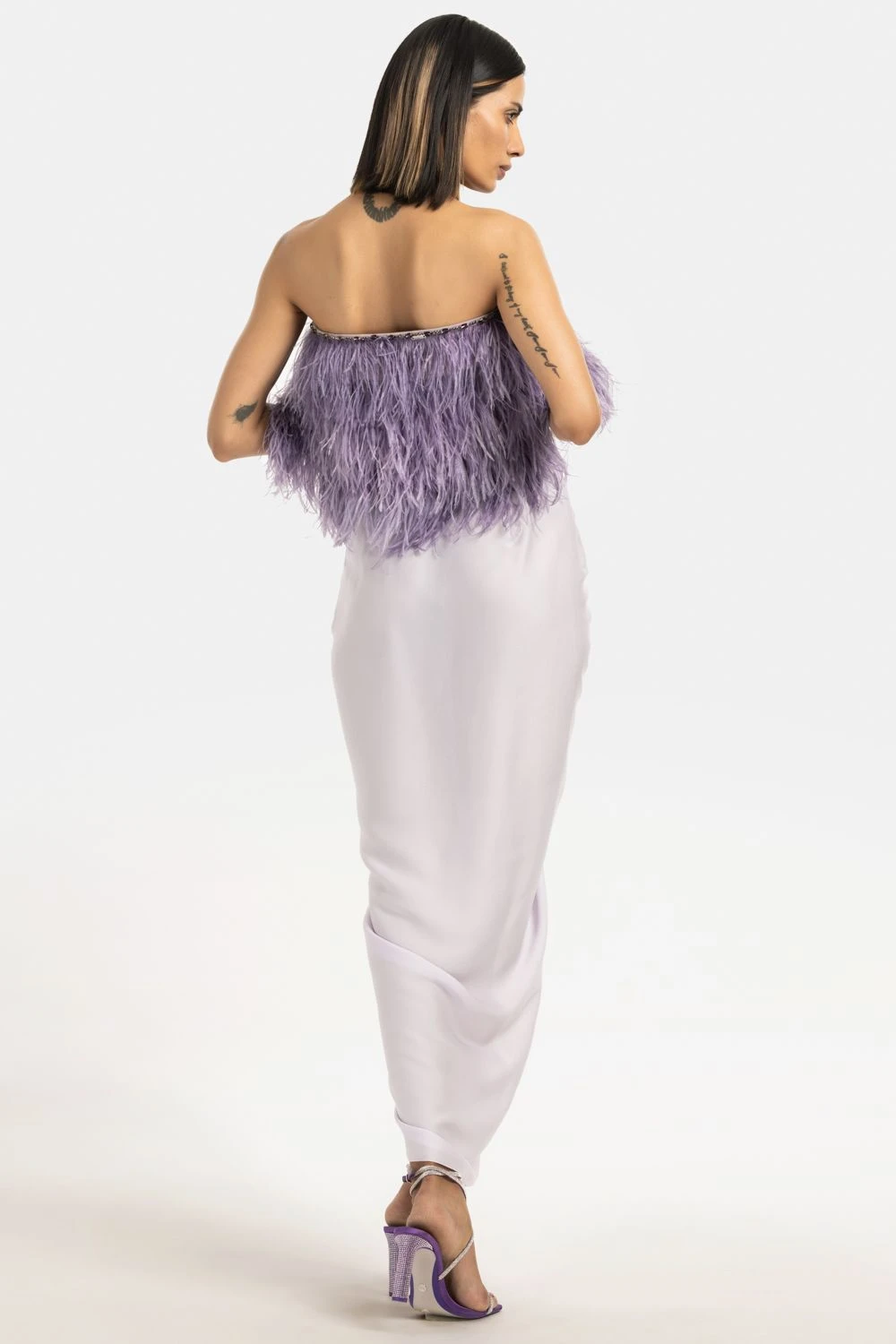 Look effortlessly stylish in this lilac faux feather top. This tube top is layered with soft faux feathers & features crystal embellishments. It is lined with satin and has a side zipper. Style this top with a draped skirt to complete the look.