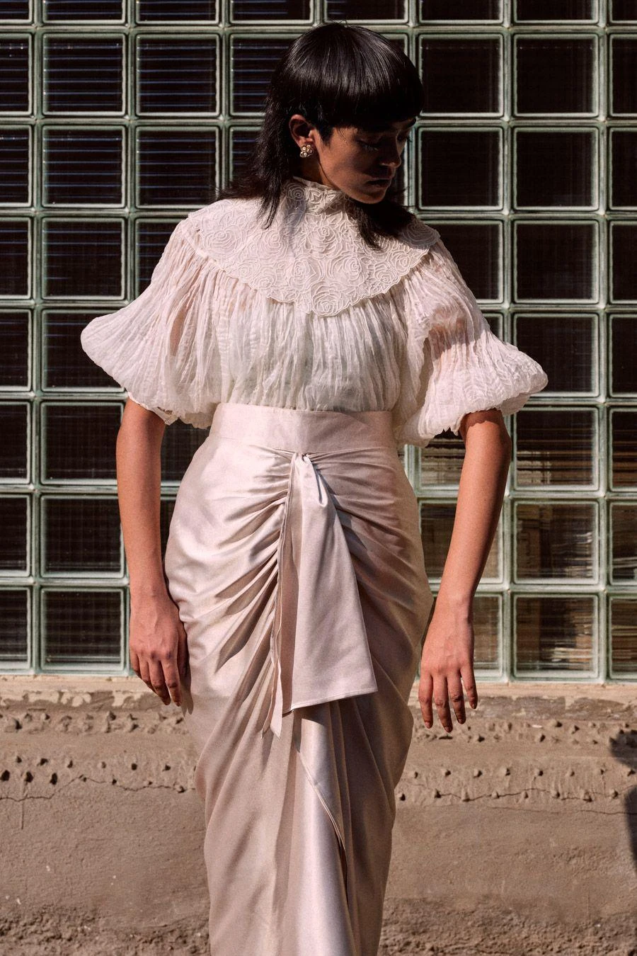 This silver drape skirt will fetch you a slinky look with its glove fit. It is cut in satin with ruch & drape detailing in the centre. You can style it with a matching top from the collection.