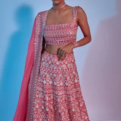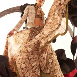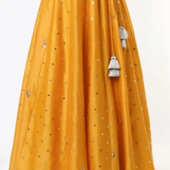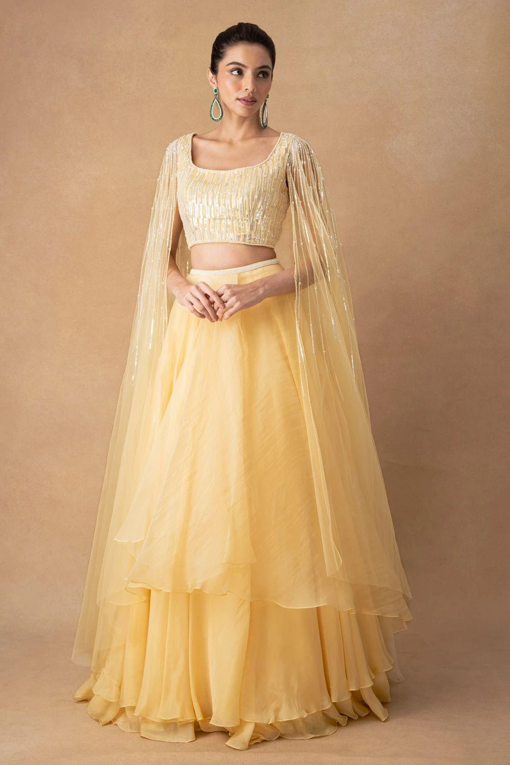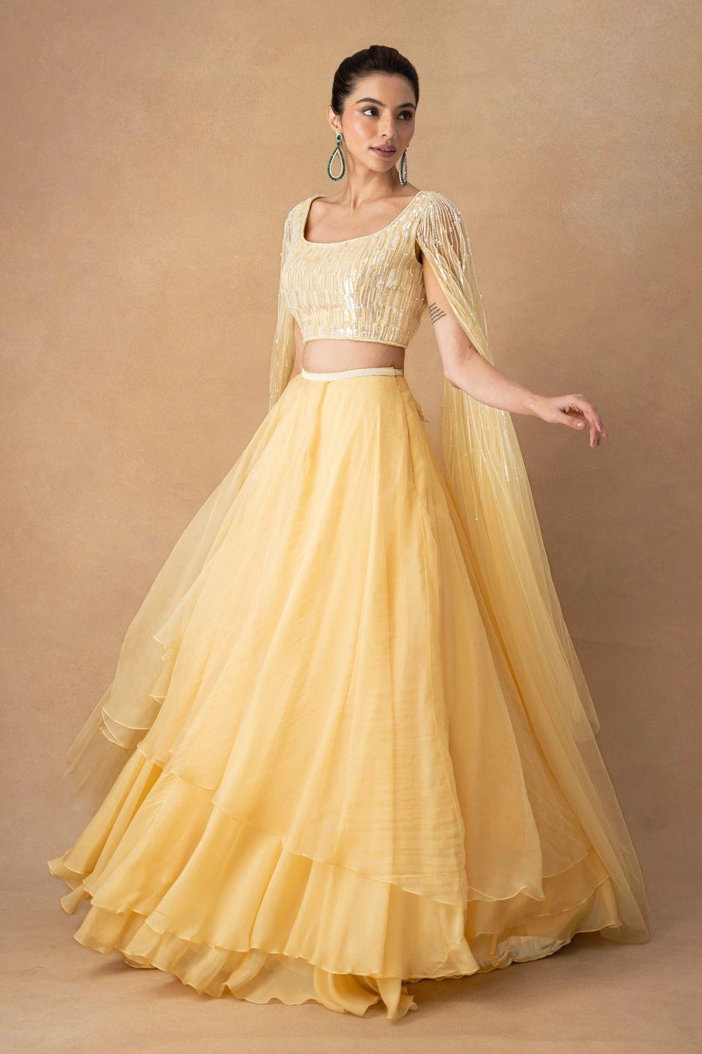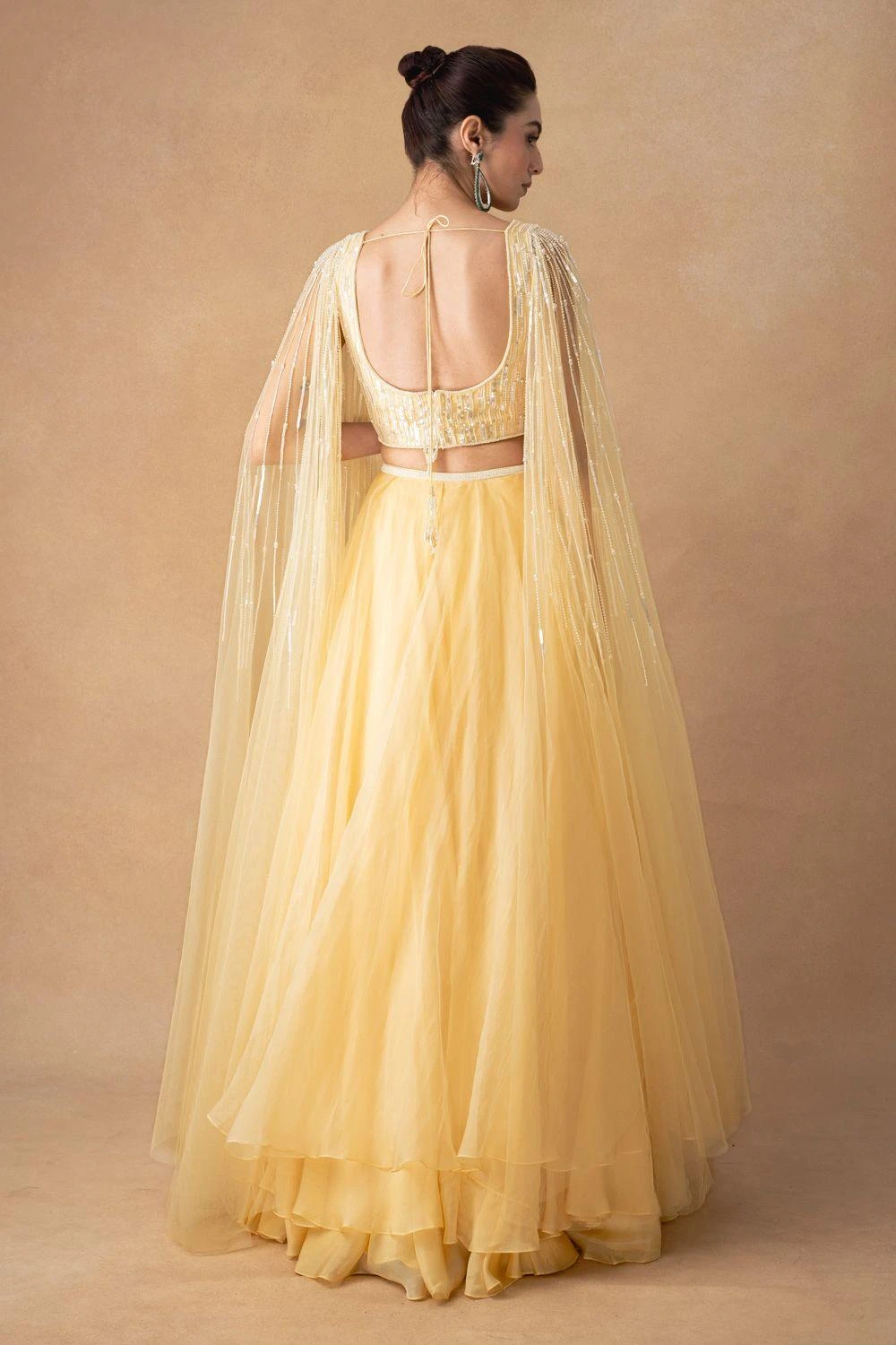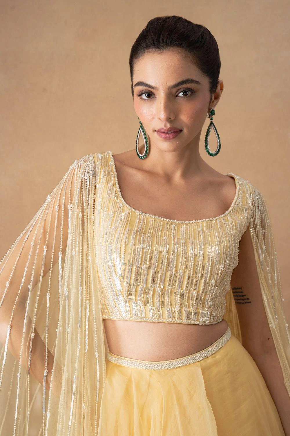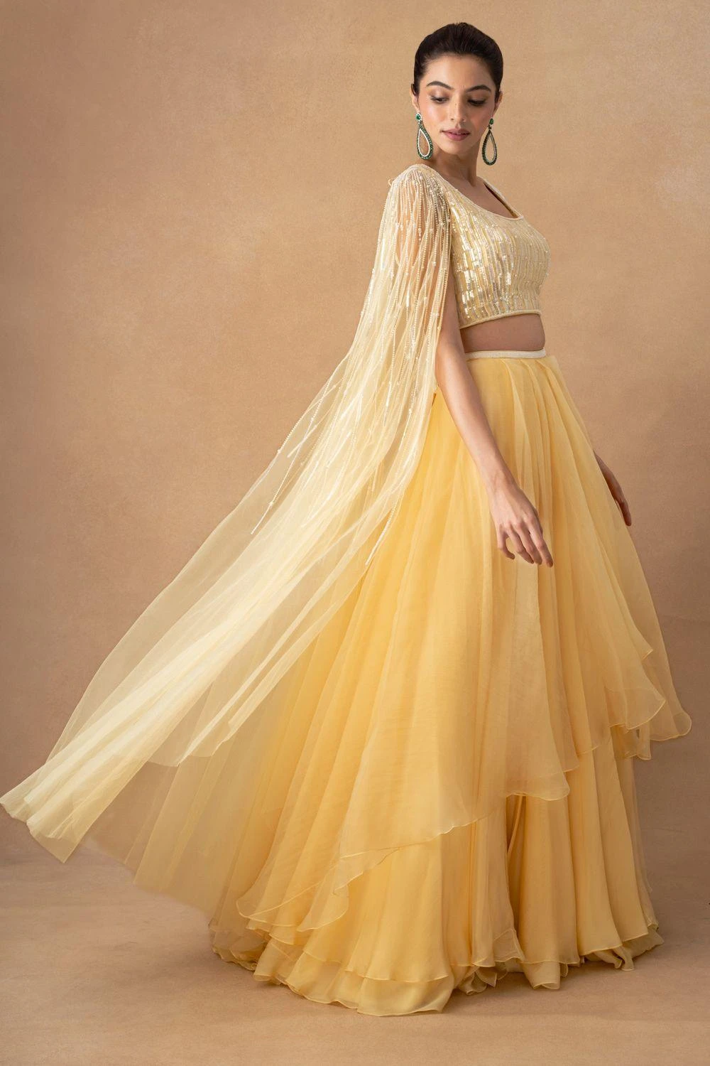 In the realm of opulence, embrace the Pastel Yellow Floral Organza Lehenga Set. A tapestry of sequins bedecks the ensemble, featuring a captivating lehenga & a blouse draped in the elegance of a cape style. Elevate your style saga.