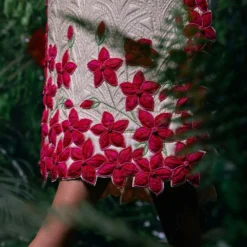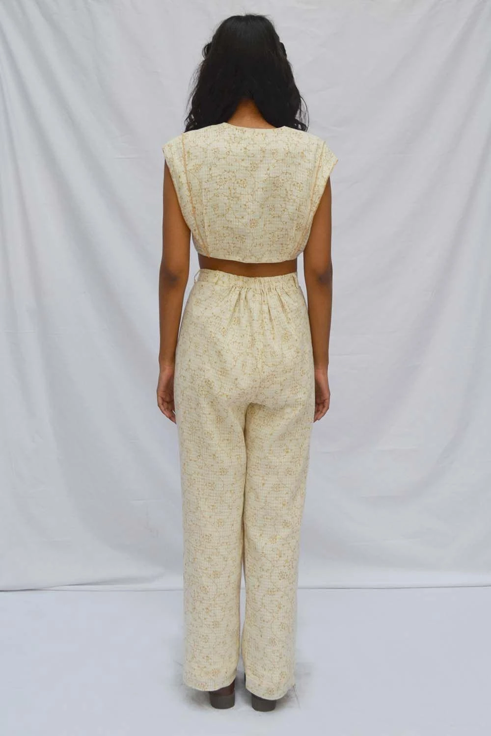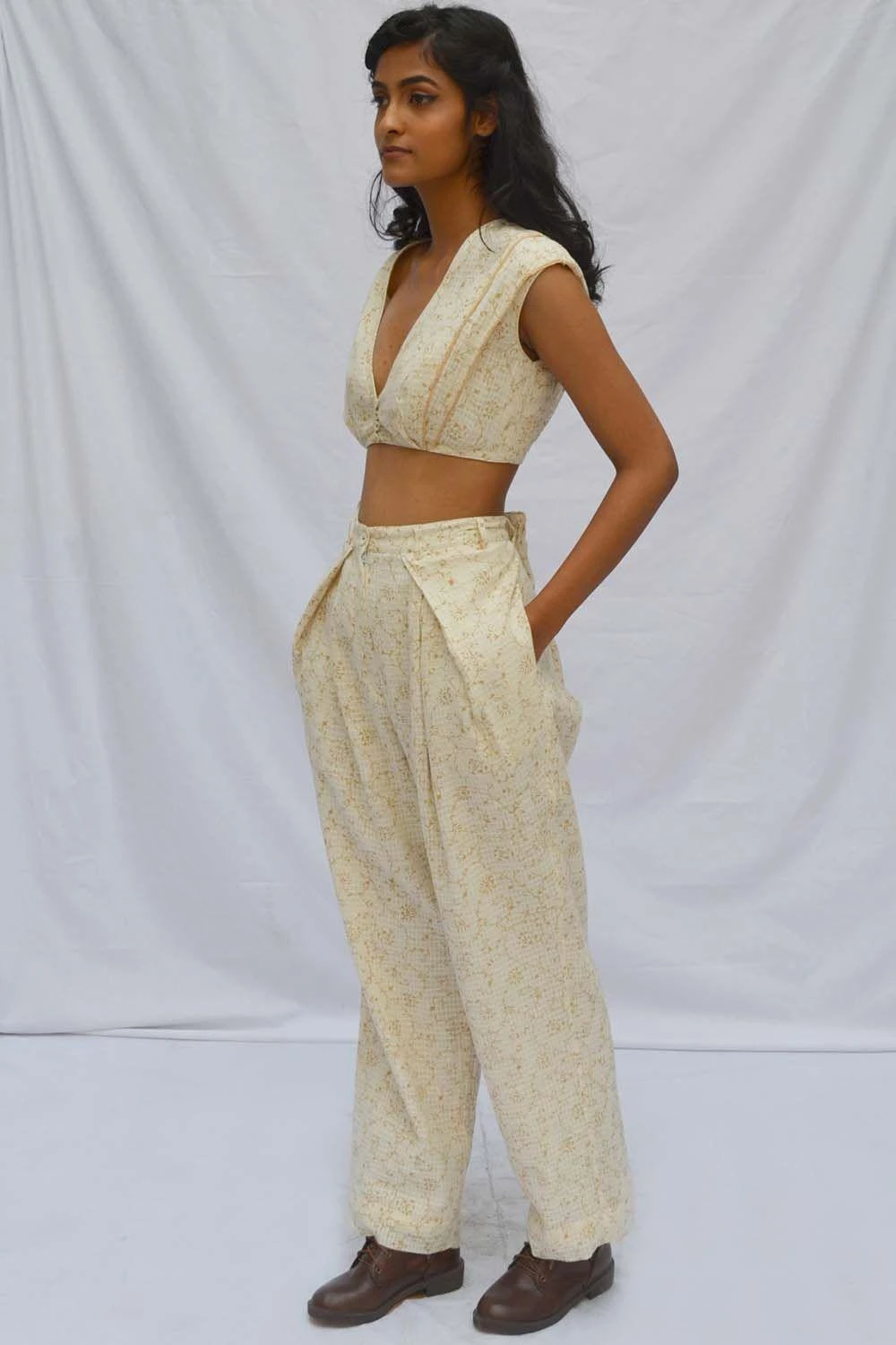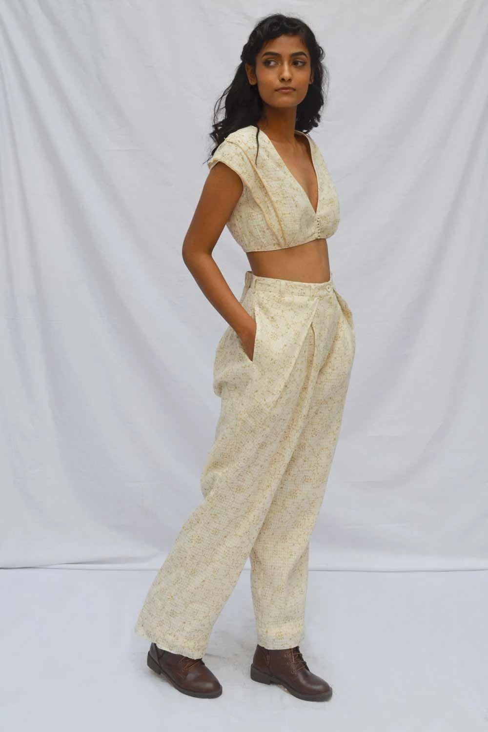 This overlap pleated pant is made from check kora cotton with 3-d block print lining. The sheer and opaque layers of fabric redefine elegance, exuding a sense of luxury with its form-fitting waist and overlapping pleats. A timeless piece for sure.