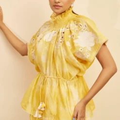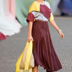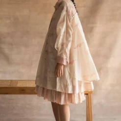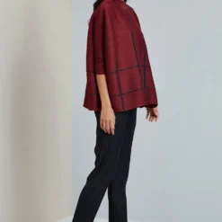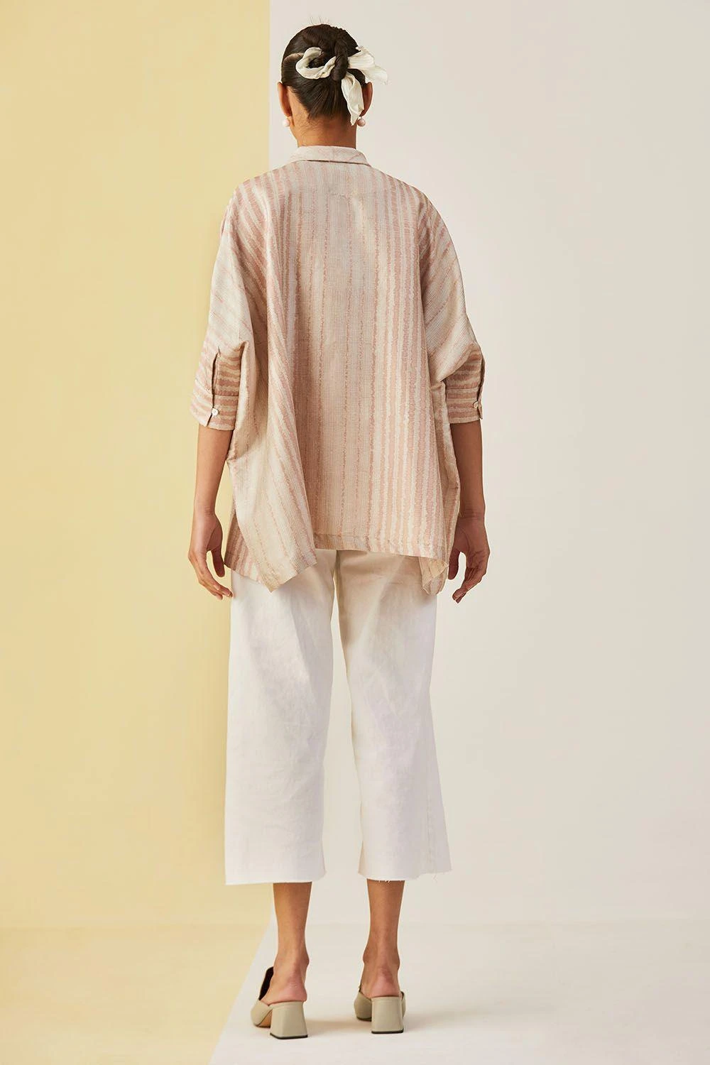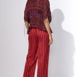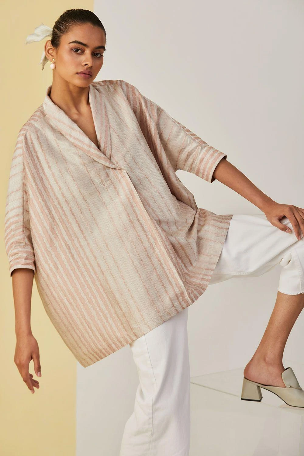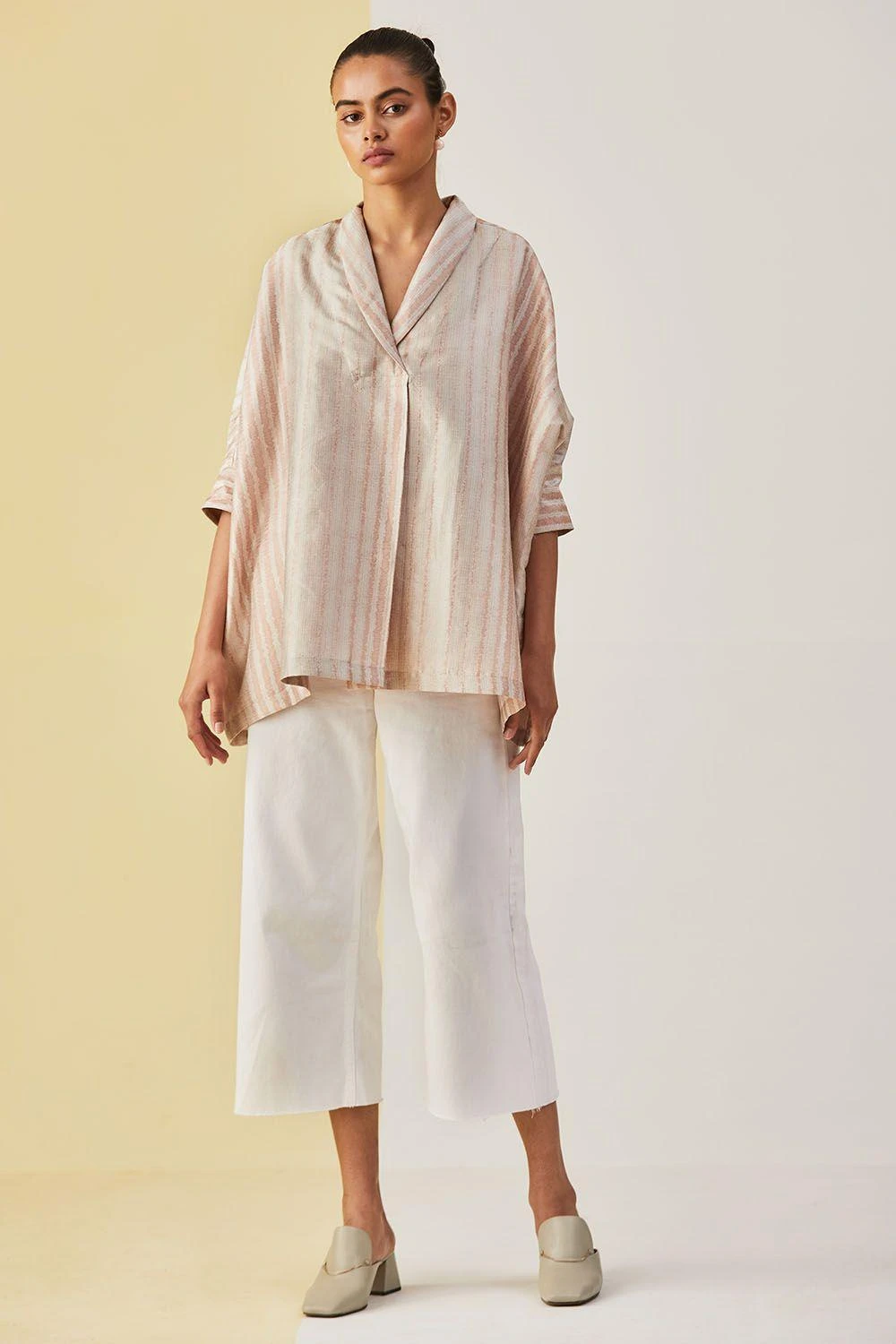 Silk linen canyon clay top with pink stripes and shawl collar is a versatile kaftan top.It can be paired with shorts, trousers or jeans; a truly versatile addition to your wardrobe.