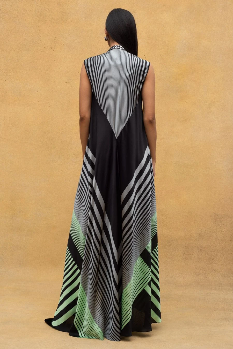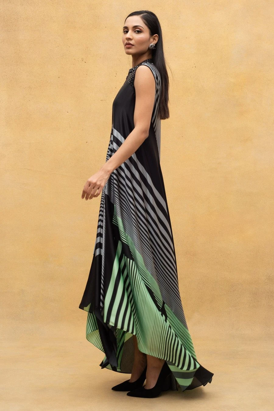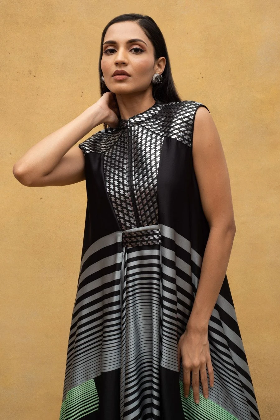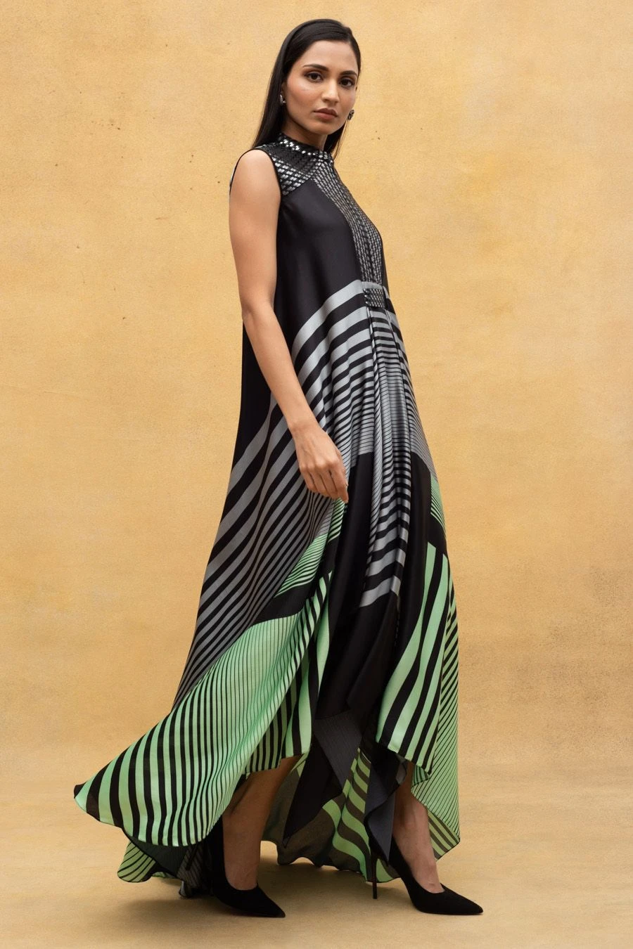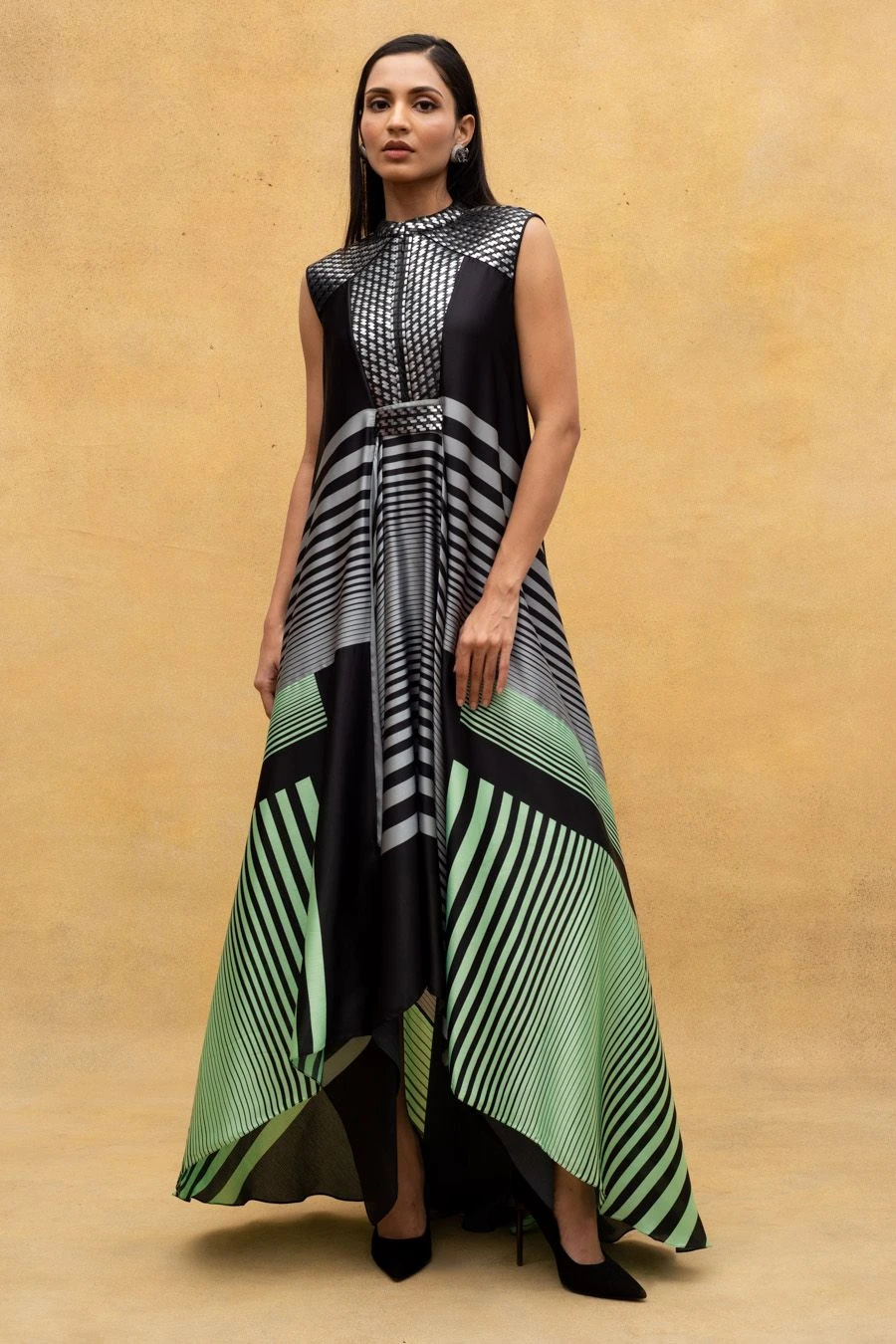 Crafted in chiffon, this beautifully & meticulously designed paneled dress features a metallic yoke & an asymmetric hem.