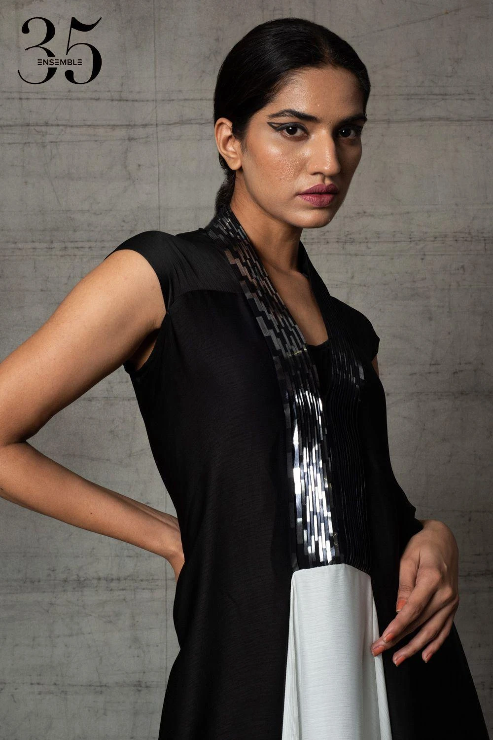 A yearlong celebration of its 35th anniversary telling the story of modern Indian fashion. Crafted in chiffon, this beautifully & meticulously designed draped dress features a metallic placket & an asymmetric hem.