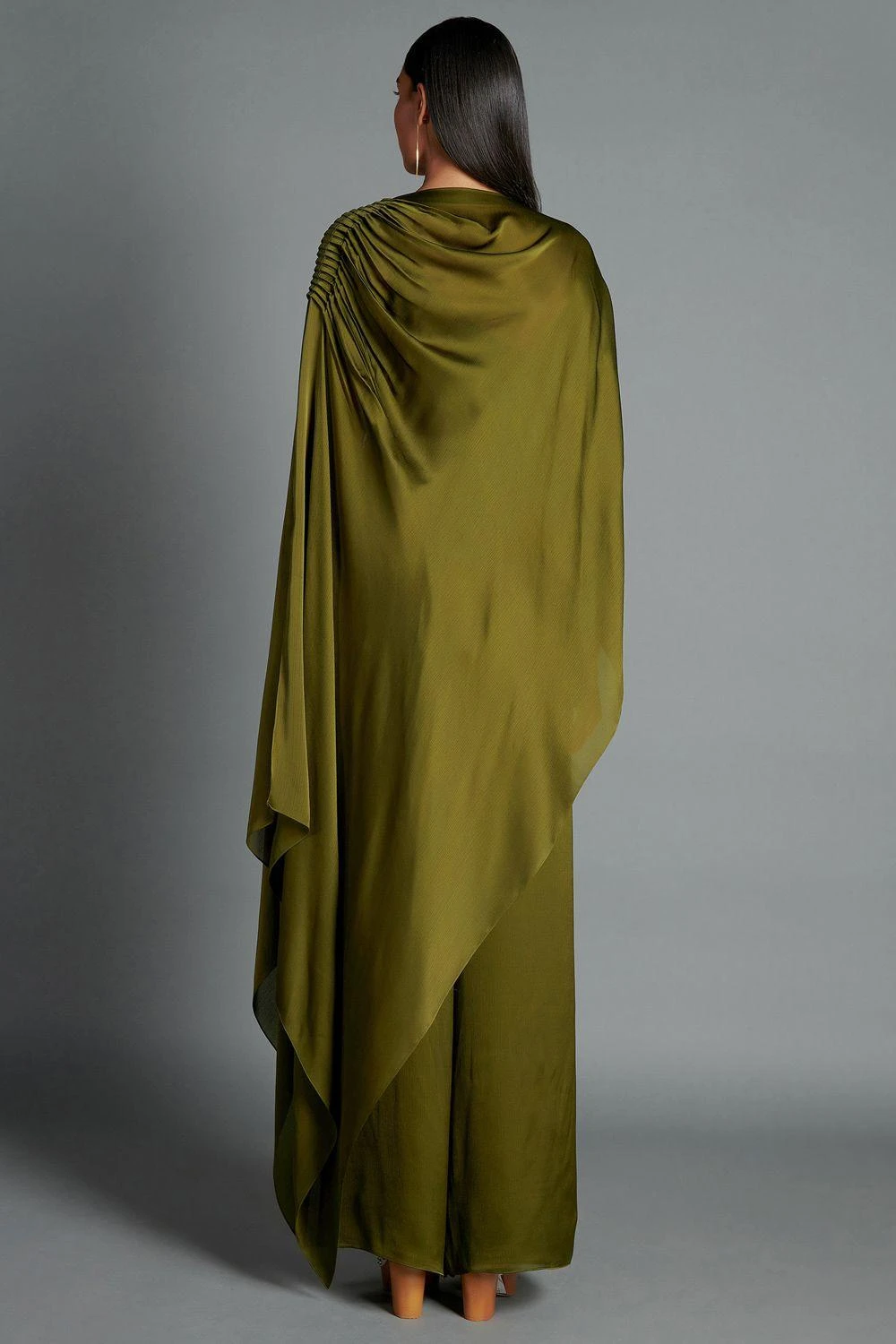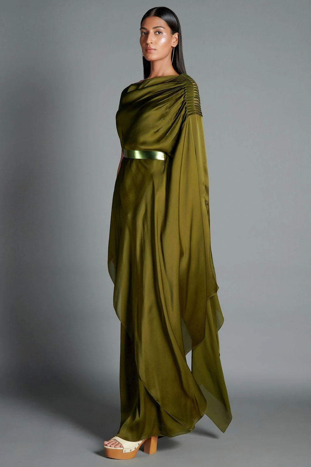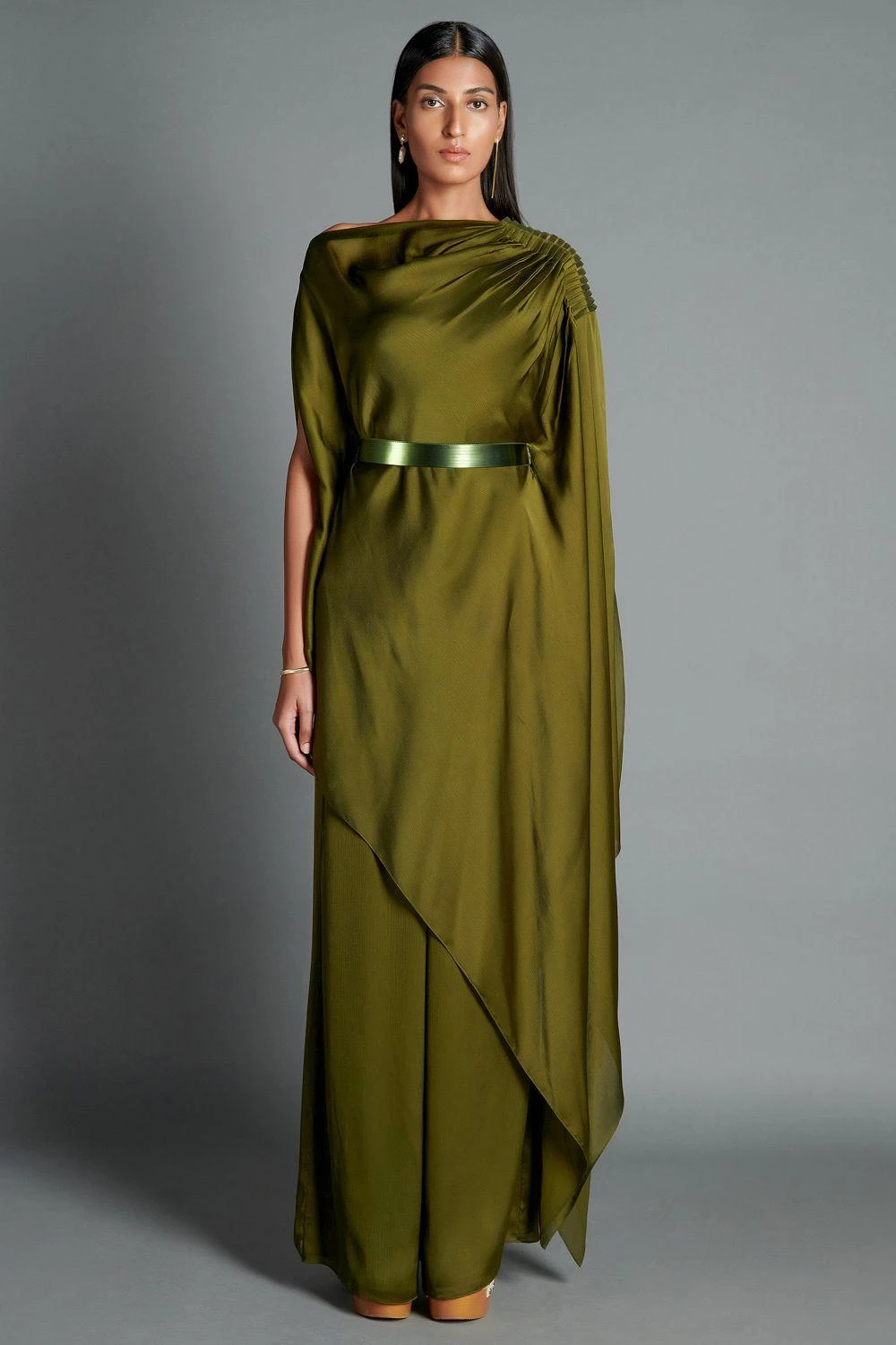 Set in buttery chiffon, this olive drape top is both feminine & flirty. It is cut in an asymmetric silhouette with gathering details on one part of the shoulder. This chic piece is accentuated with a metallic belted detail.