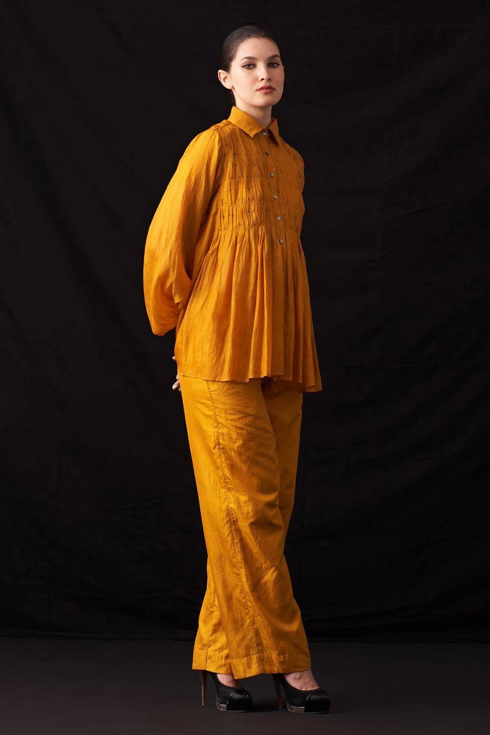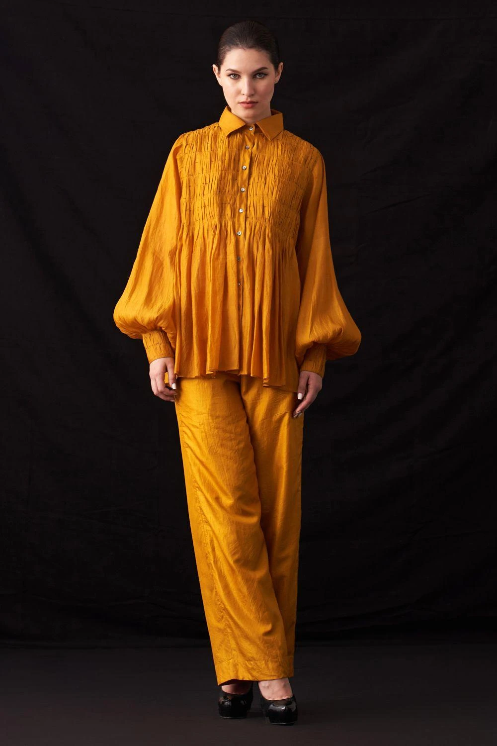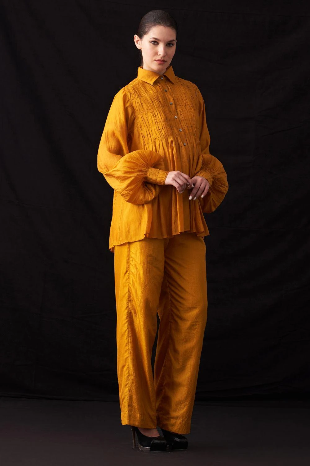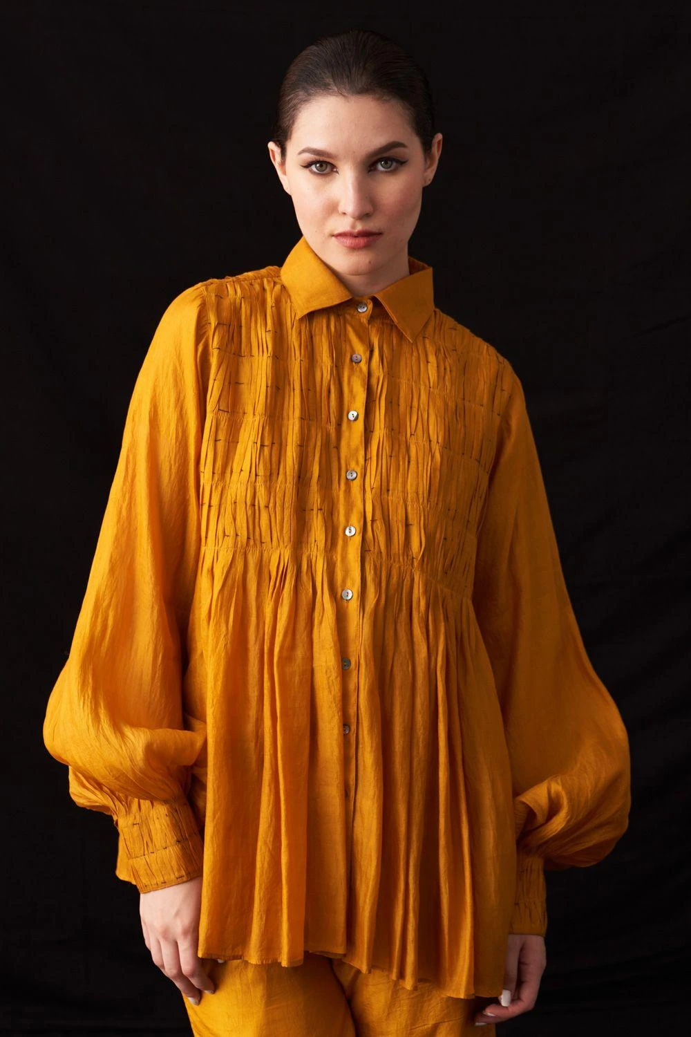 Elevate your style with this hand-woven silk button-down shirt. Featuring exquisite hand-embroidered textures on the yoke, it’s a masterpiece of craftsmanship. Add a pair of dangler earrings to complete the look.