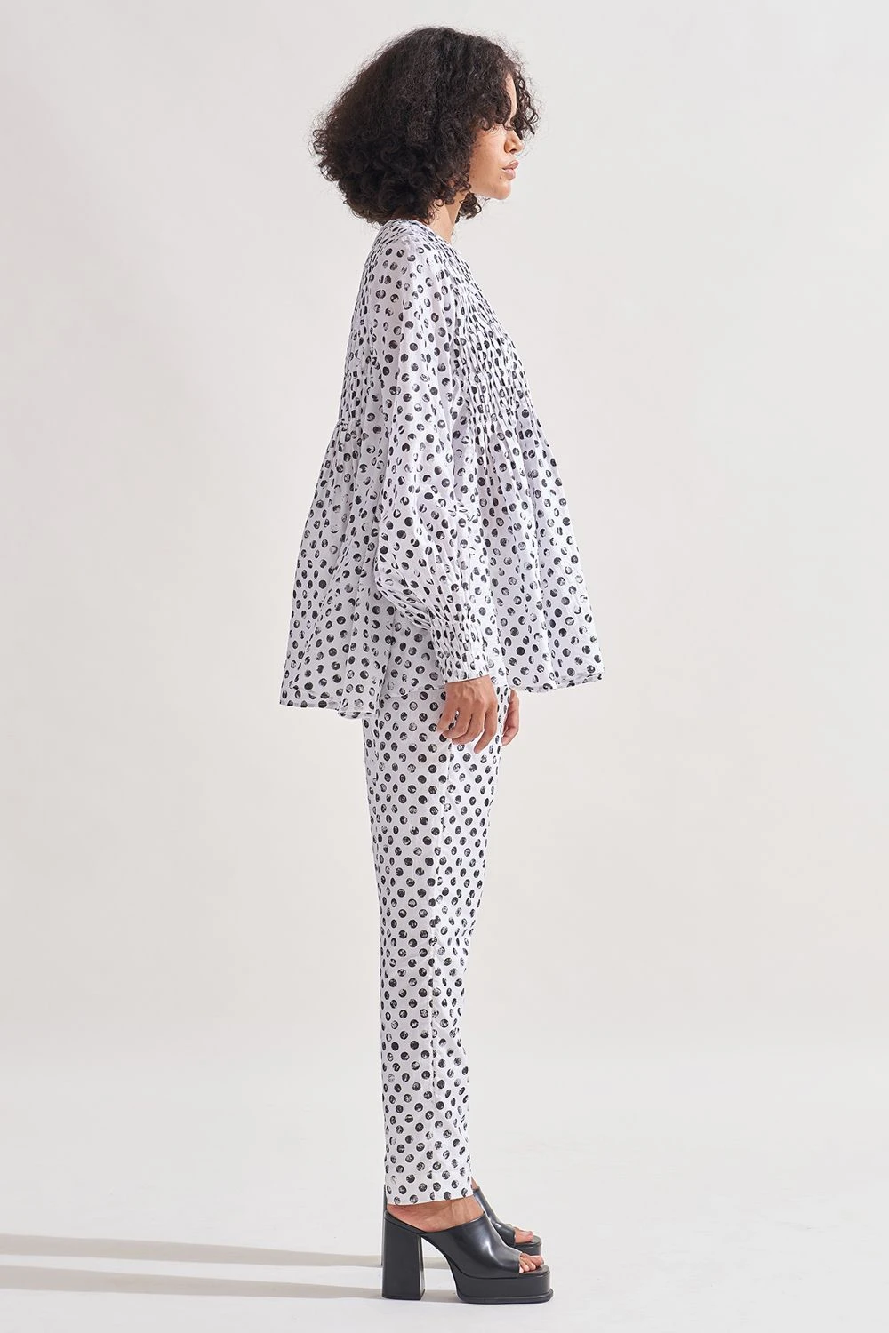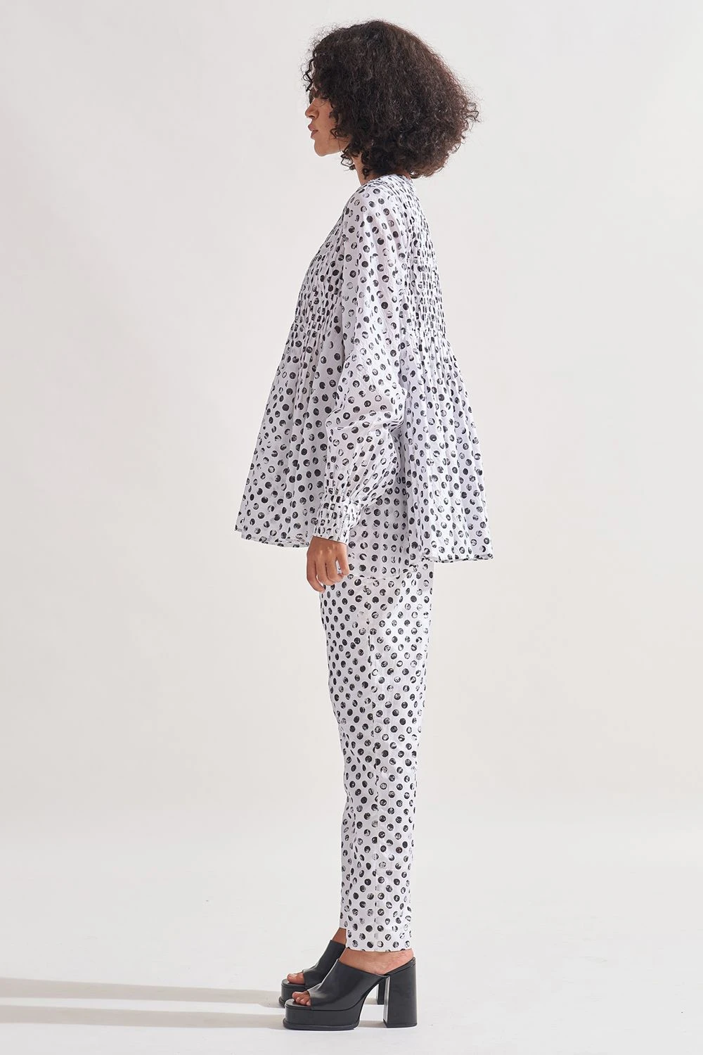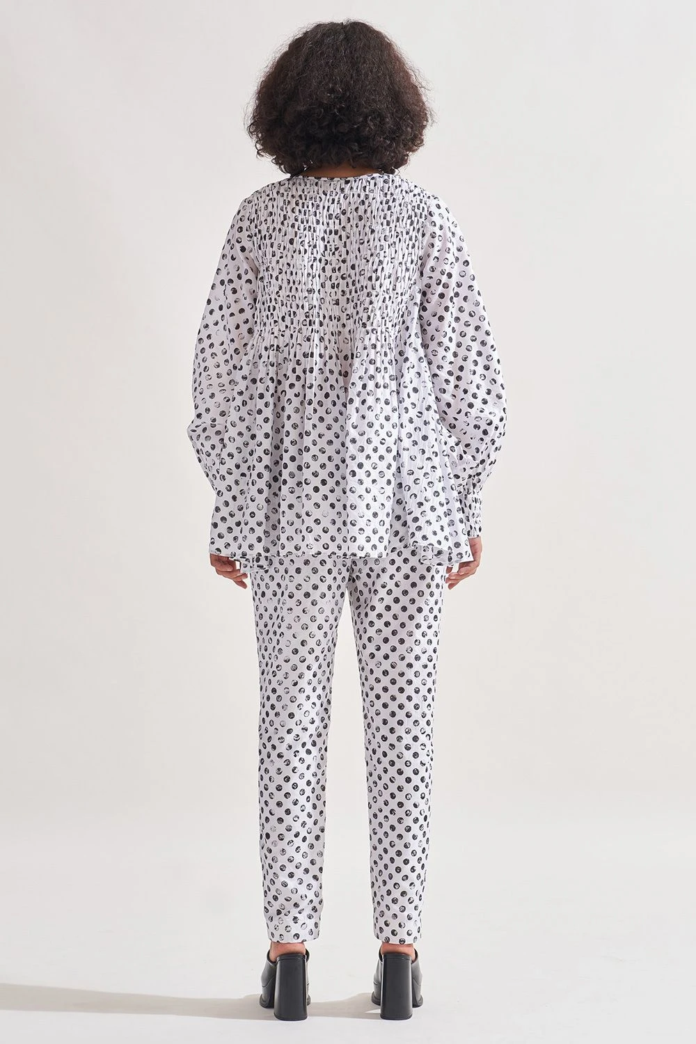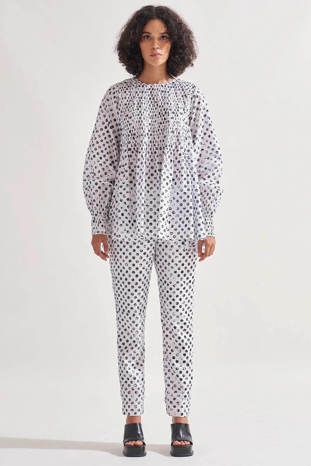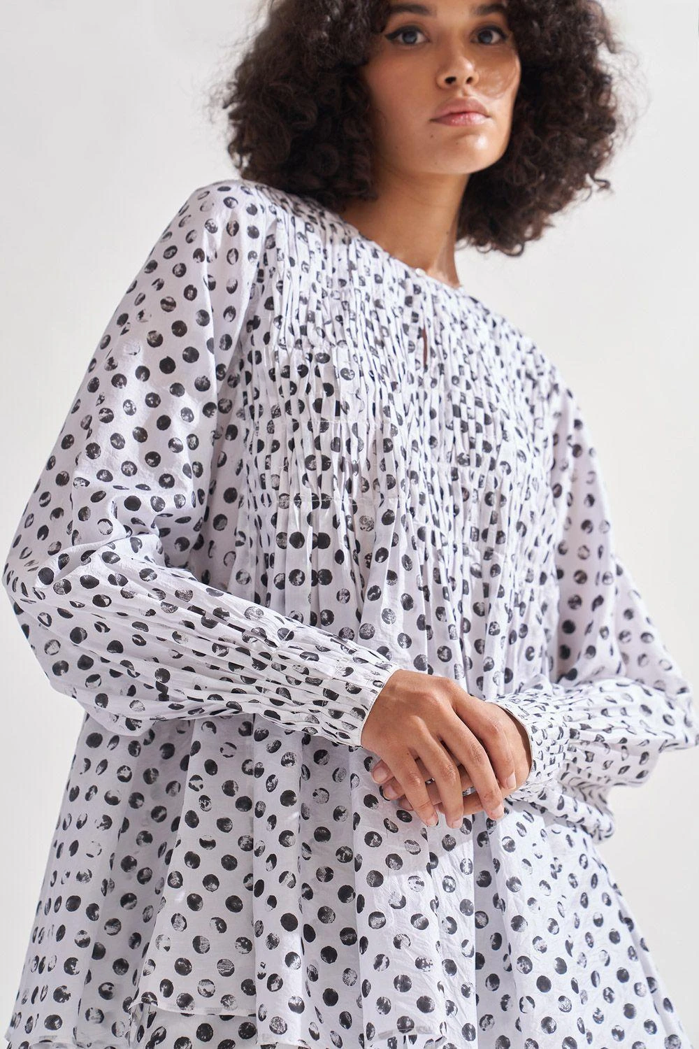 Immerse yourself in the understated elegance of this shirt. The hand-textured yoke with hand-stitch detail adds a touch of artistry. The round neck leads to a single button & loop fastened opening & the sleeves end in hand-pleated button-down cuffs.