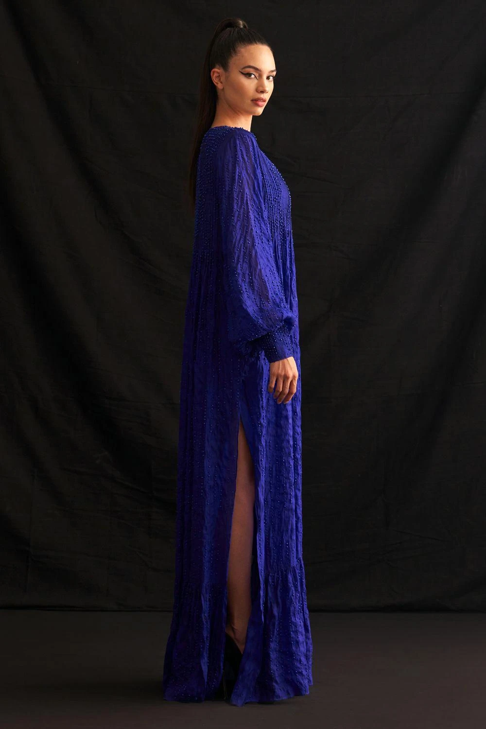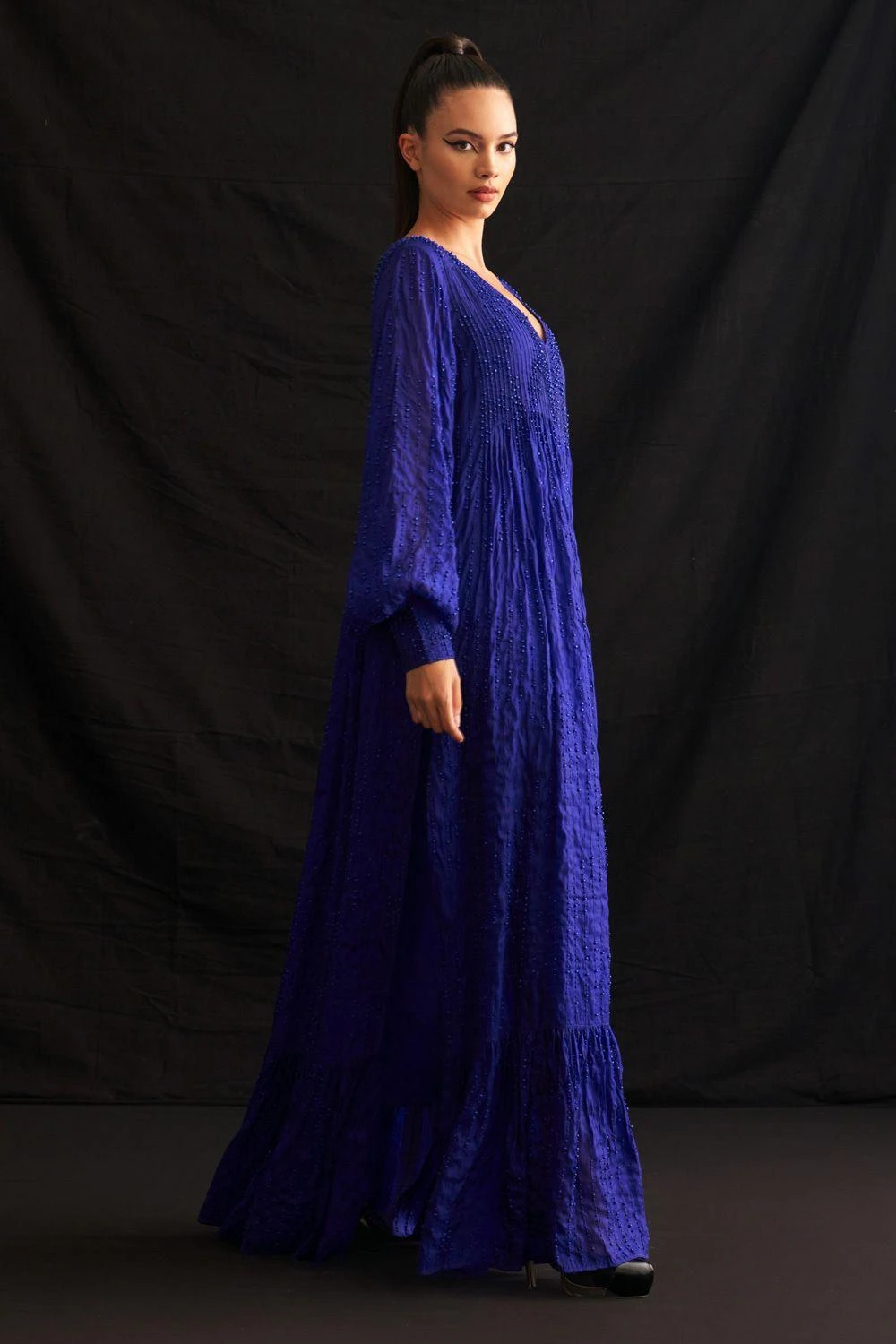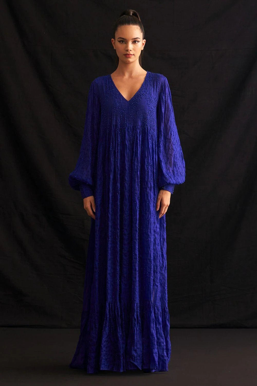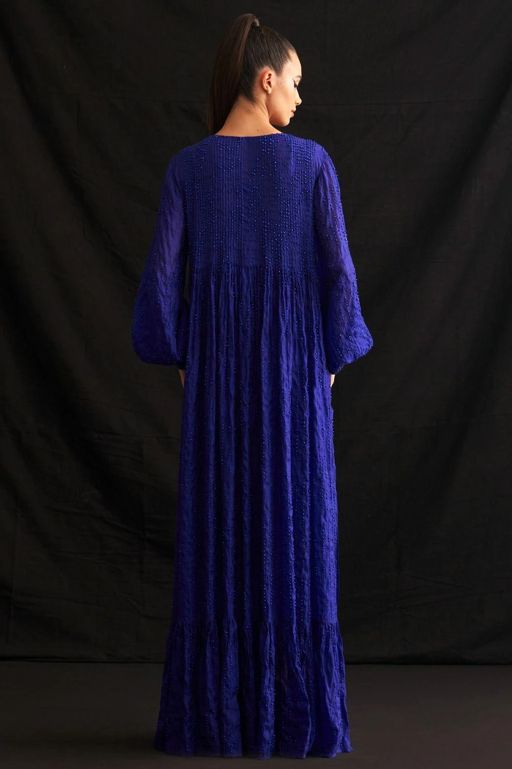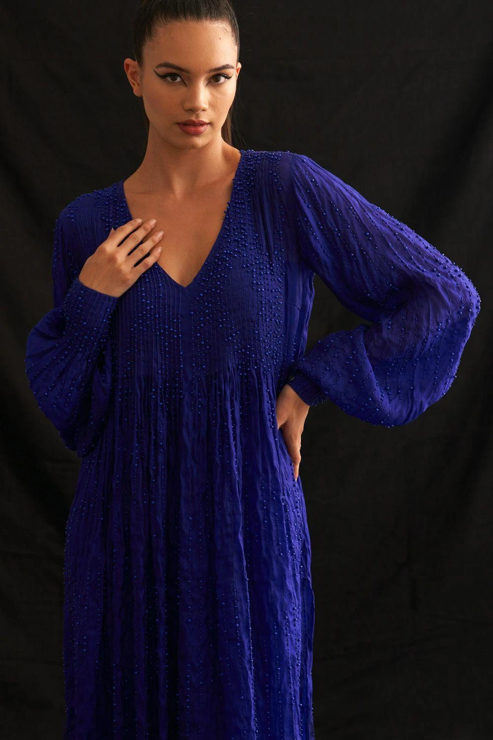 Elevate your style with this hand-woven silk pleated yoke dress adorned with exquisite hand-embroidered glass beads. Add a pair of dangler earrings to complete the look.