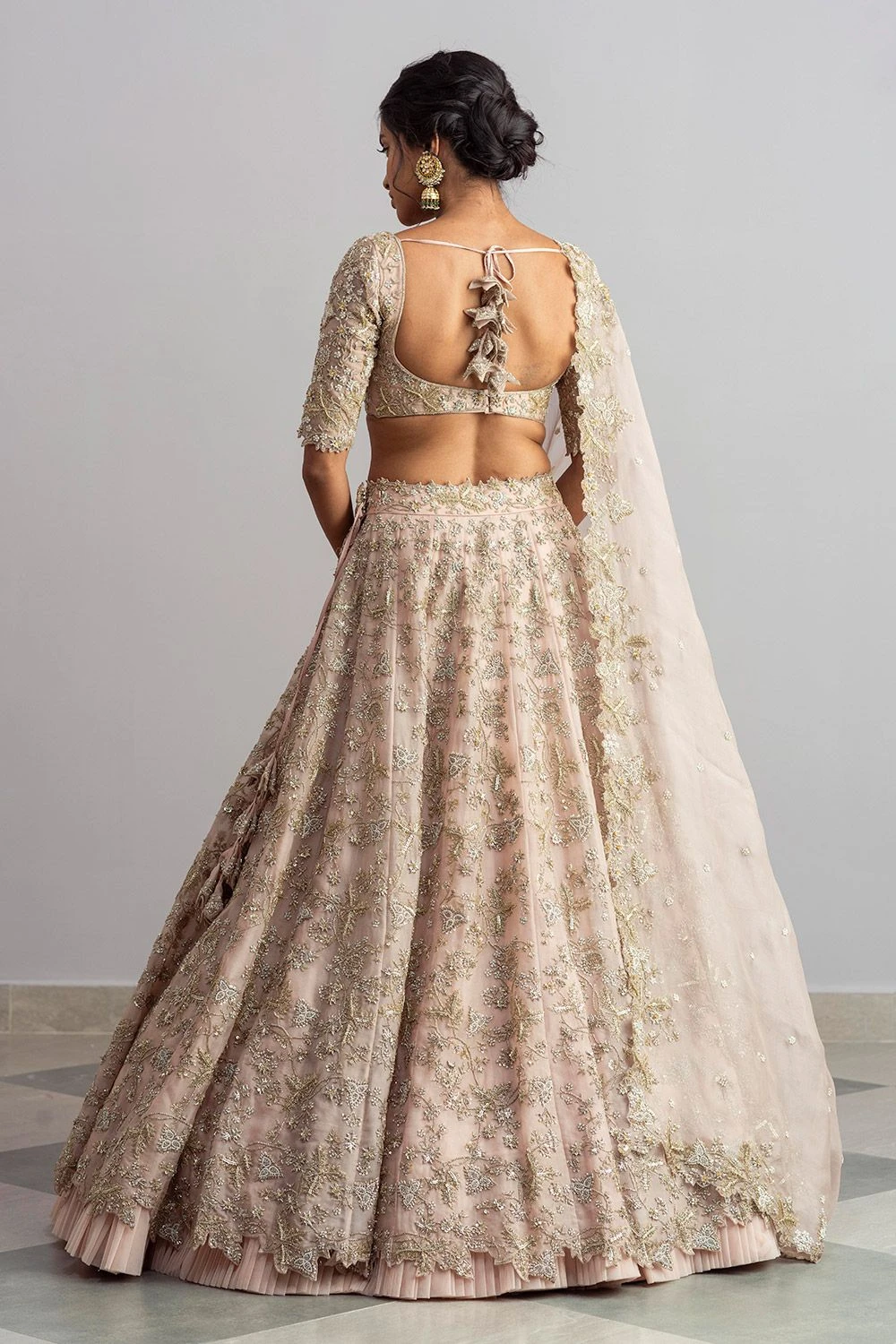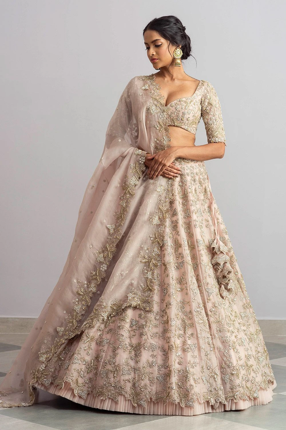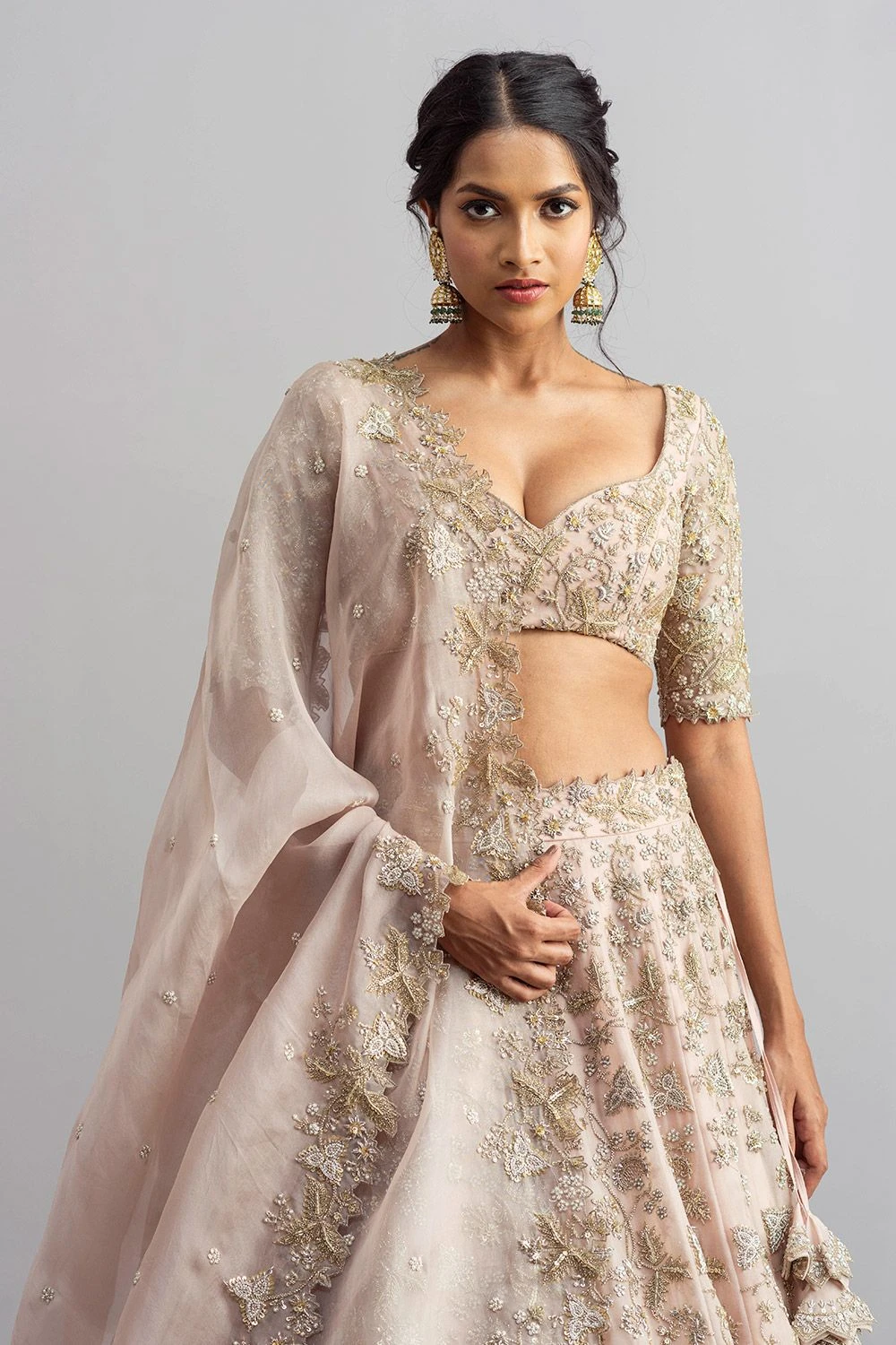 This champagne lehenga set exudes exuberance with every bit. It is made in organza base and adorned with heavy zardosi & cutdana jaal embroidery. You can wear it with a timeless polki necklace with this look.