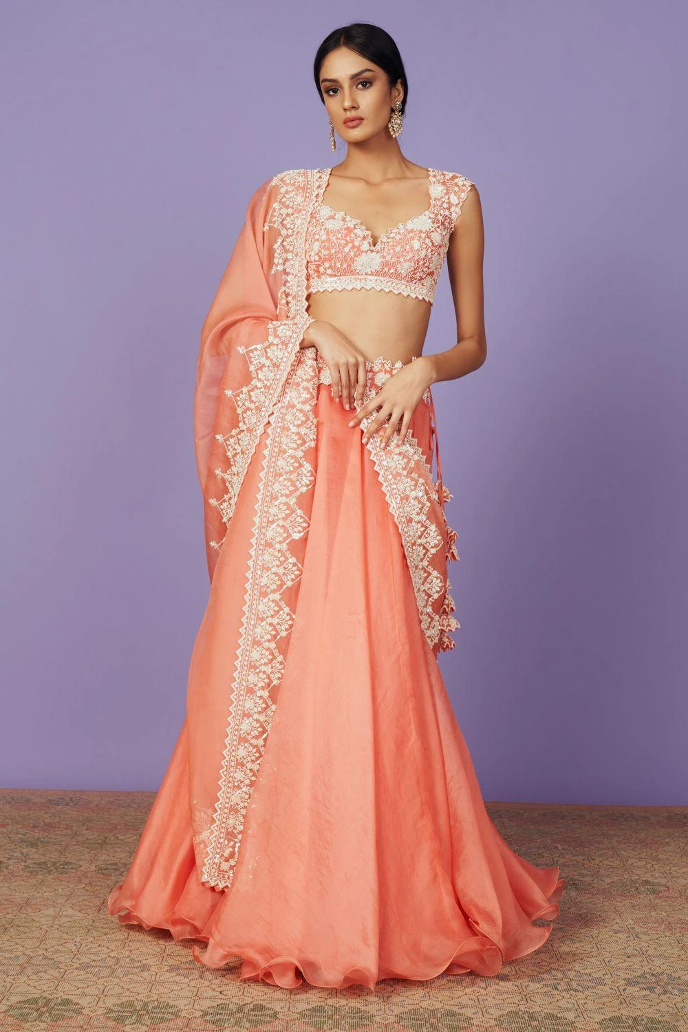 Elevate your elegance with this coral lehenga set, an embodiment of grace and sophistication. The subtle charm of champagne combined with intricate design makes it a timeless ensemble.