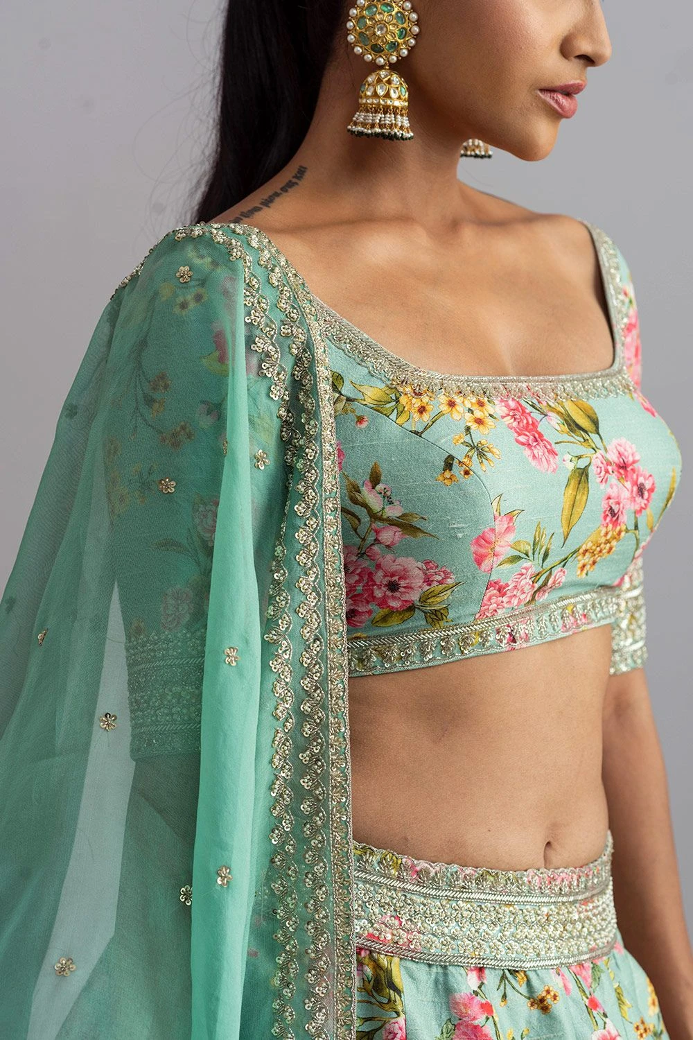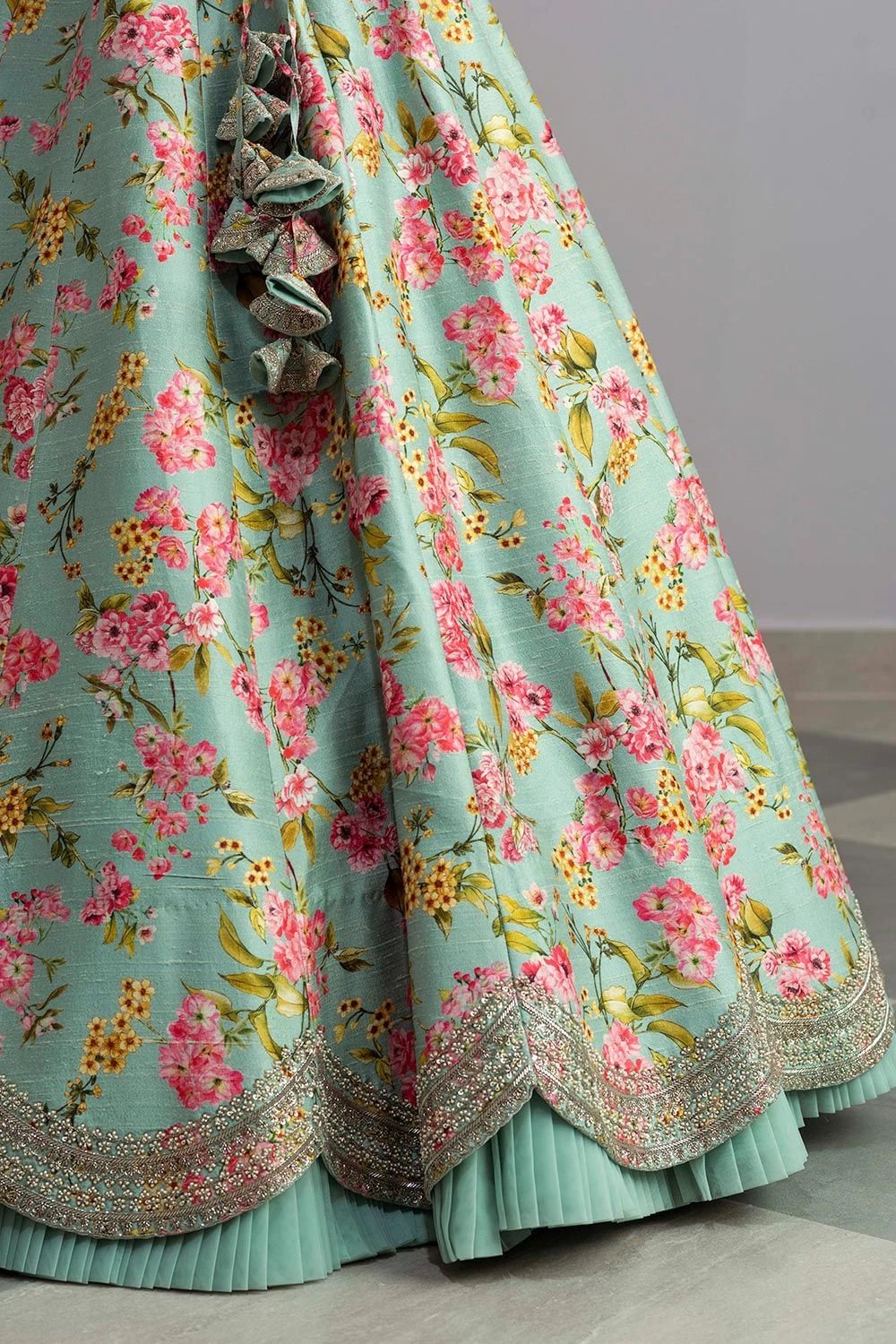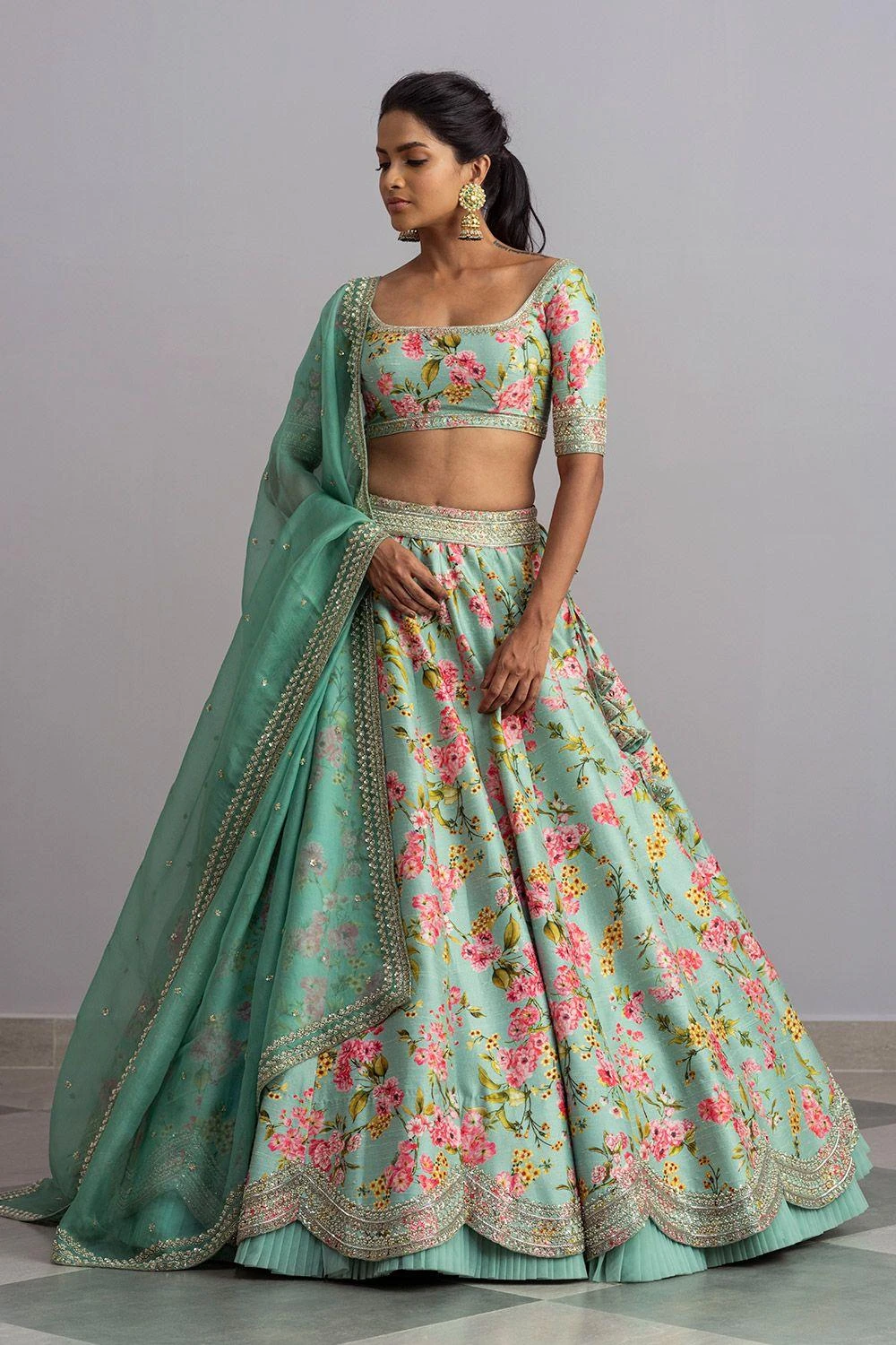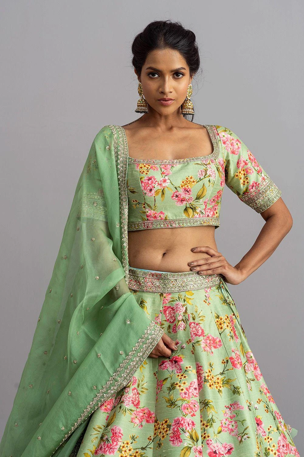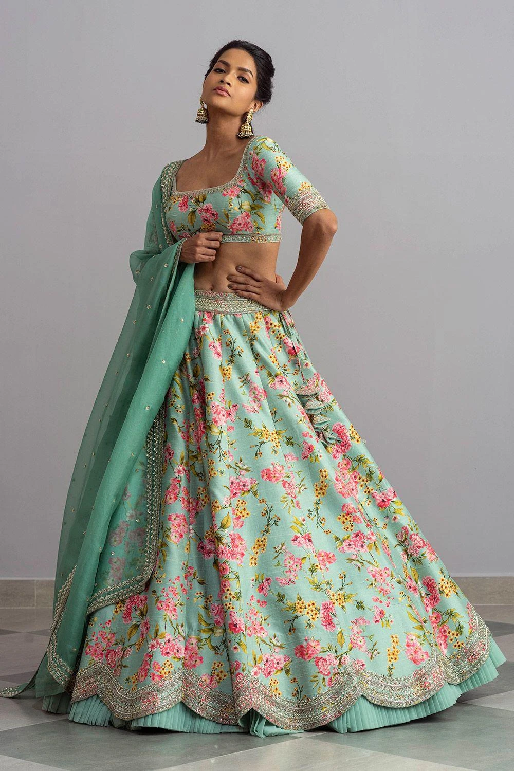 The impeccable details & mesmerising palette of this lehenga set will surely add finesse to your wedding trousseau. It is made in luxe raw silk base and adorned with cutdana embroidery. You can wear it with a jadau polki necklace.