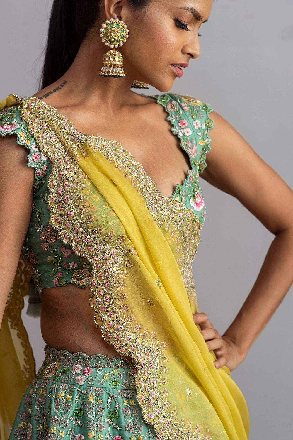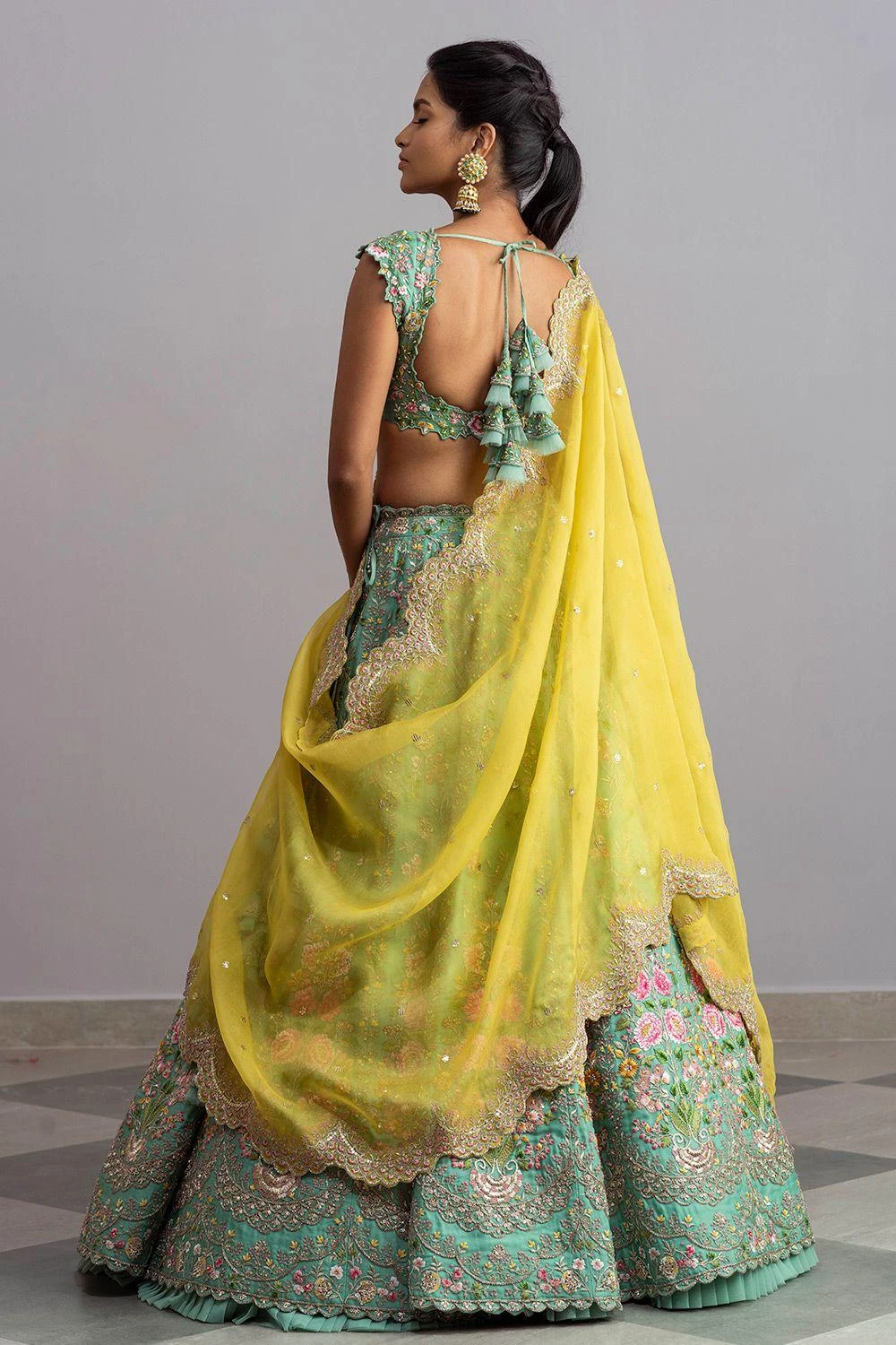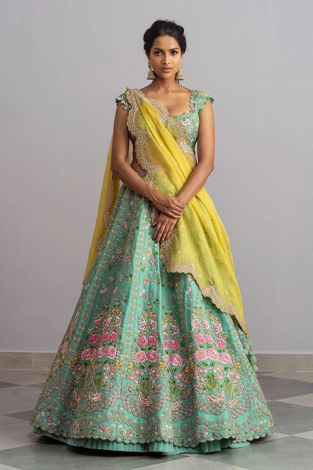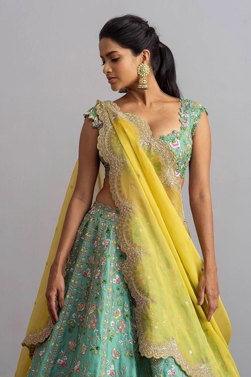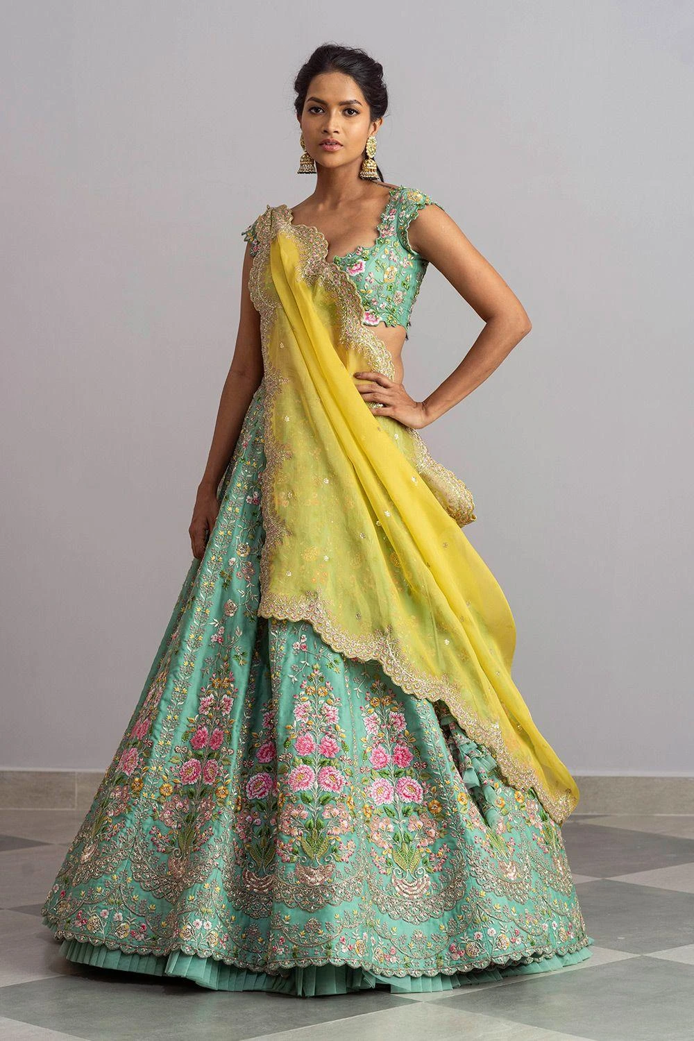 You can never go wrong with intricate embroidery details & classic silhouettes. This sea green embroidered lehenga set is made in organza base and adorned with intricate thread work embroidery. It is complemented with a yellow organza dupatta.
