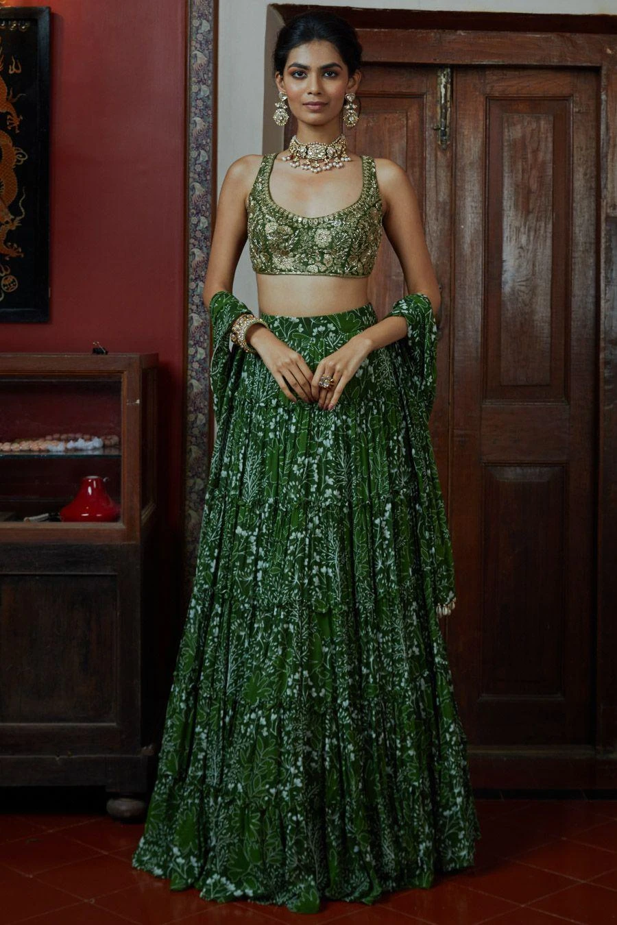 Make an exceptionally stylish wedding guest at your next destination wedding in this lehenga set. It features a garden print tiered skirt with a hand embroidered blouse & dupatta. Accessorize it with a pair of dangler earrings to complete the look.