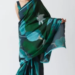 This flirty kama blouse will add the perfect amount of boho glam to your festive looks. It is cut in a raw silk base and highlighted with cowry shells on the edges. Pair it with a drape sari from the collection.