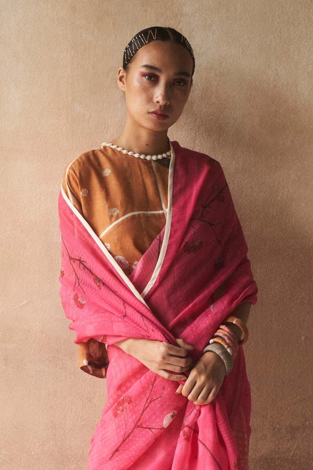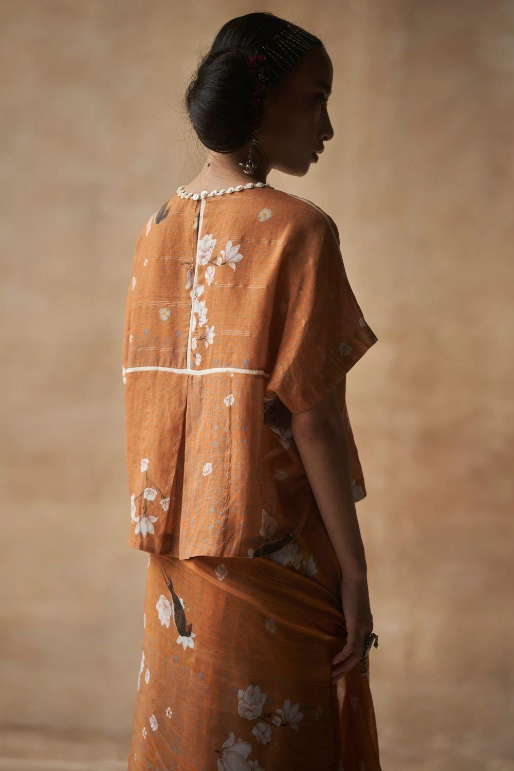 This floral print orange blouse will perfectly complement your saris. It is woven in breathable cotton linen fabric & accented with mogra inserts & mother of pearl details. You can style this piece with a pair of pants or skirt as well.