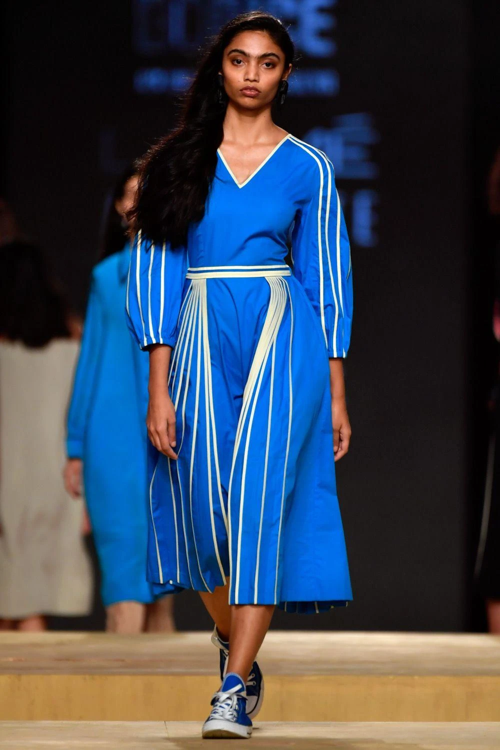 This eclectic cobalt blue dress is set in 100% cotton poplin. It features a cinched waist with multi-binding pleating details down the waist & and on the sleeves. Style this piece with a pair of chic gold hoops & block heels for a formal lunch.