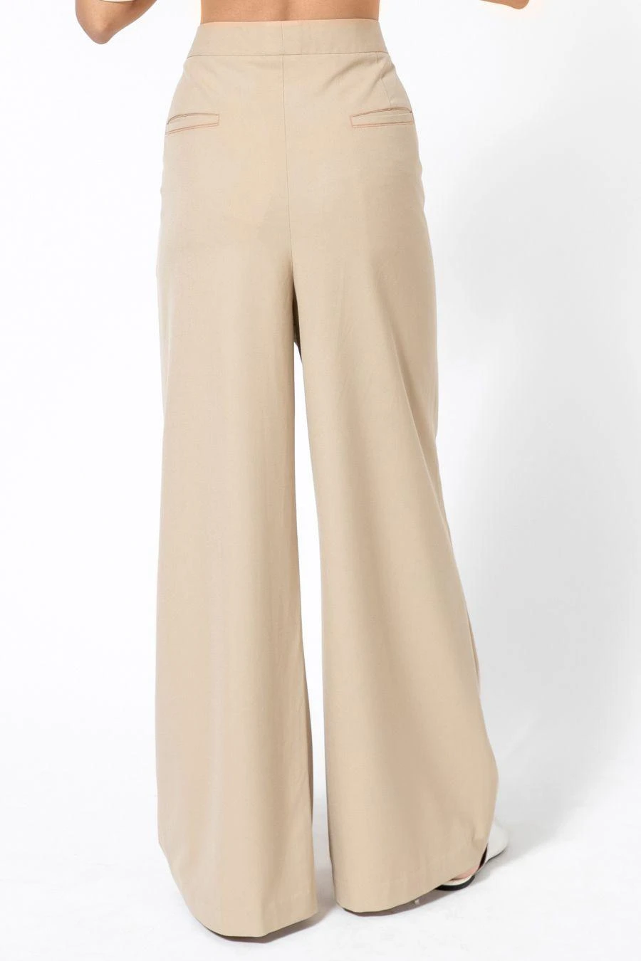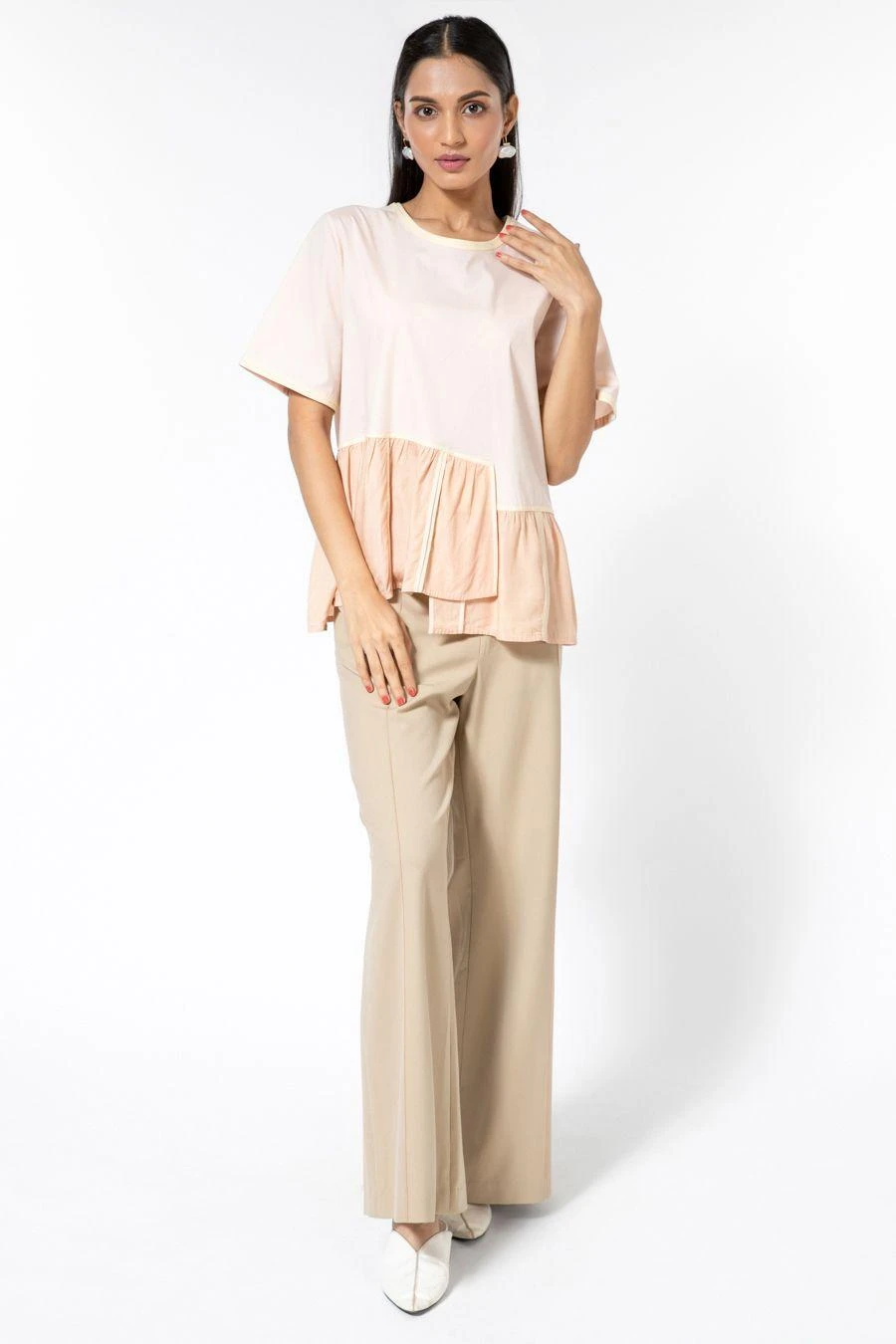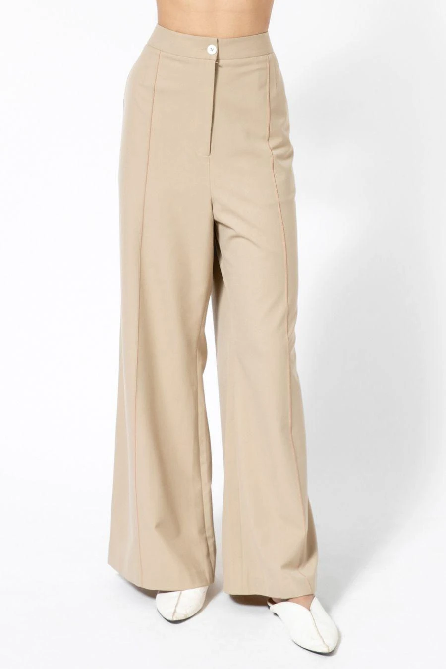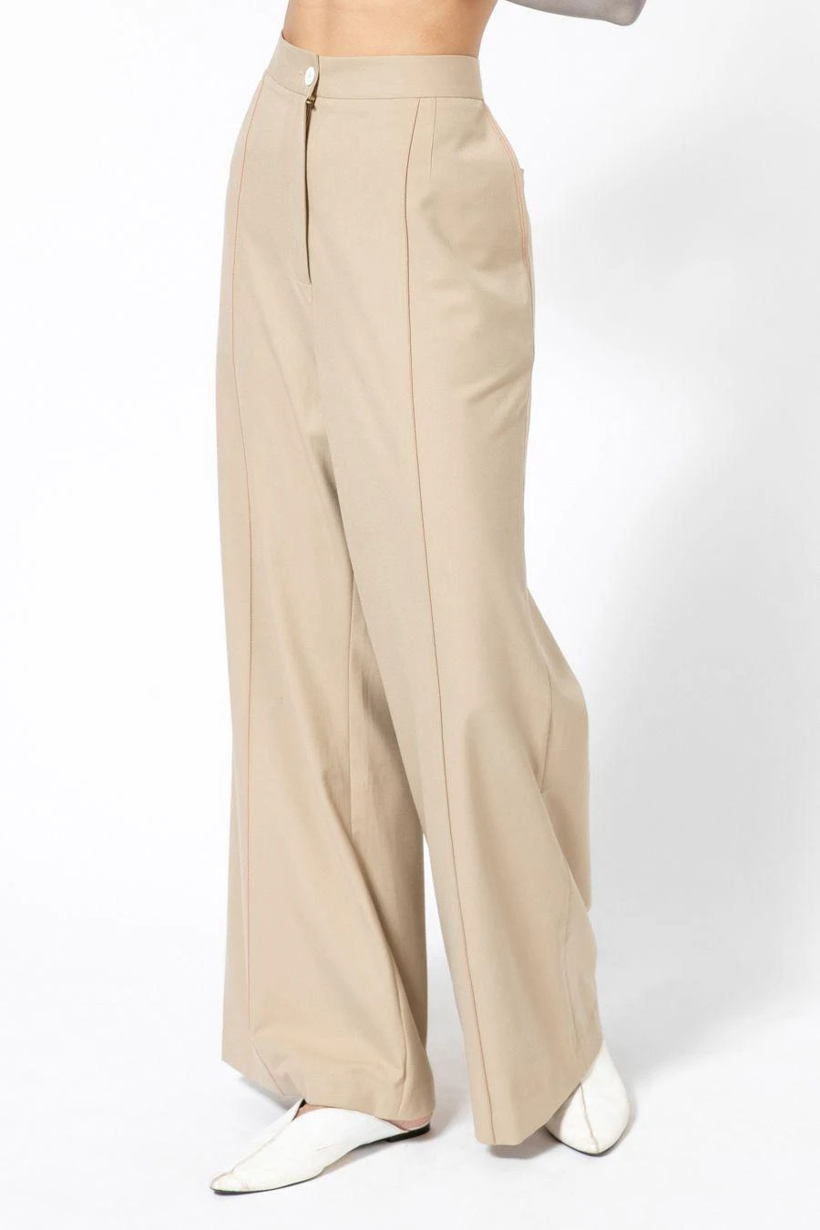 Sharply tailored, these classic high waisted ecru trousers come with pockets on both sides. Style it with a pleated and multi binded shirt from the collection to complete the set.