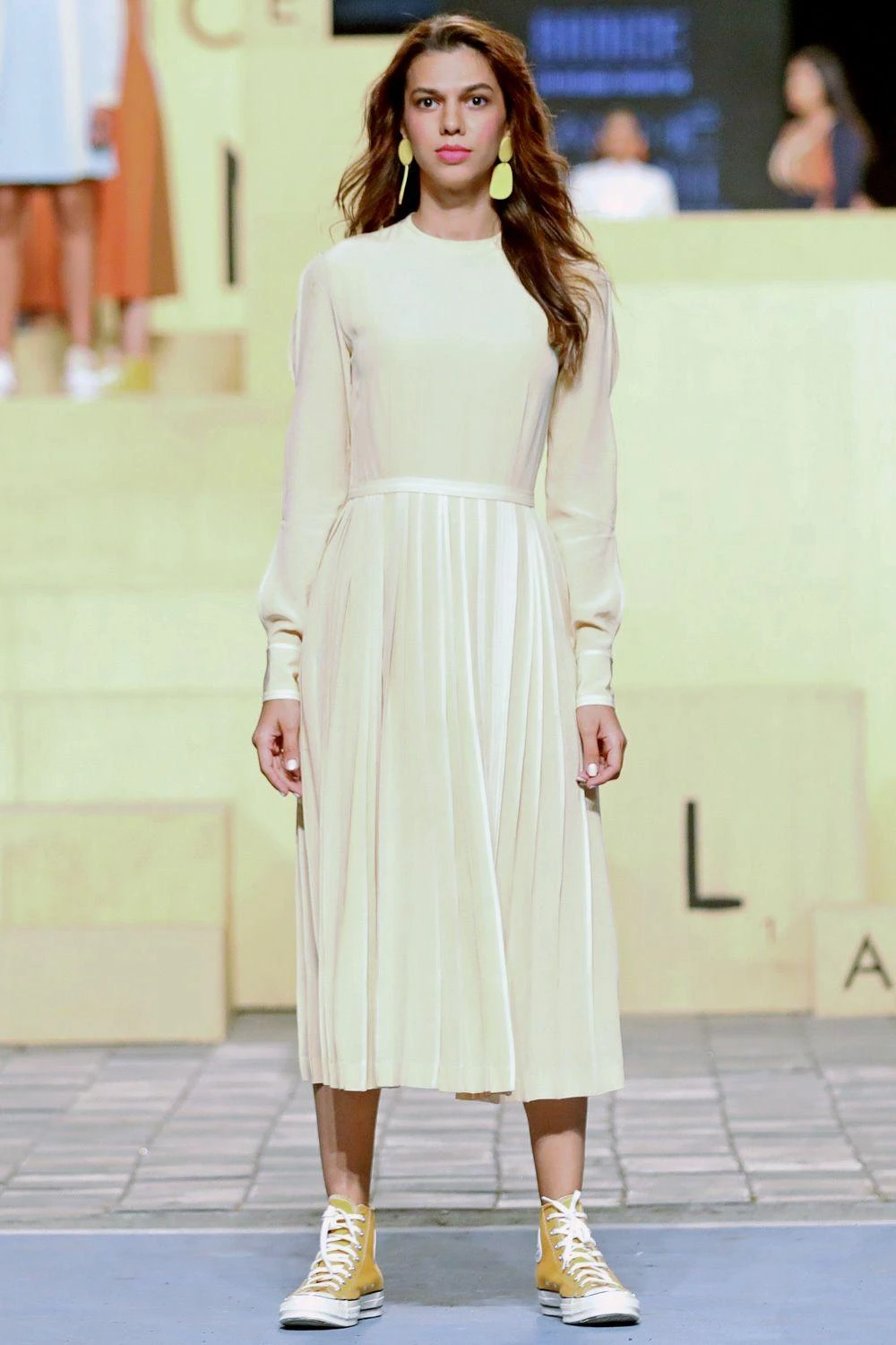 This elegant fit & flare silk dress has an intricately pleated skirt. This dreamy piece can be styled with oversized pearl earrings & a jewel toned handbag for a chic look.