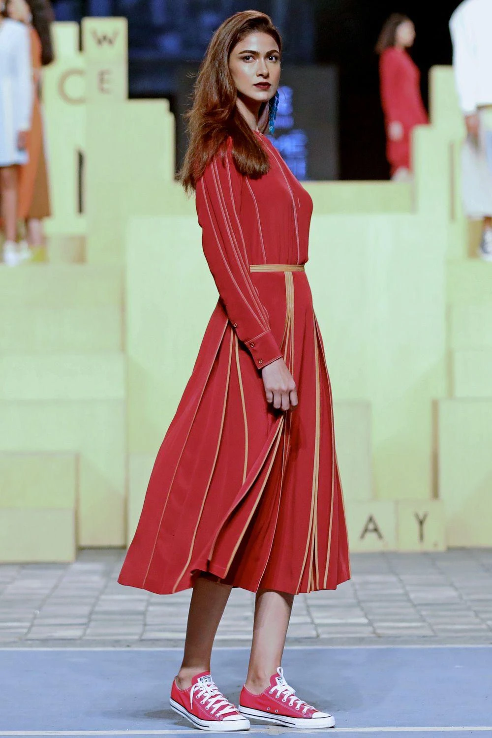 This stylish rouge coloured silk crepe skirt is pleated with a contrast binding. Style it with the matching top as a stylish co ord set. Accessorize this look with pearl stud earrings & ballet flats for an effortlessly elegant look.