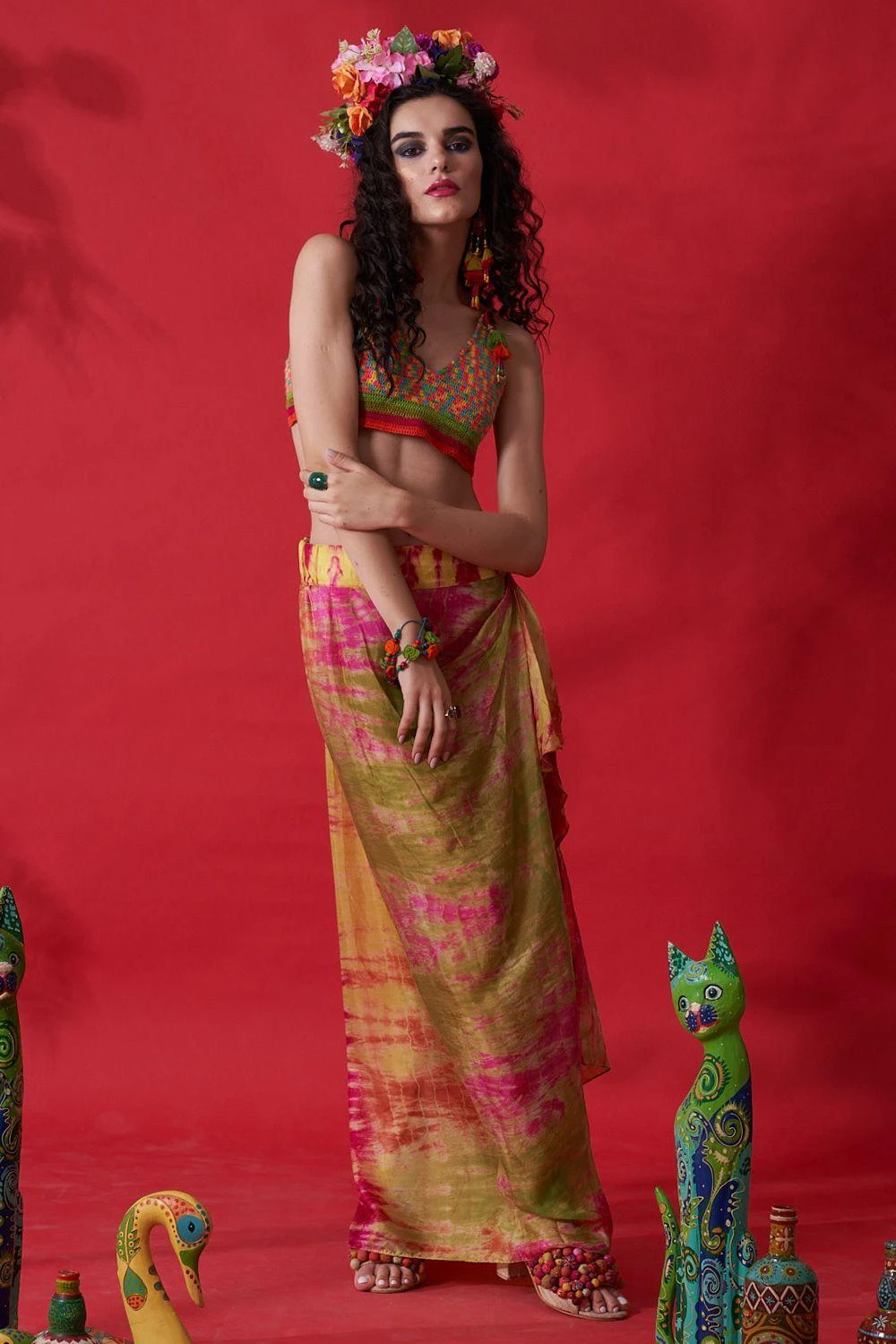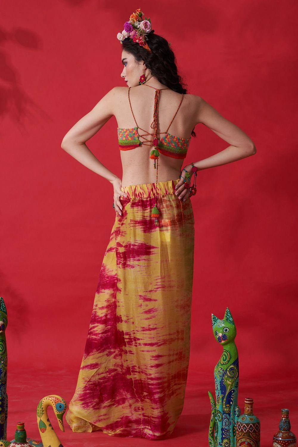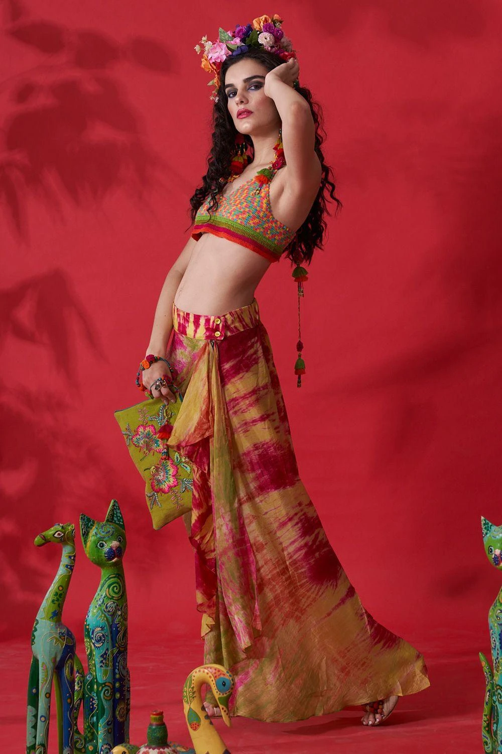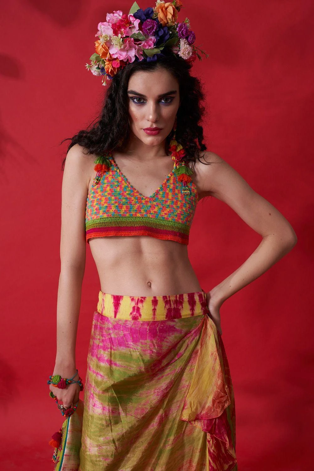 Add a layer of glamour and statement style to resort getaways with this top. It features dori string and tassel details with thread work embroidery. Style this exquisite piece with a draped skirt to complete the look.