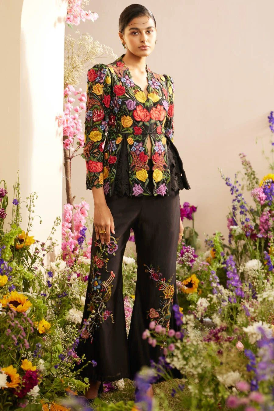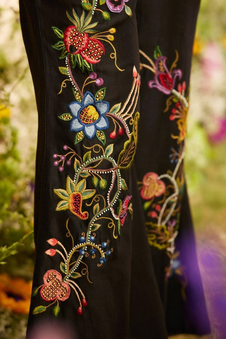 Crafted in chanderi, these bell bottoms feature threadwork details. Style them with the Black floral threadwork and cutwork jacket from the collection to complete the look.