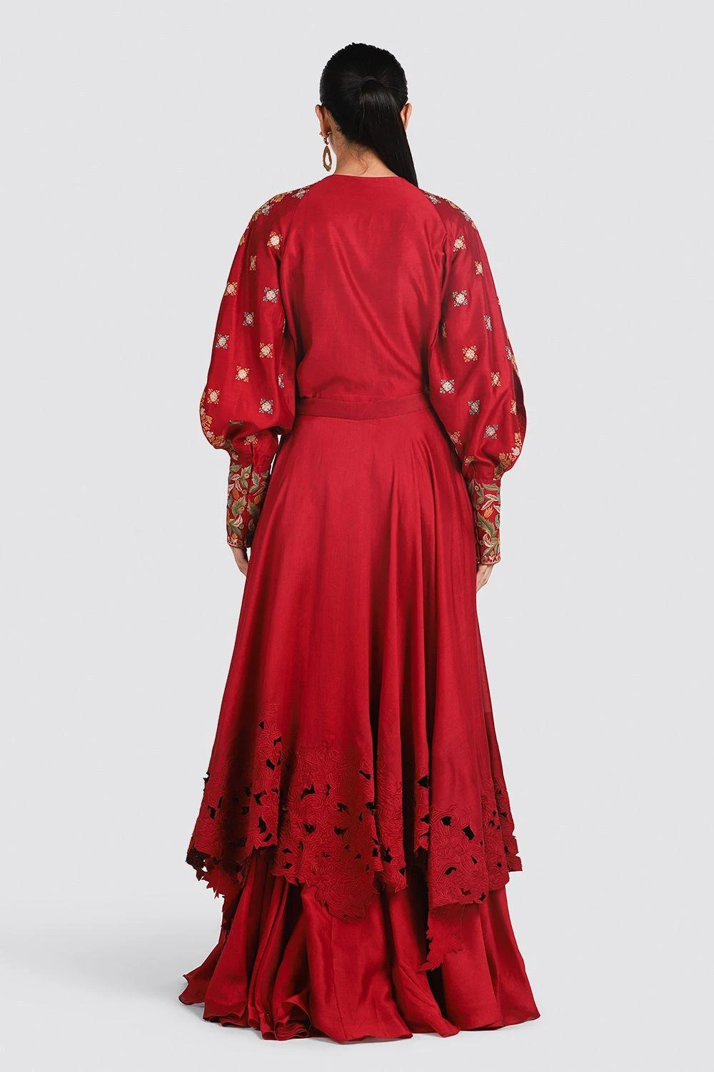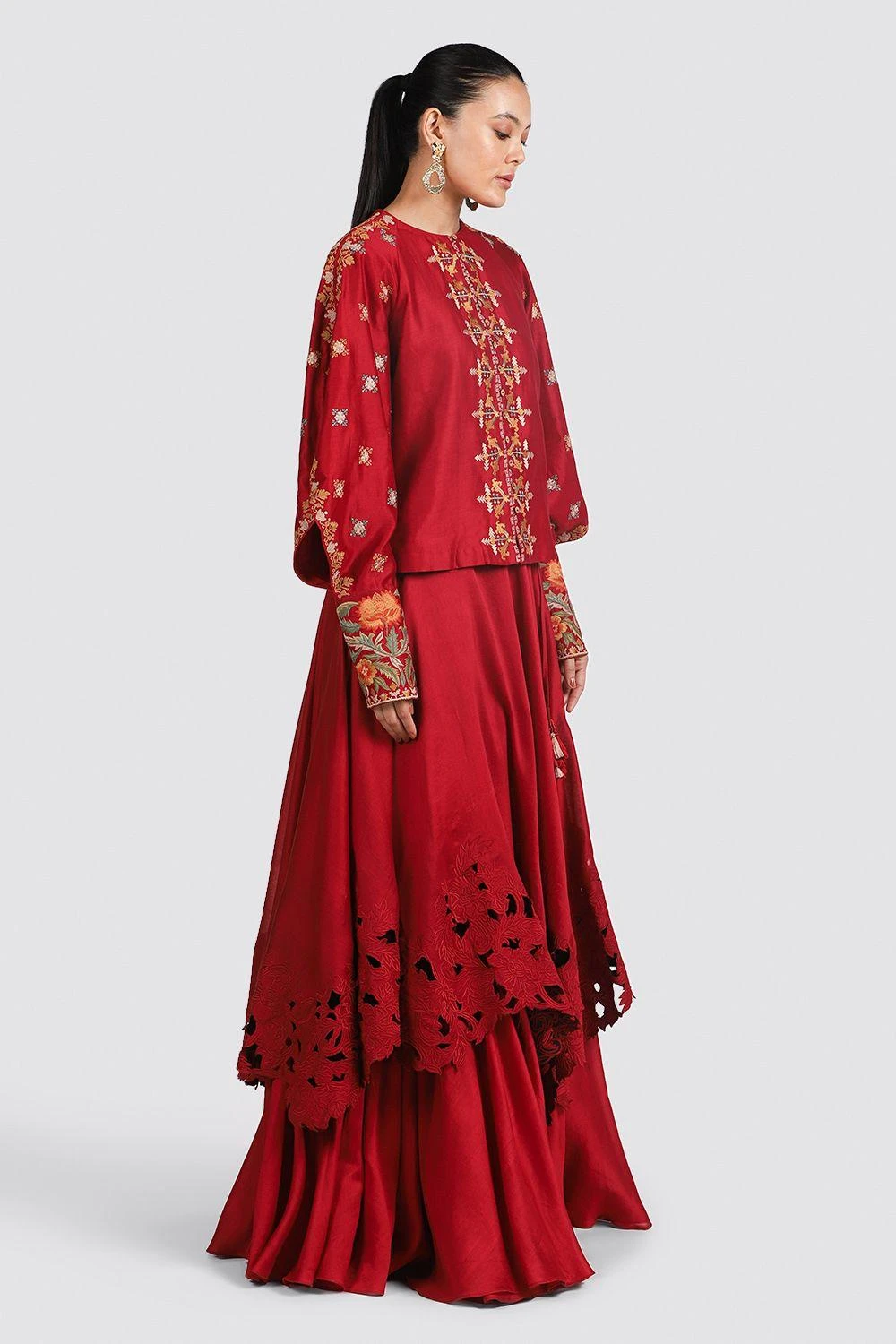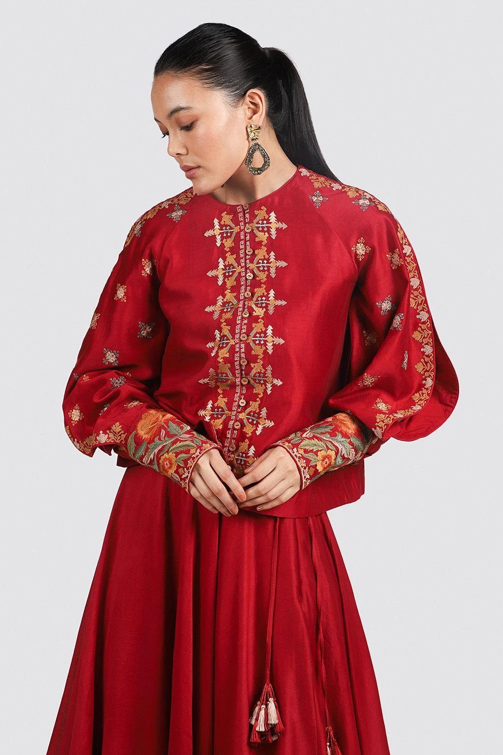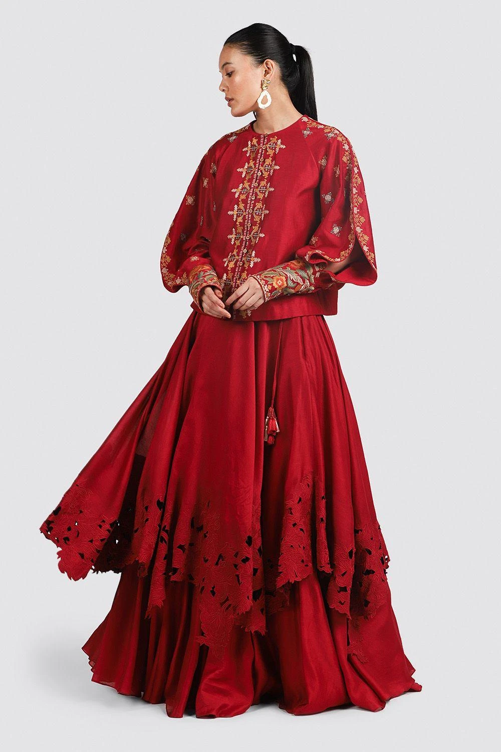 The raglan sleeves of this red chanderi top have an interesting slit down the sides. This top will look great on jeans or will be apt for a mehendi with the right skirt.