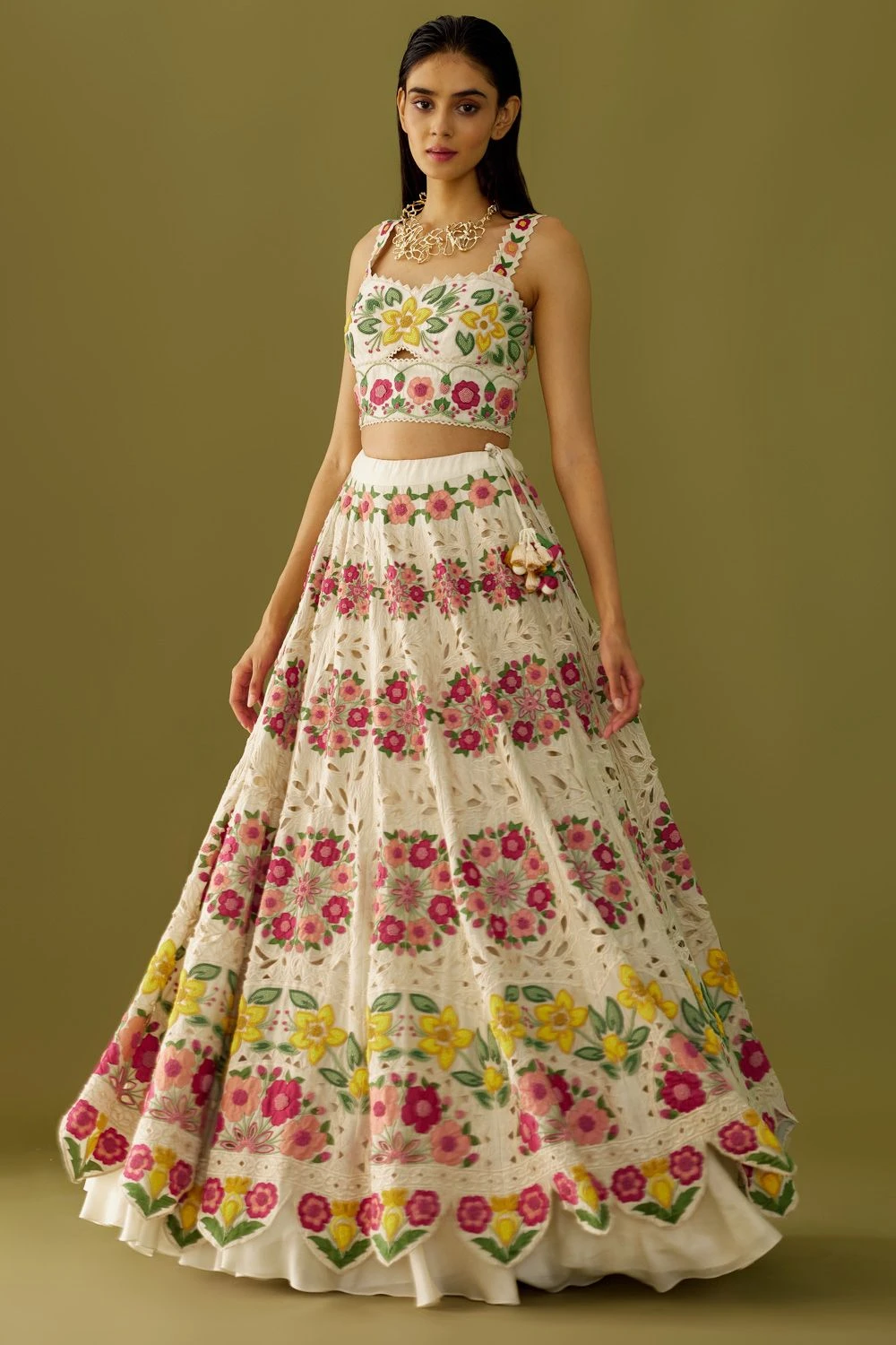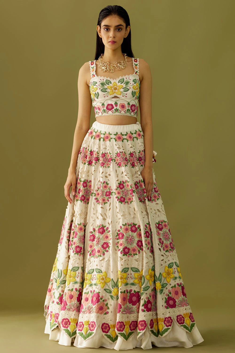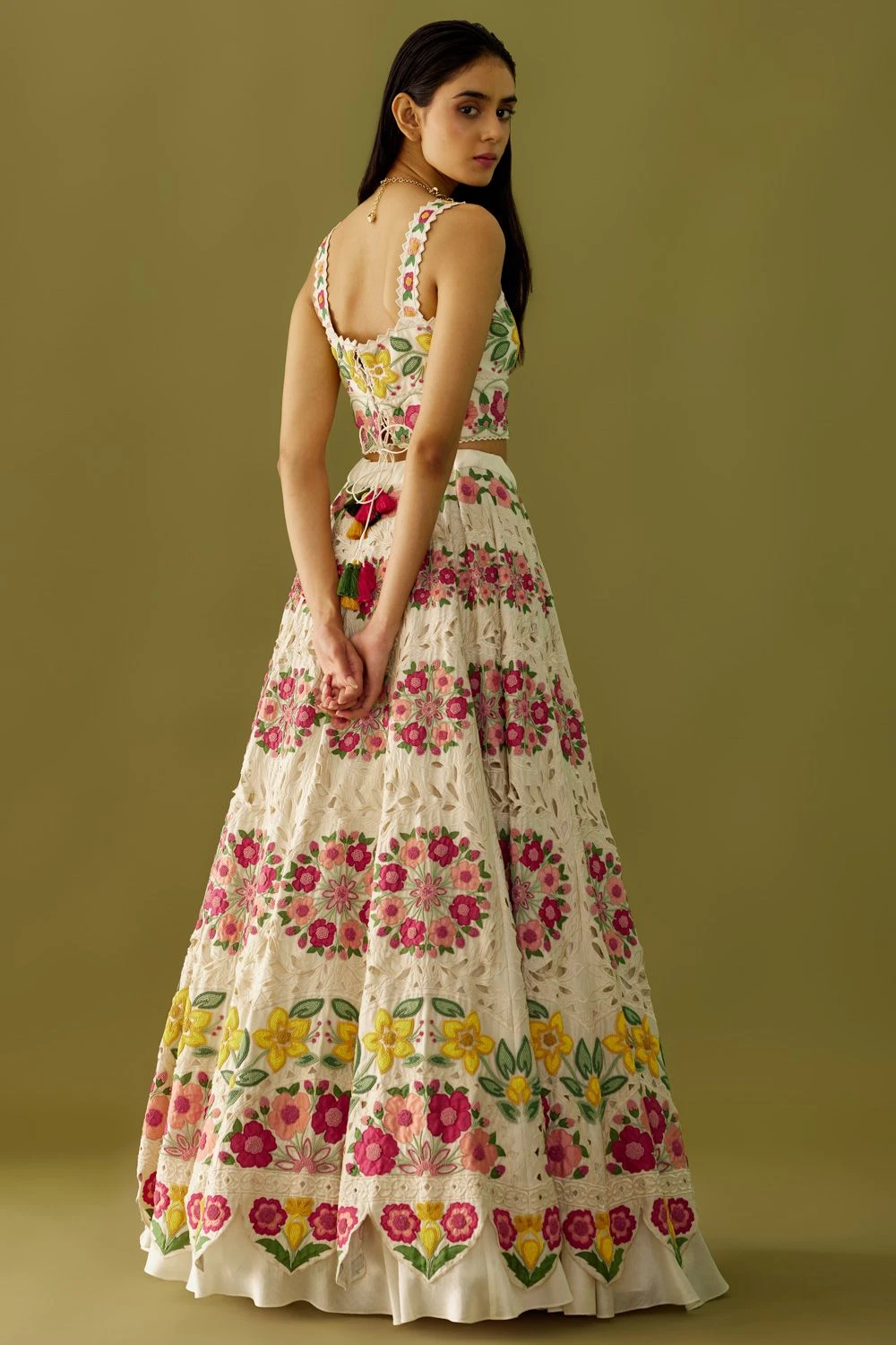 Maximise the life of your wardrobe with this exquisite bustier. Crafted in chanderi, this top features floral applique details all over. Style this bustier with a lehenga to complete the look.