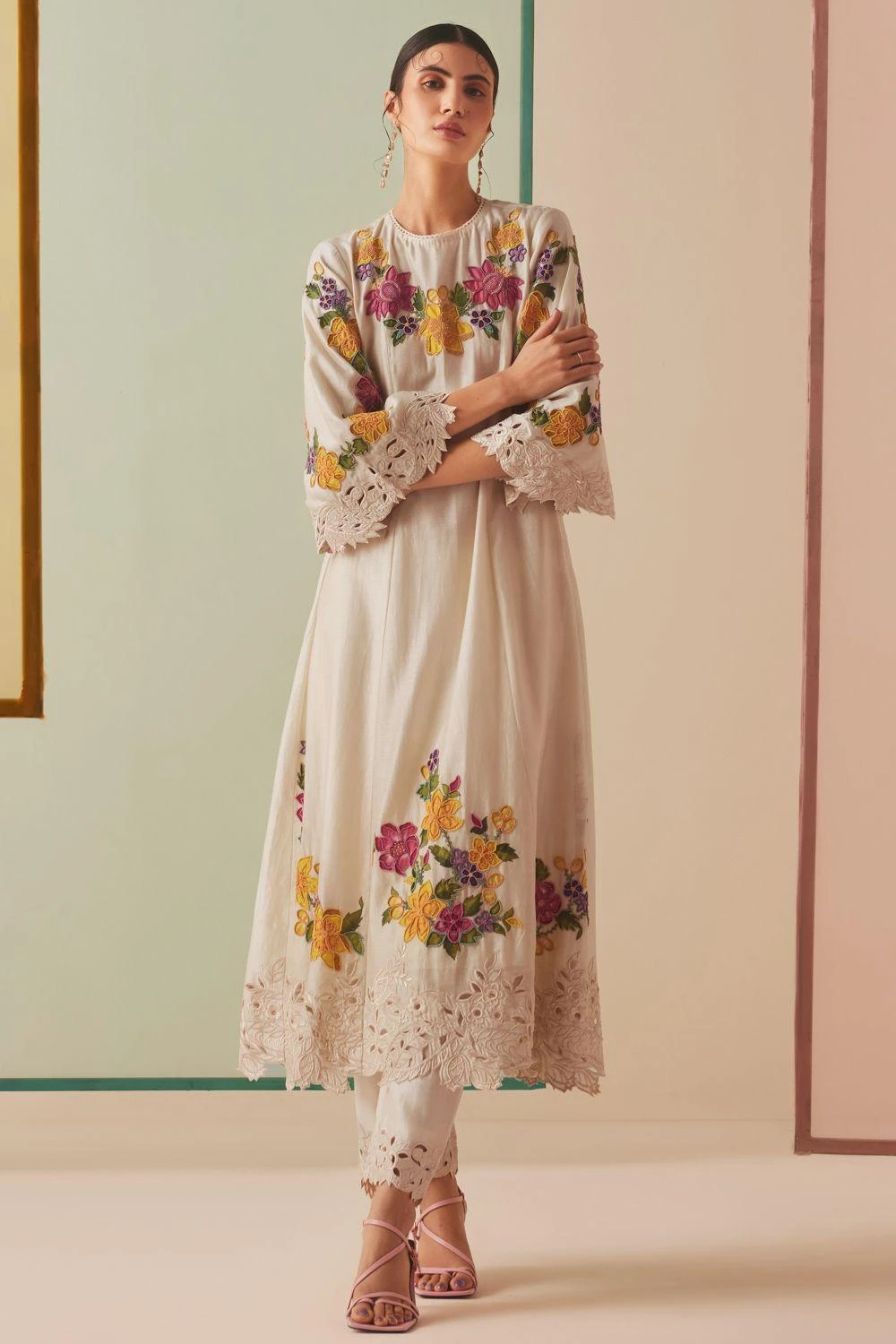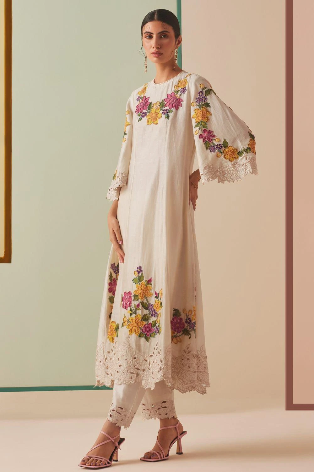 Indulge in sophistication with these chanderi pants. Enhanced by intricate and mesmerizing cutwork details, these pants redefine luxury. Elevate your wardrobe with this exquisite piece.