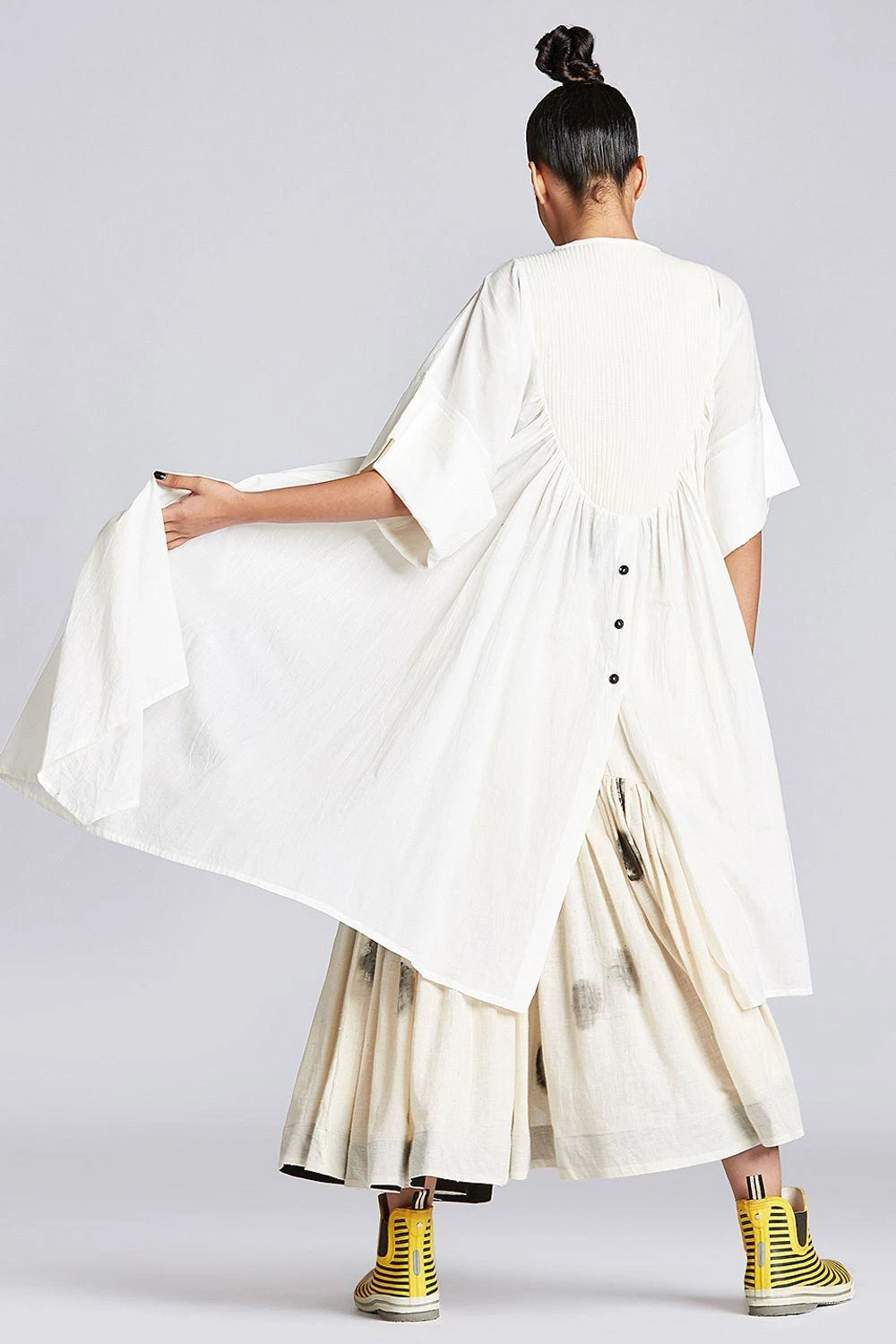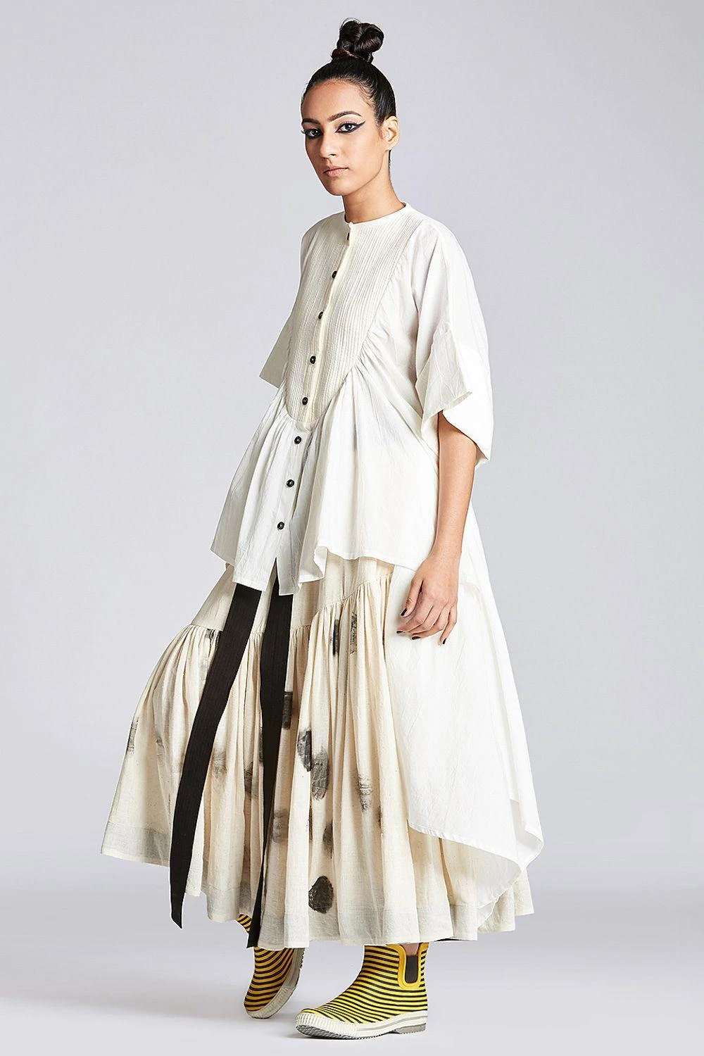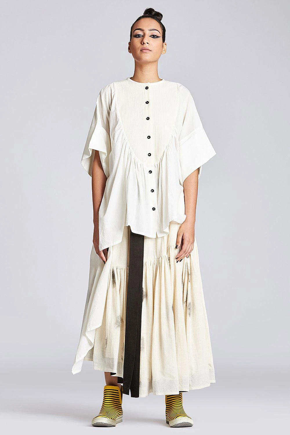Amp up your contemporary closet with this off-beat & edgy white asymmetric top. It is cut in organic cotton with drop shoulders & oval yoke with gathering details. Style it with a pair of linen pants or denims.