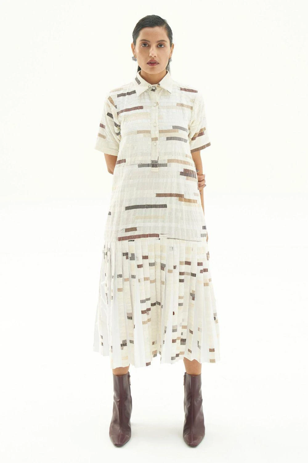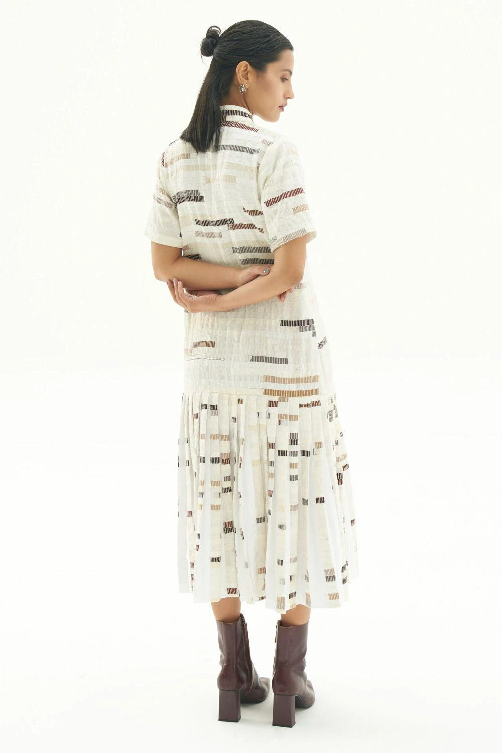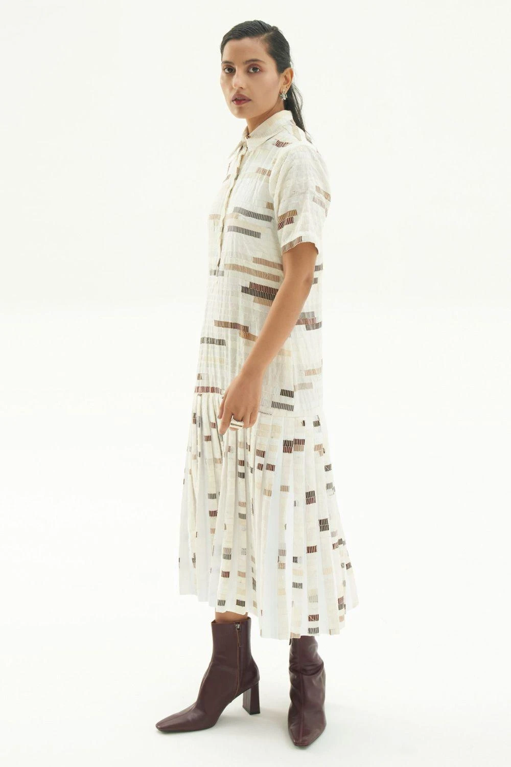 The shirt collar dress features a pleated panel detail at the bottom which elevates its classic silhouette. This dress is cut in an up-cycled handwoven fabric. Style this chic piece for dressy daytime events.