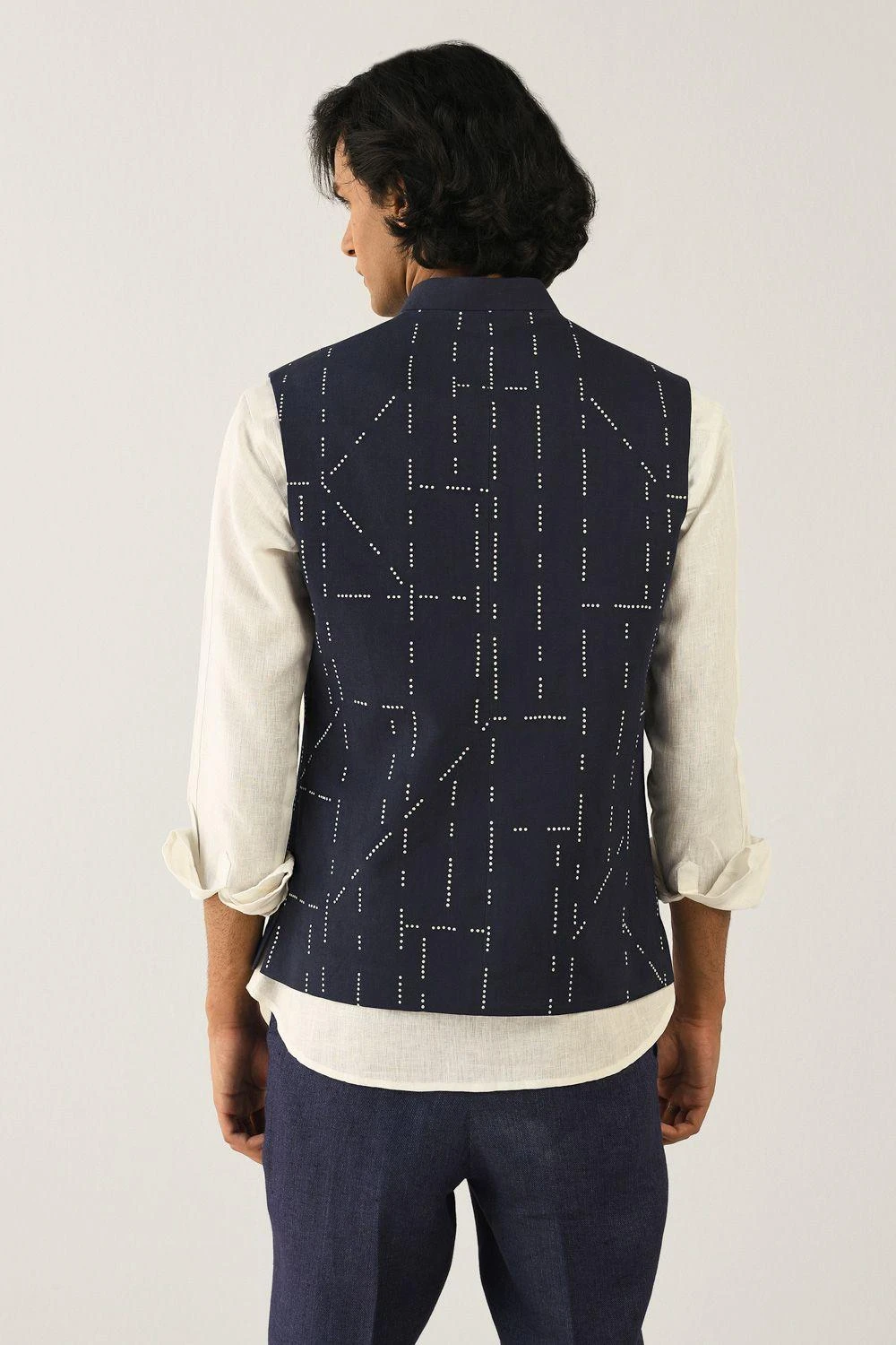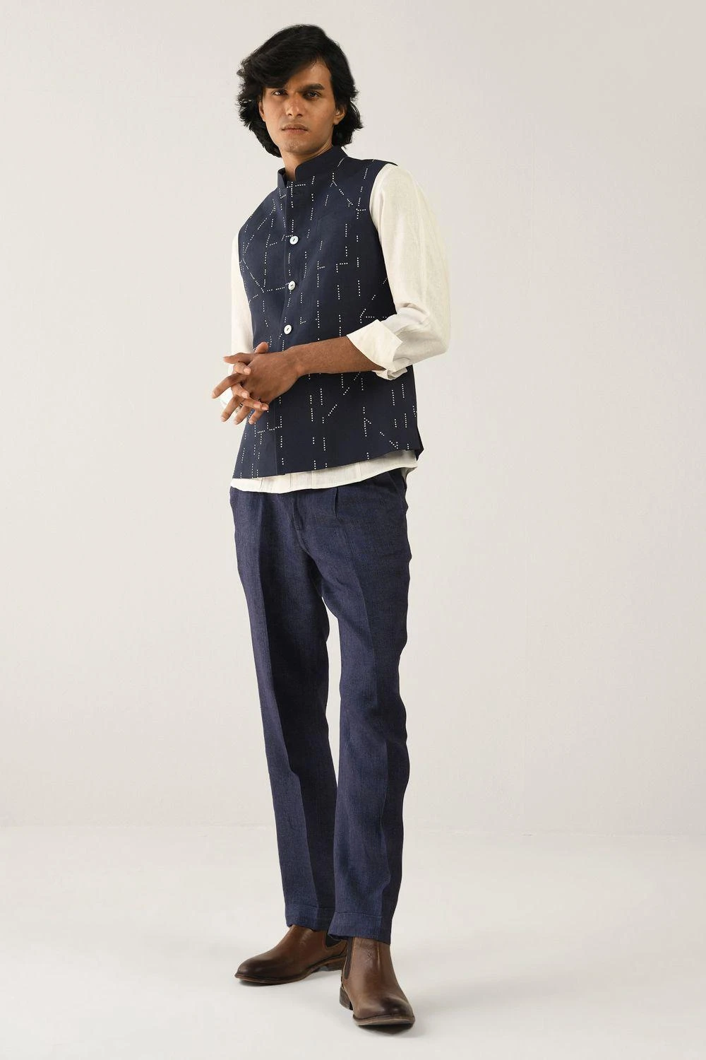 Update your occasion wear with this stylish navy blue bundi jacket. It is woven in linen cotton fabric & enhanced with hand embroidery. Style it with your formal wear or over a kurta.