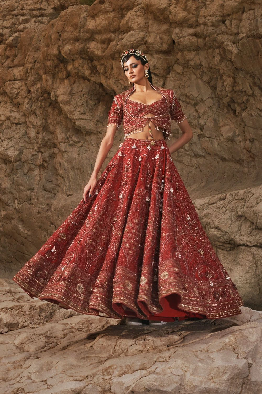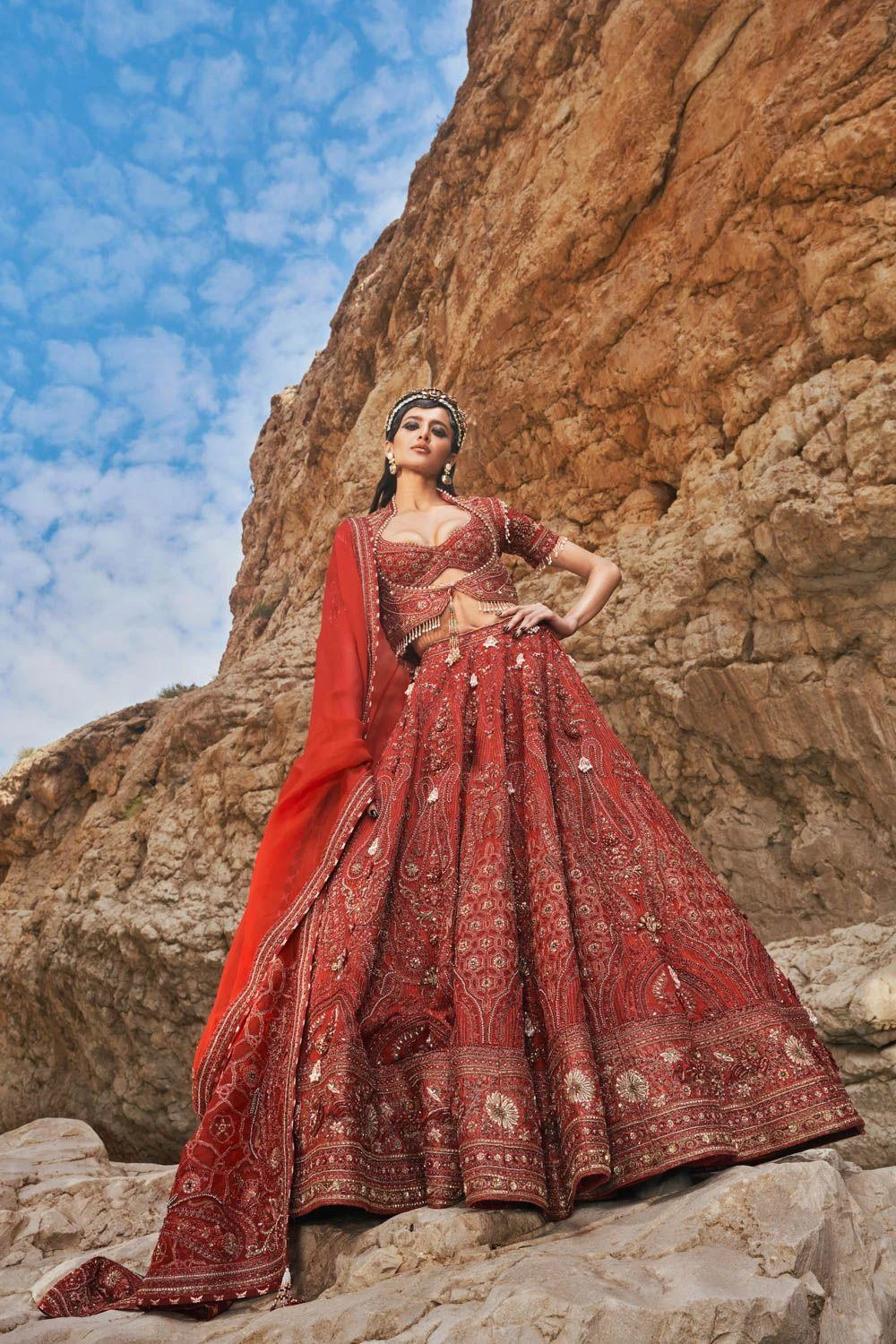 This burgundy lehenga speaks of grandiose & royalty. Crafted in silk organza & tulle, this set features a lehenga embroidered with 3-D floral motifs paired with an equally versatile blouse and a dupatta embellished with resham threads, dori work.