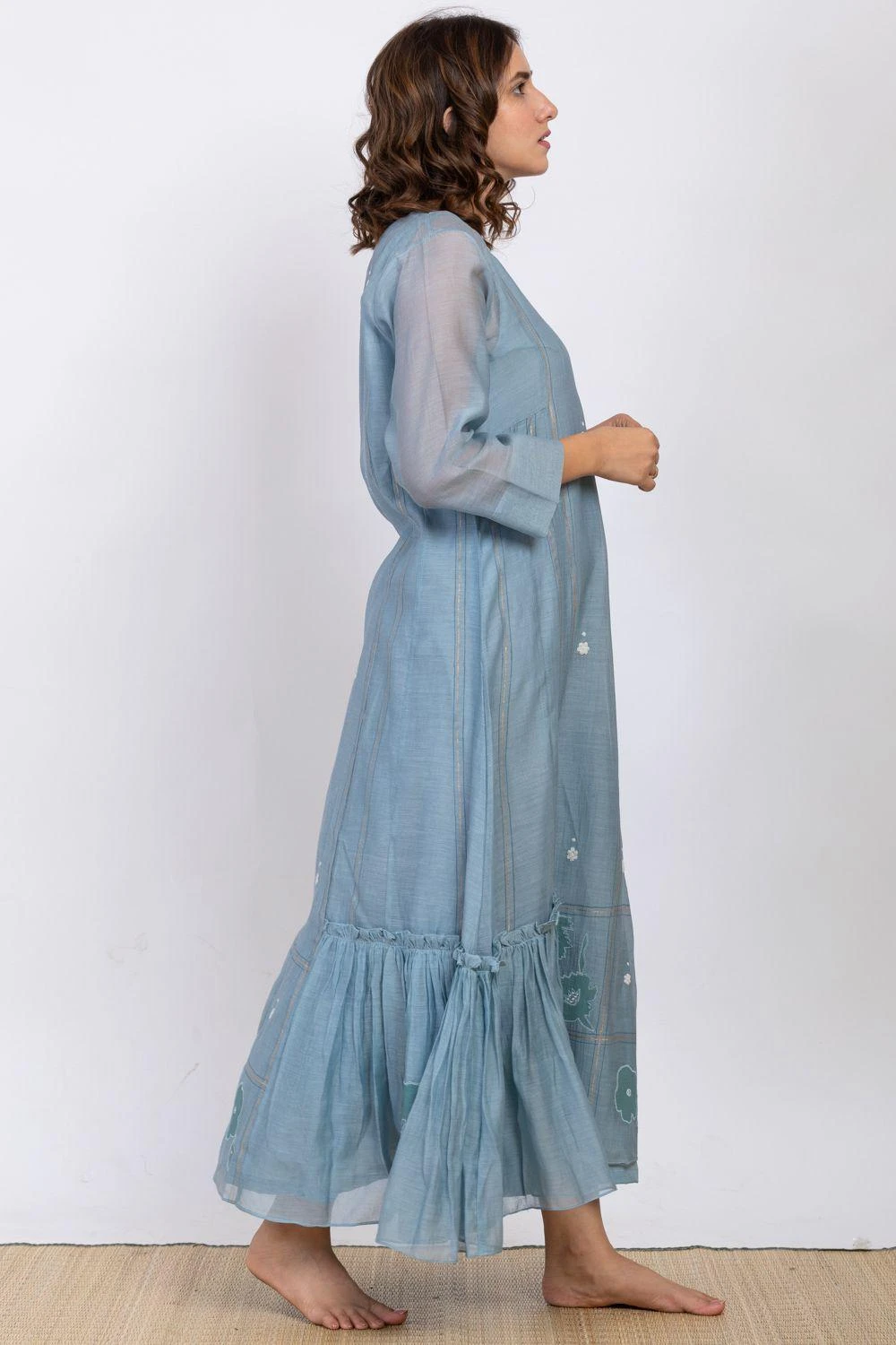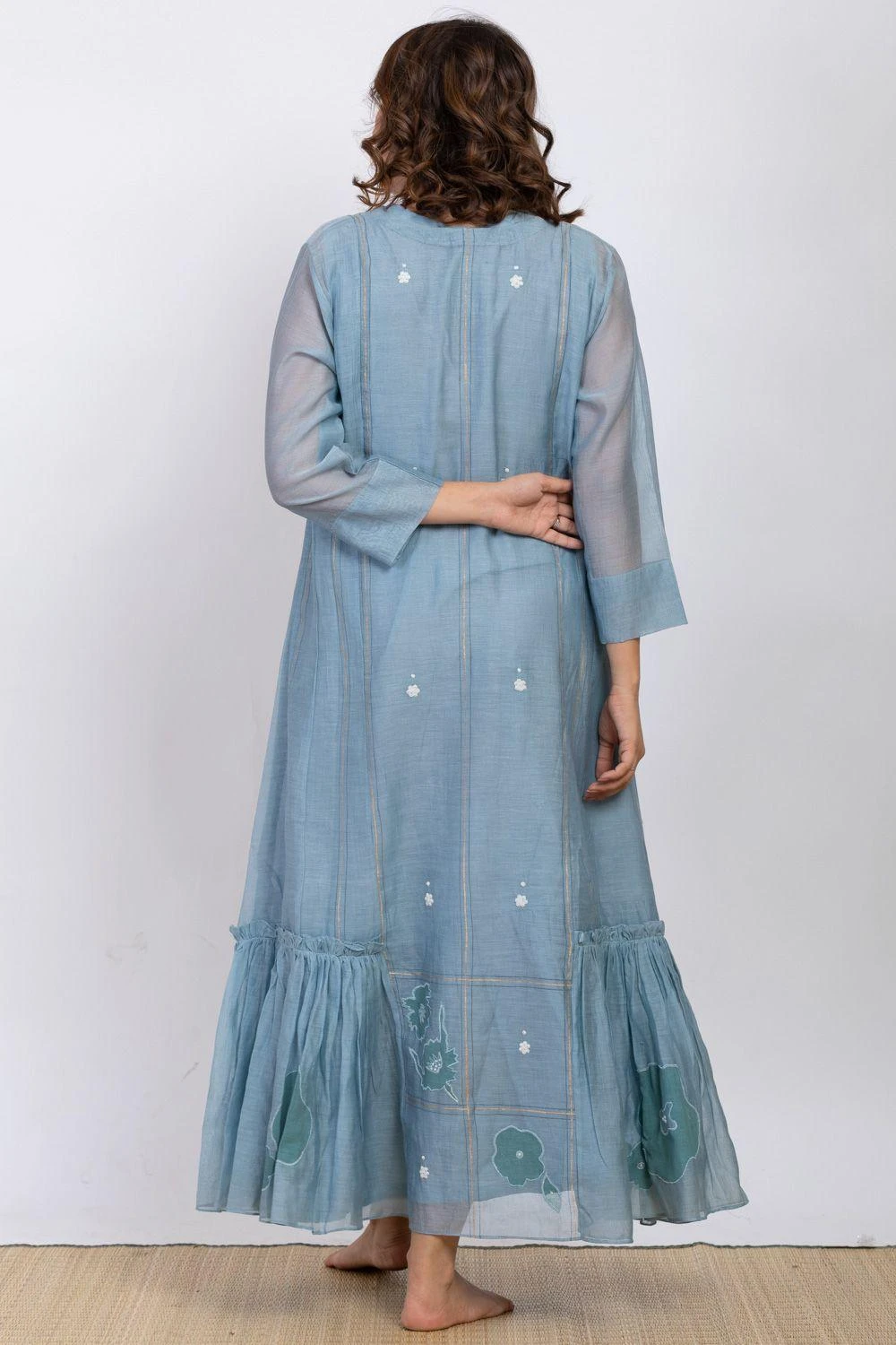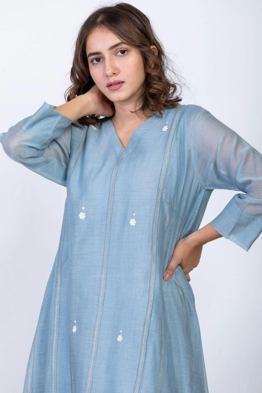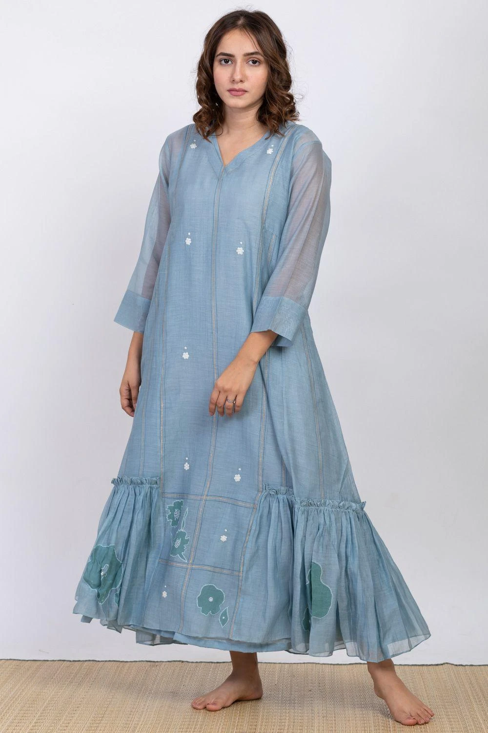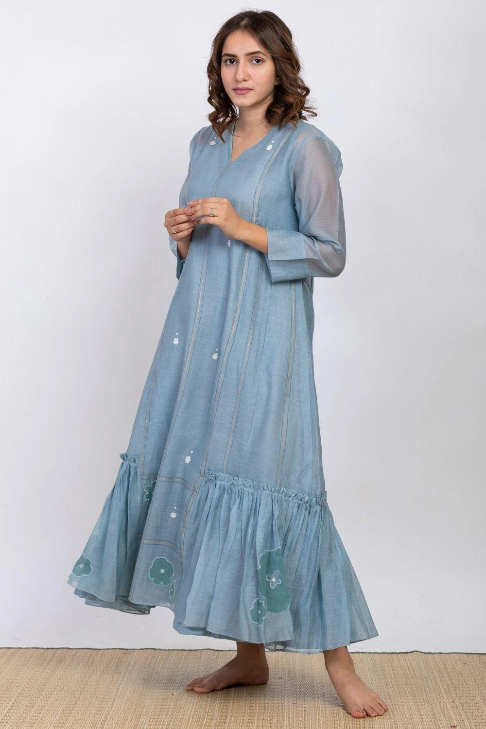 Wear this understated slate blue midi dress in luxe chanderi silk to cool down your summer days. It features elegant details like self texture, dainty floral embroidery & pleats down the hem. It comes along with a cotton silk slip.