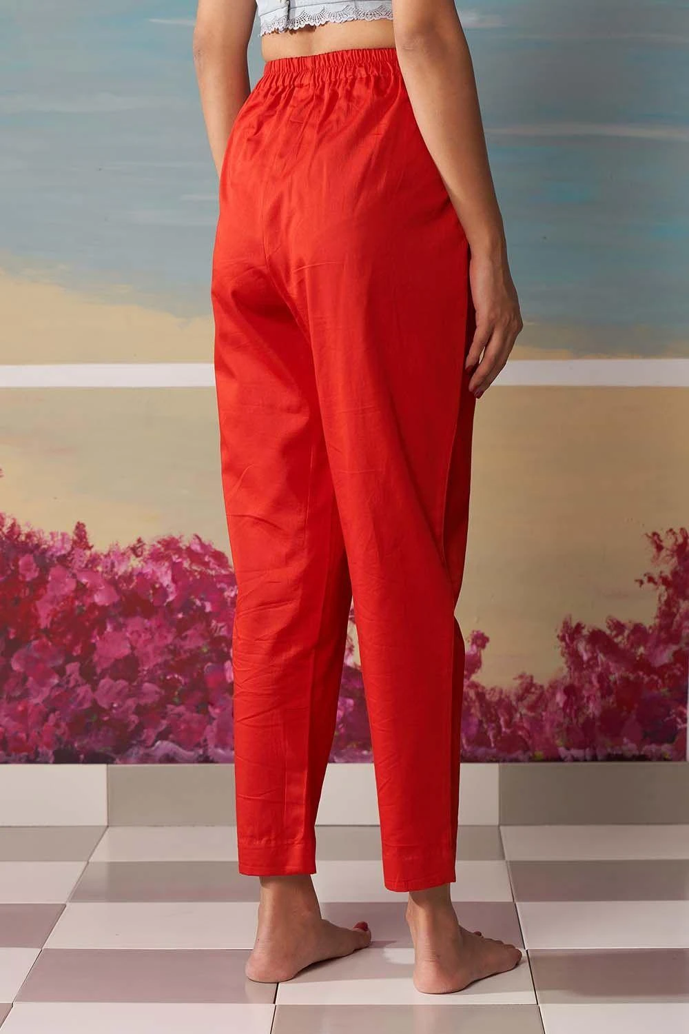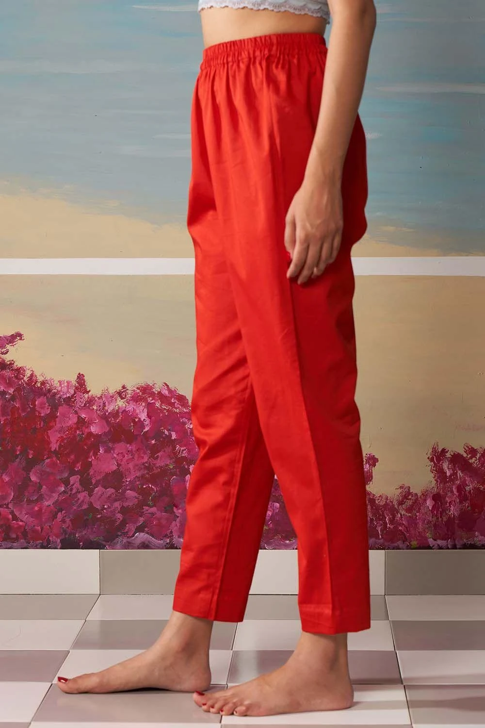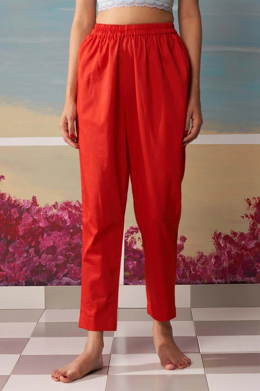These red cotton satin tapered pants are an effortless way to add colour to your look. Style this with a muted tunic or kurta for an understated look.