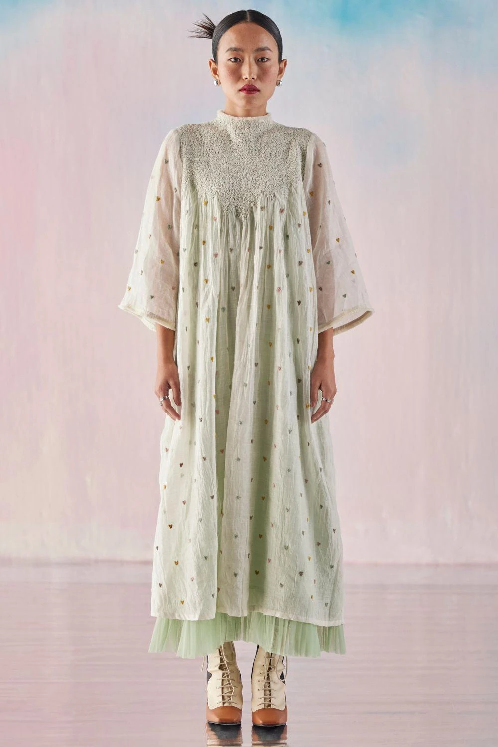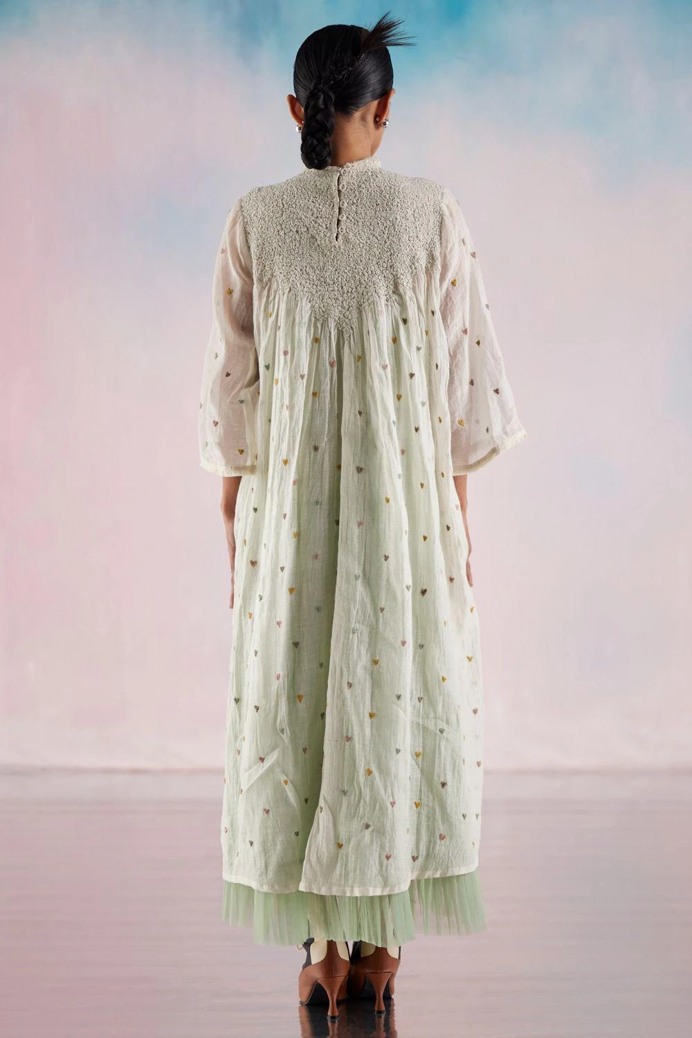 Indulge in romantic elegance with this Heart Embroidered Dress. The smocked neckline adds a touch of sophistication, while the delicate moss embroidery exudes charm. The dress is complemented by a green pleated inner, creating a stunning contrast.