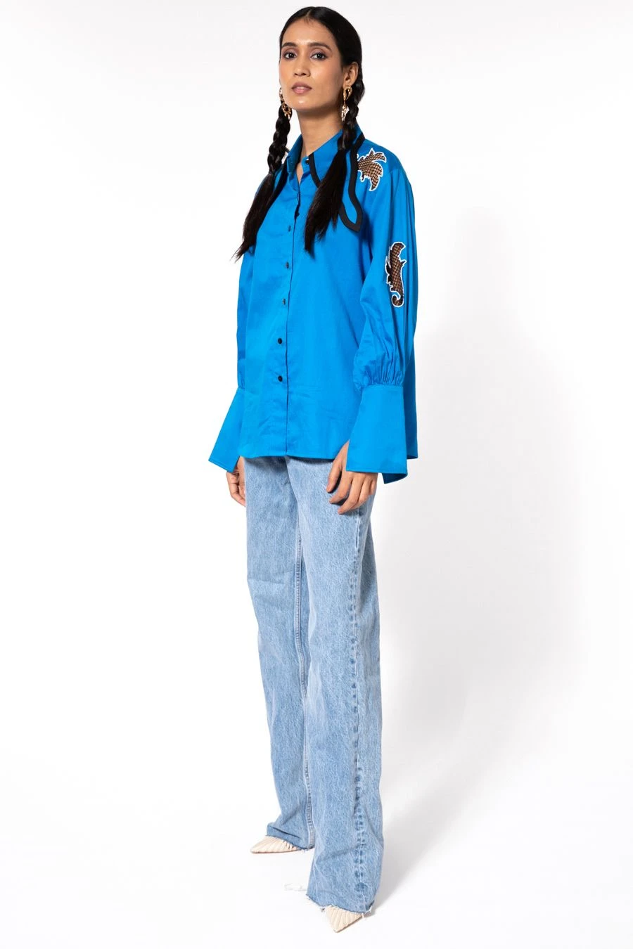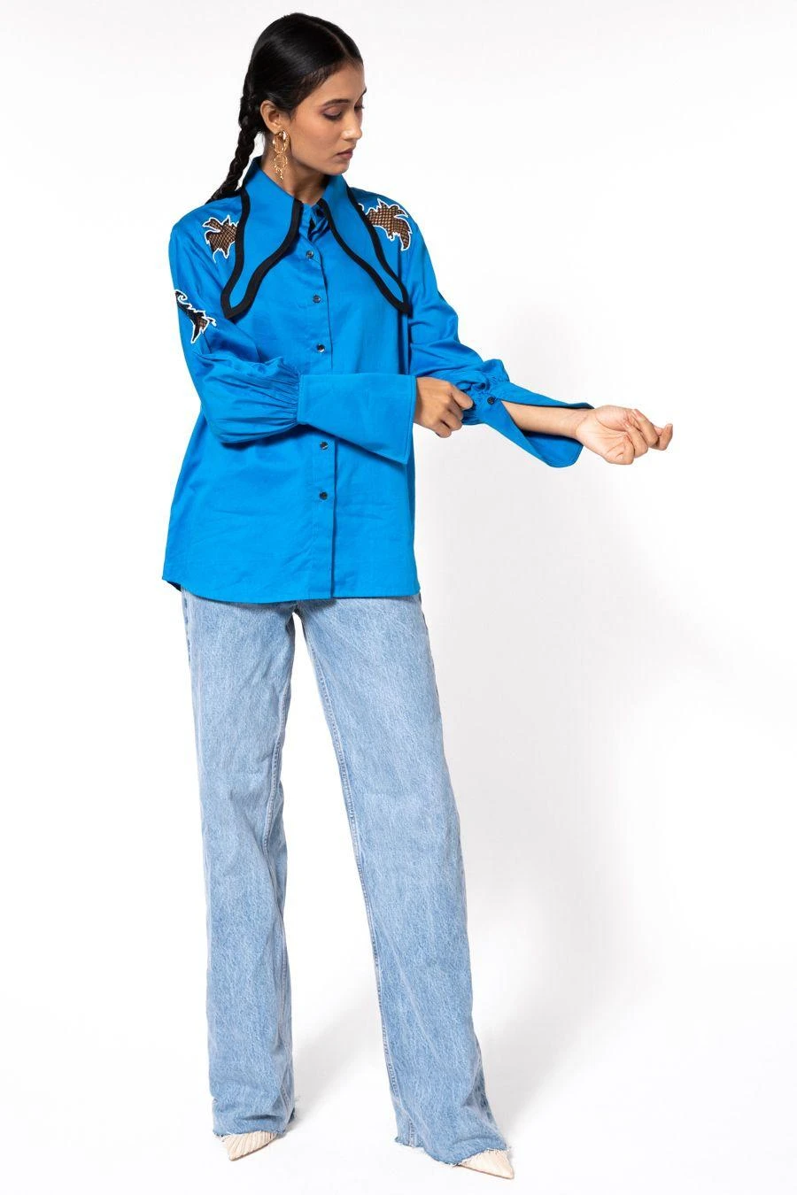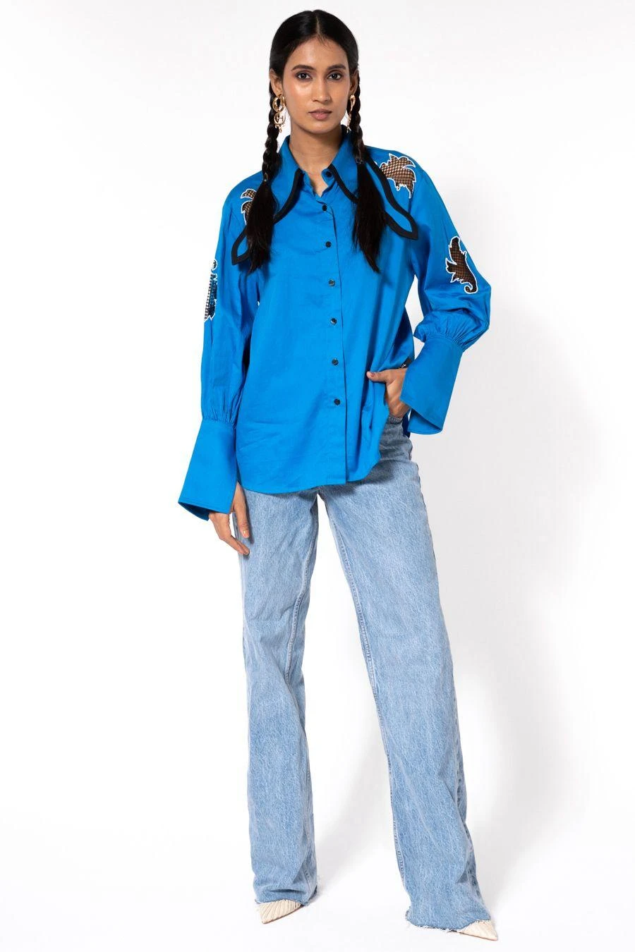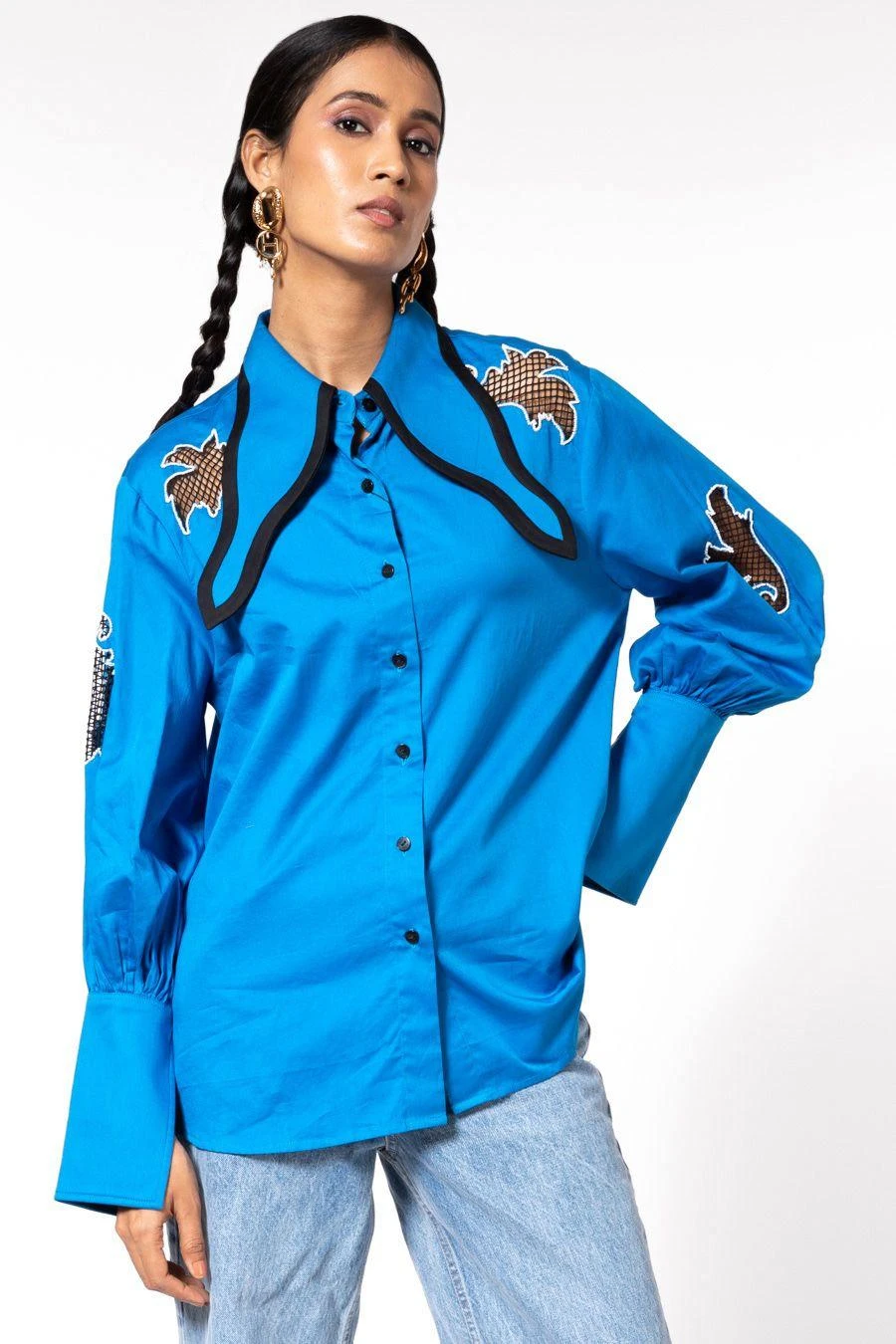 From your work desk to the brunch table & from lounging at home to catching flights, you can always count on this shirt. This shirt features abstract embroidery with an oversized collar. Style it with a pair of denims to complete the set.