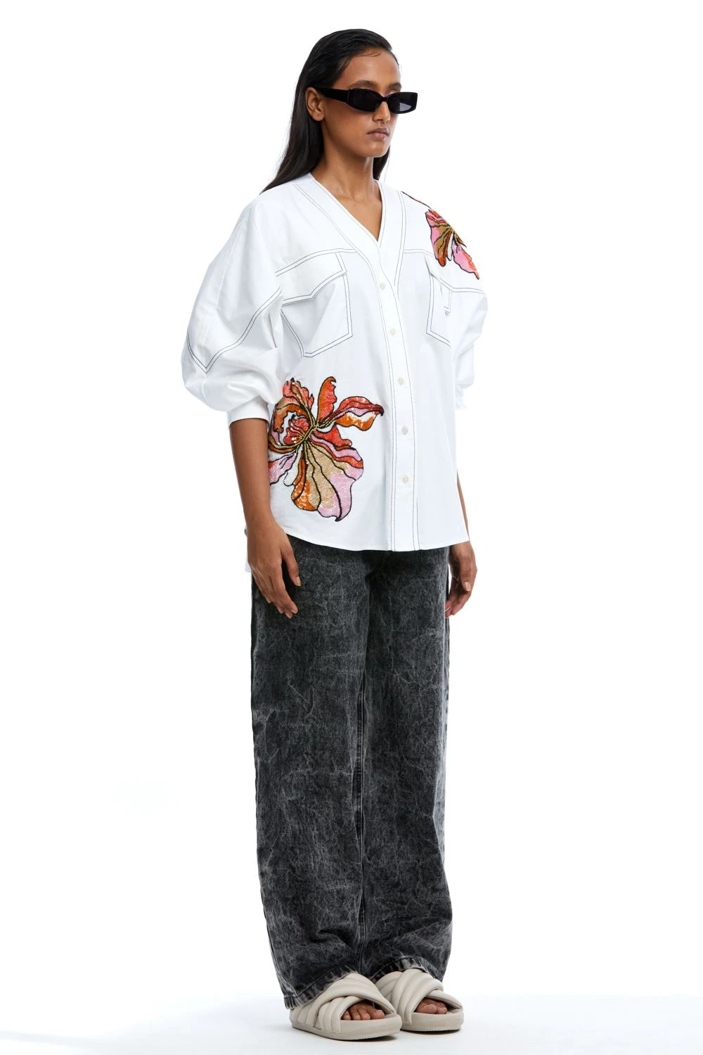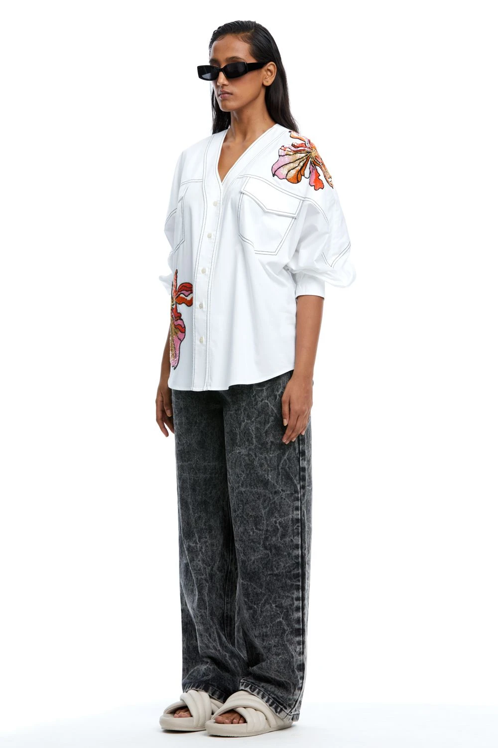 Elevate your style with this Blue Embellished Shirt. The exquisite contrast stitch detail adds a unique touch to this wardrobe essential. Perfect for making a statement while keeping this look effortlessly sophisticated.
