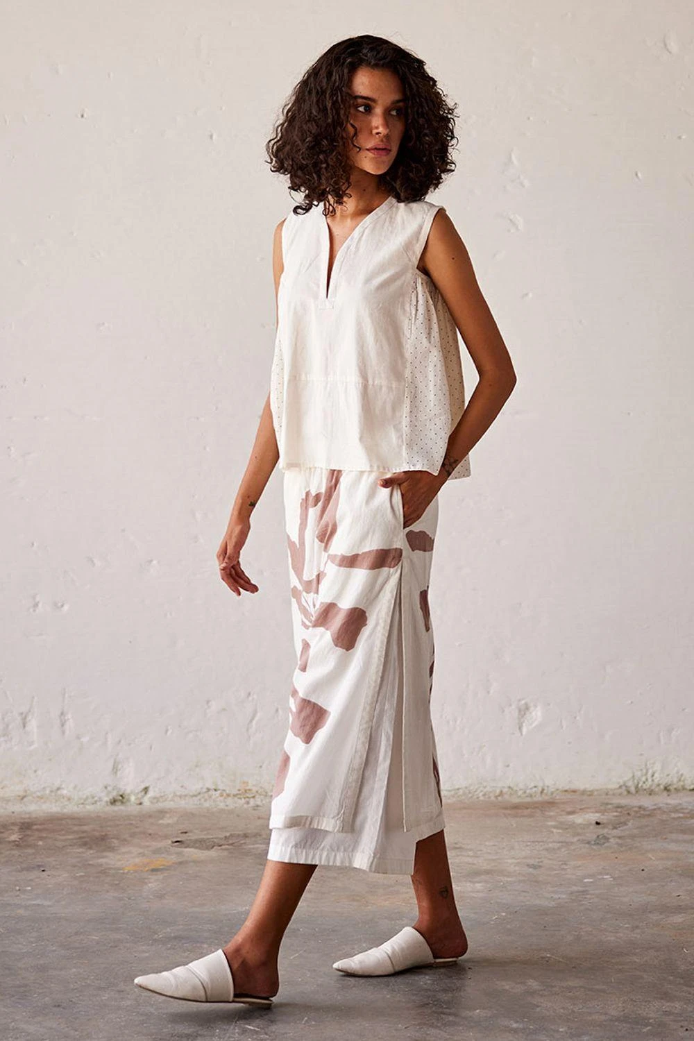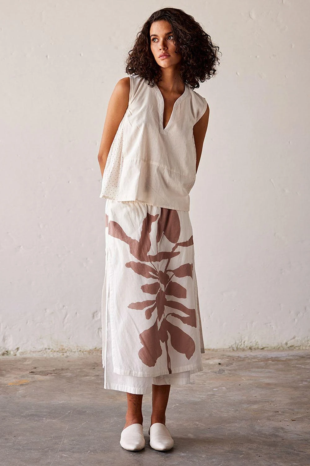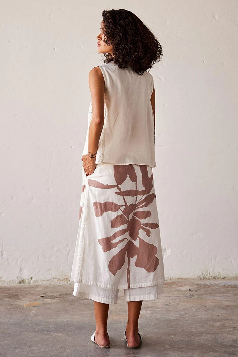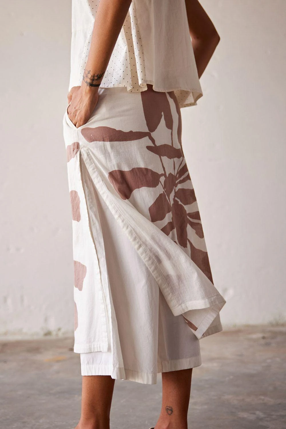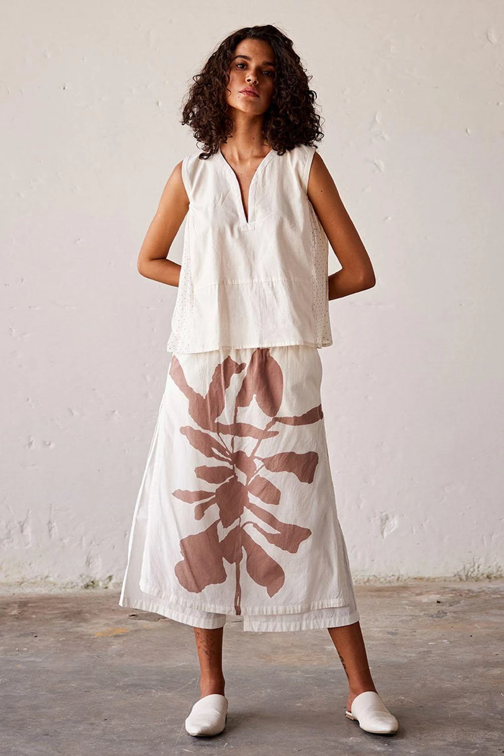 Elevate your elegance with this off-white skirt-trouser fusion. Featuring an elasticated waist and side seam pockets, the mauve floral lino print skirt effortlessly complements the white poplin trouser, creating a chic and versatile ensemble.