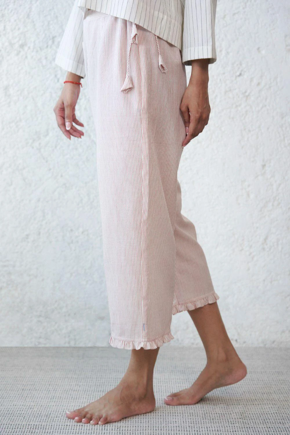 This striped pyjama is cut in handwoven cotton and features a ruffled hem which gives it a soft feminine look. You can style this versatile piece with anything from your closet.