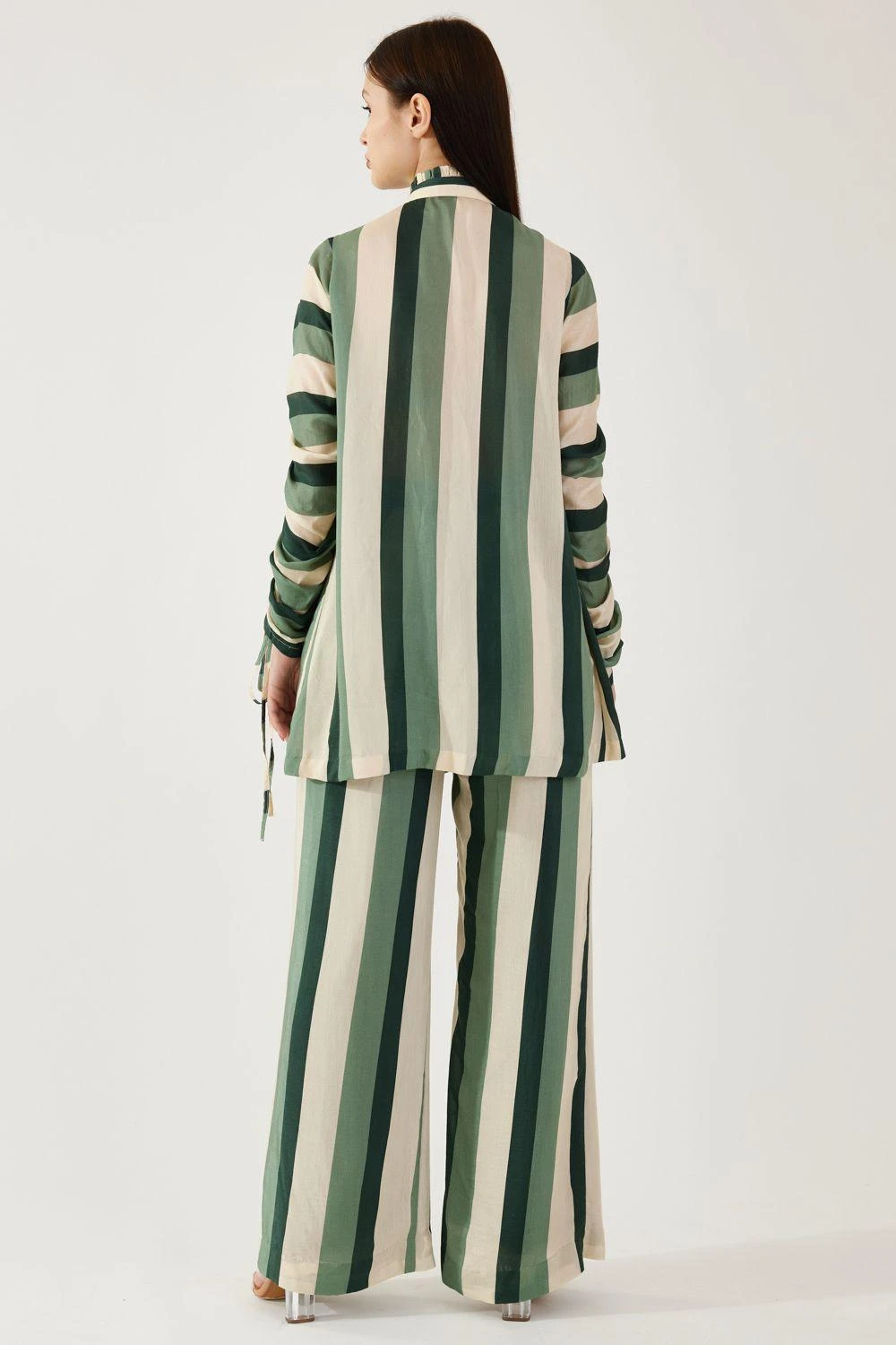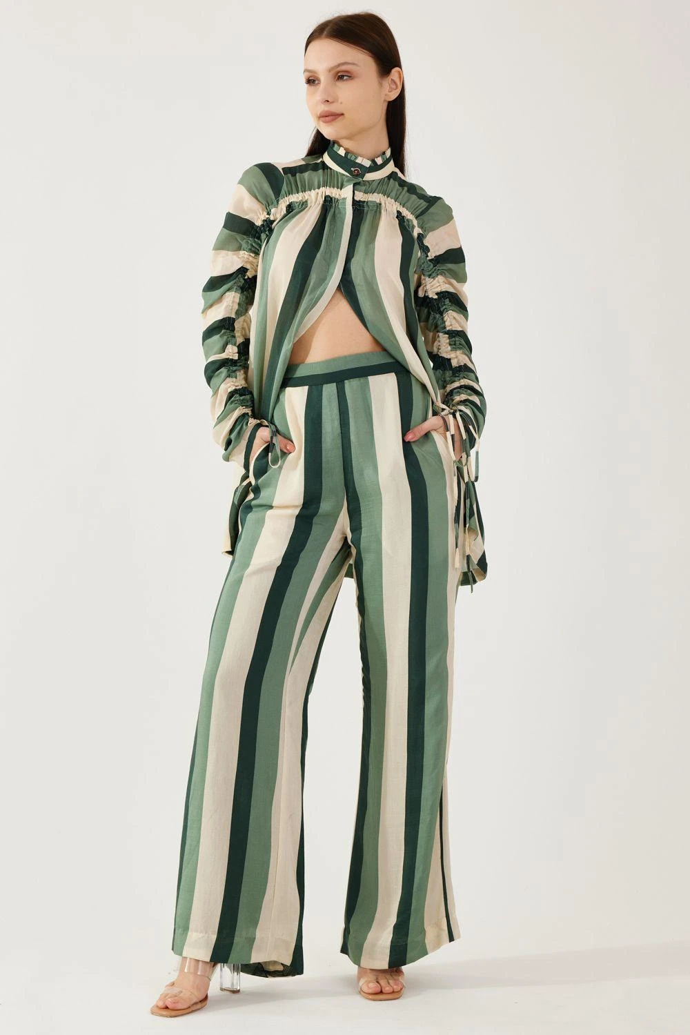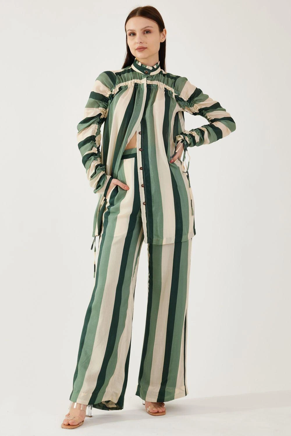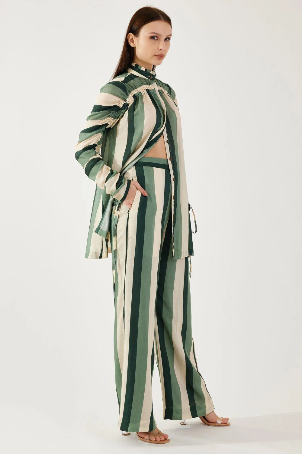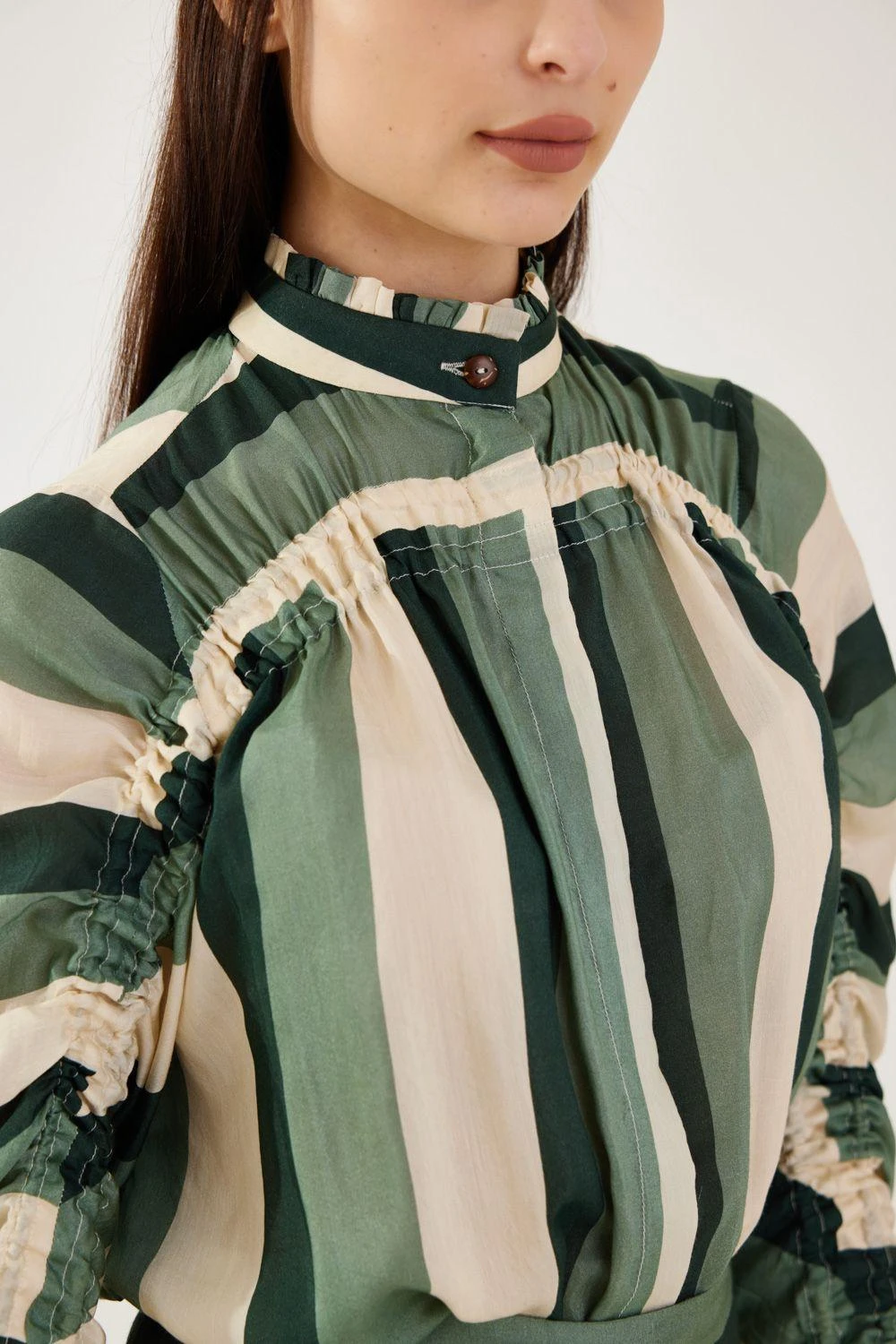 Step into the world of chic fashion with this striped smocking sleeve shirt. The smocking details on the sleeves add a touch of elegance, making it a must-have addition to your wardrobe.