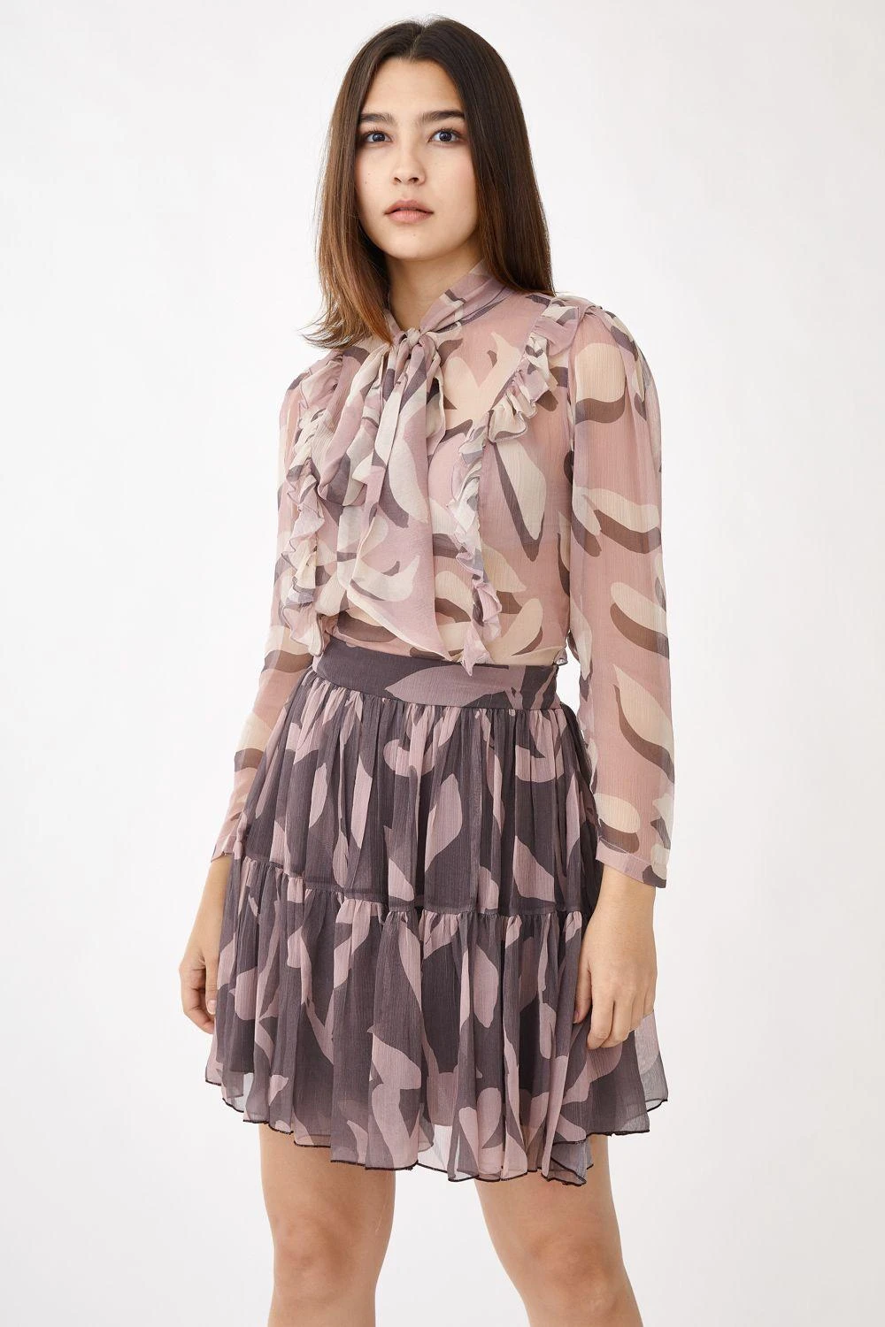 This purple & pink floral print skirt is the ultimate holiday piece. It is cut in chiffon and features a waistband and tiered detail. You can style it with a coordinating top from the collection.
