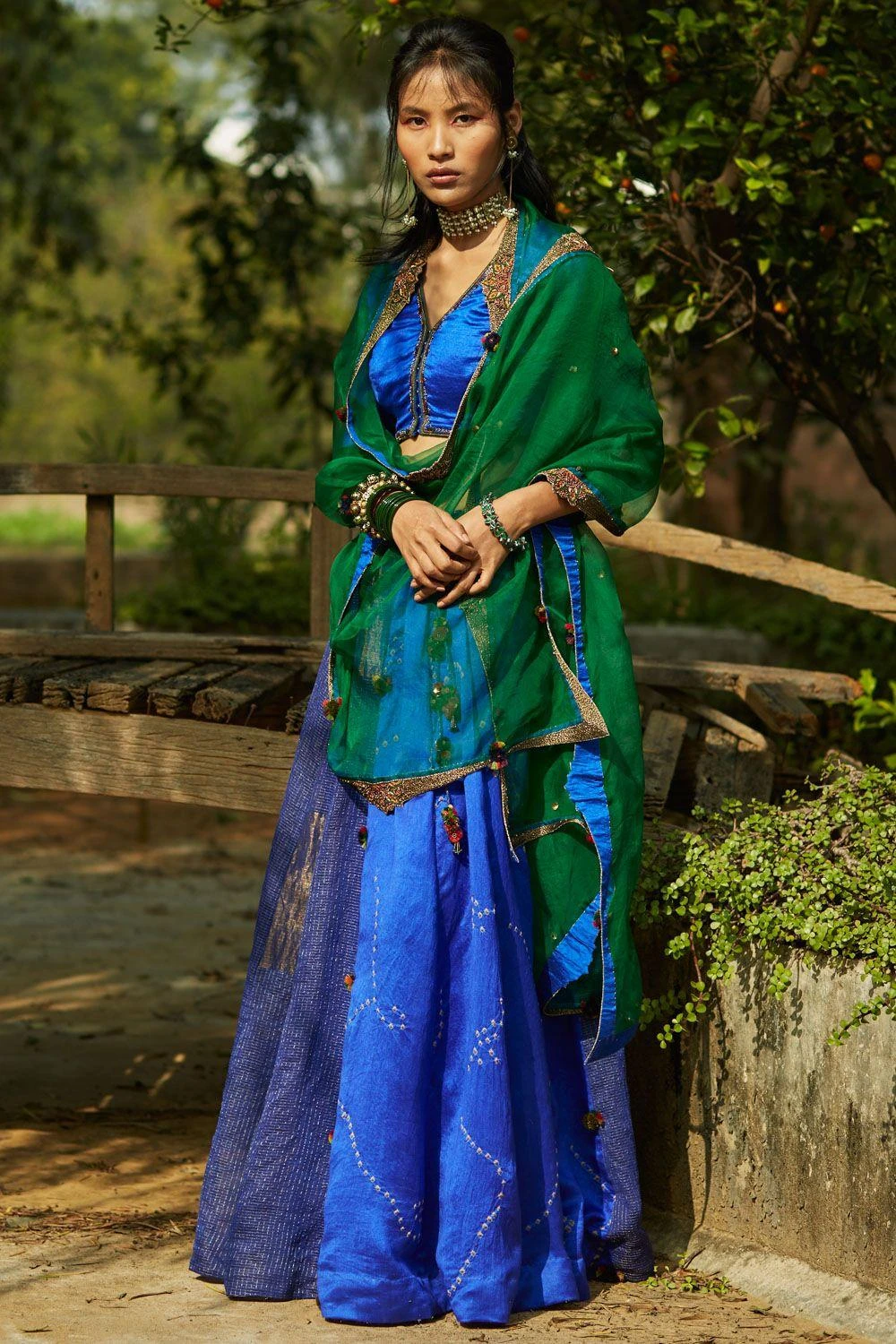 Get in the spirit of festivities with a vibrant outfit that is as traditional as it gets with this peacock blue lehenga. It is curated with hand tied bandhani panels, tissue & chiniya patchwork, paired with a hand embroidered blouse and a dupatta.