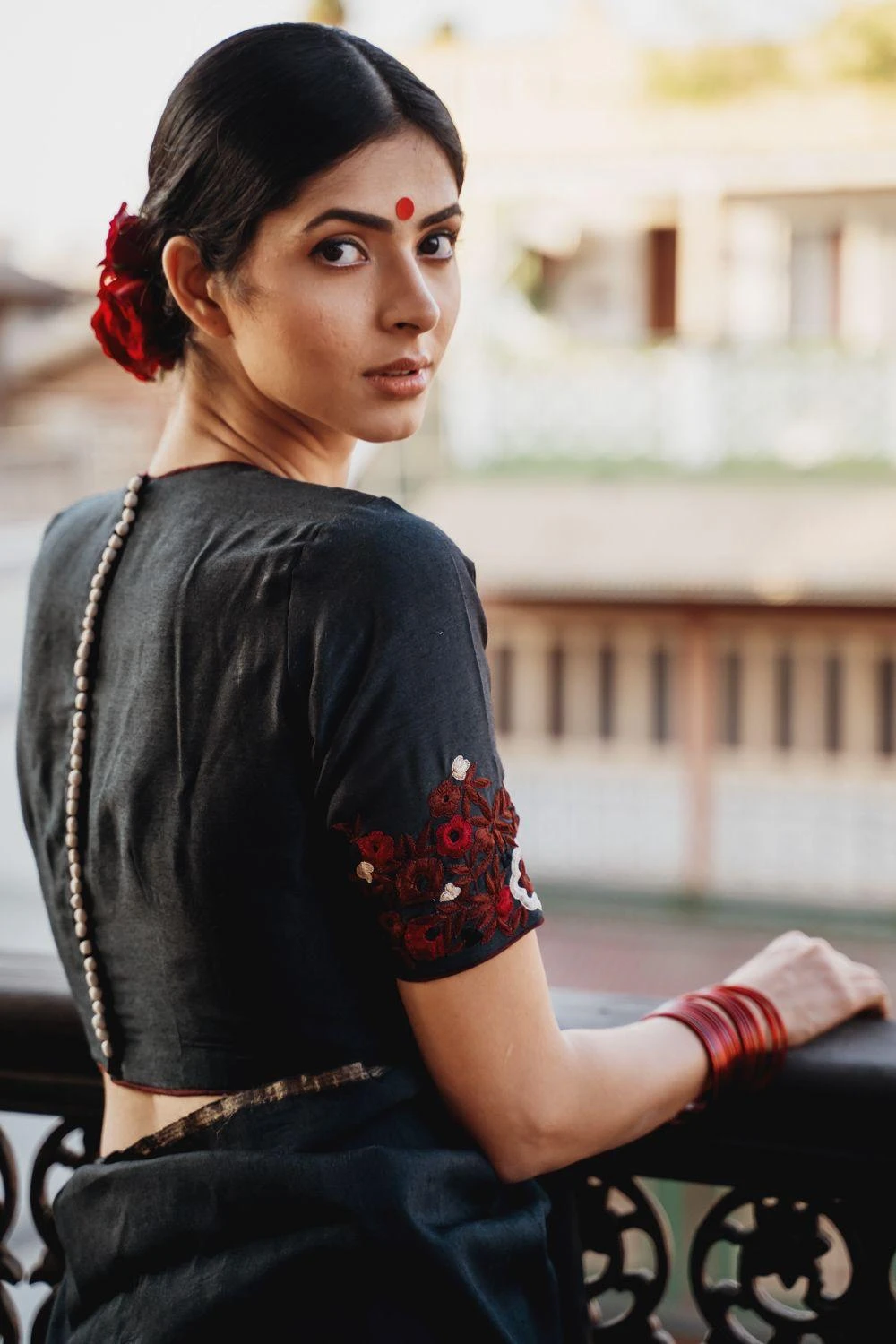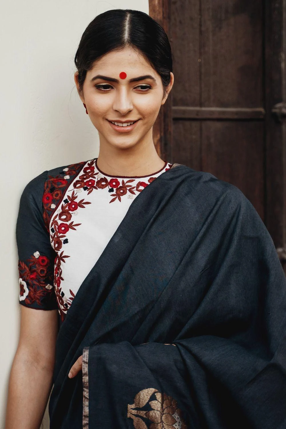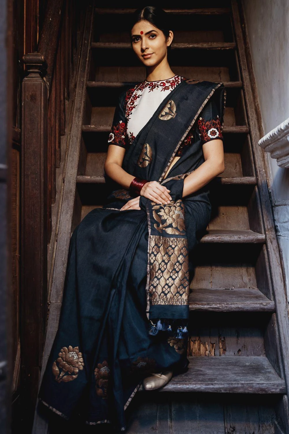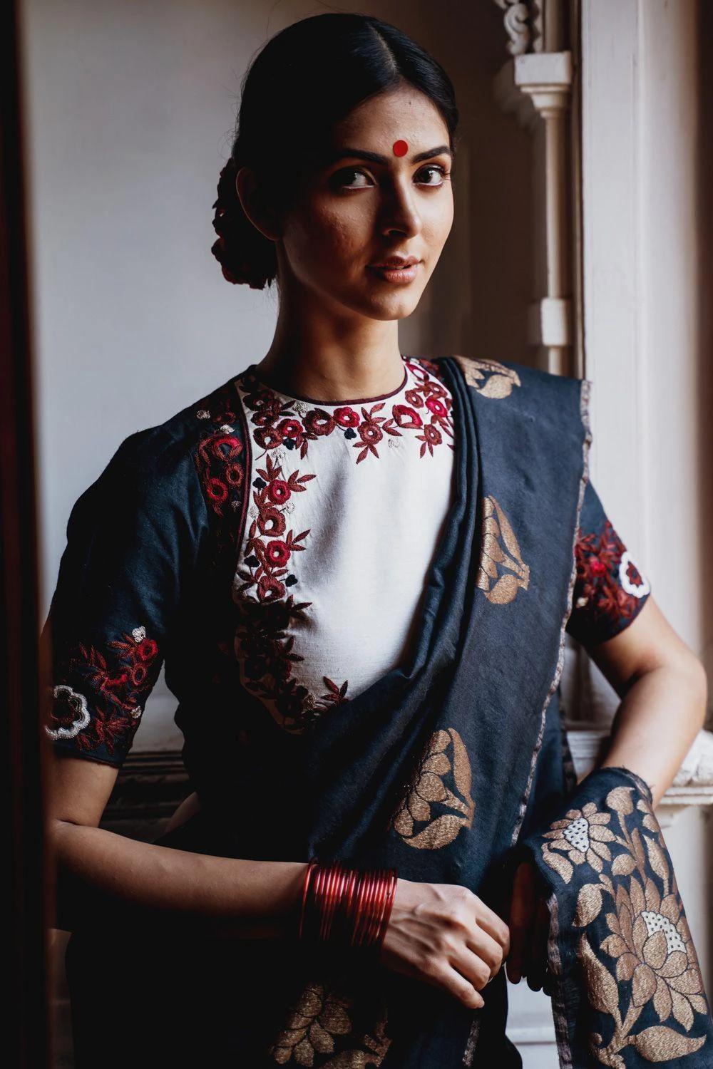 Elevate your sari look with this charcoal & ivory blouse, handwoven in pure munga silk. It is punctuated with delicate kashmiri embroidery on the round neckline, yoke & sleeves. You can team it up with navy blue silk sari from Mimamsaa.