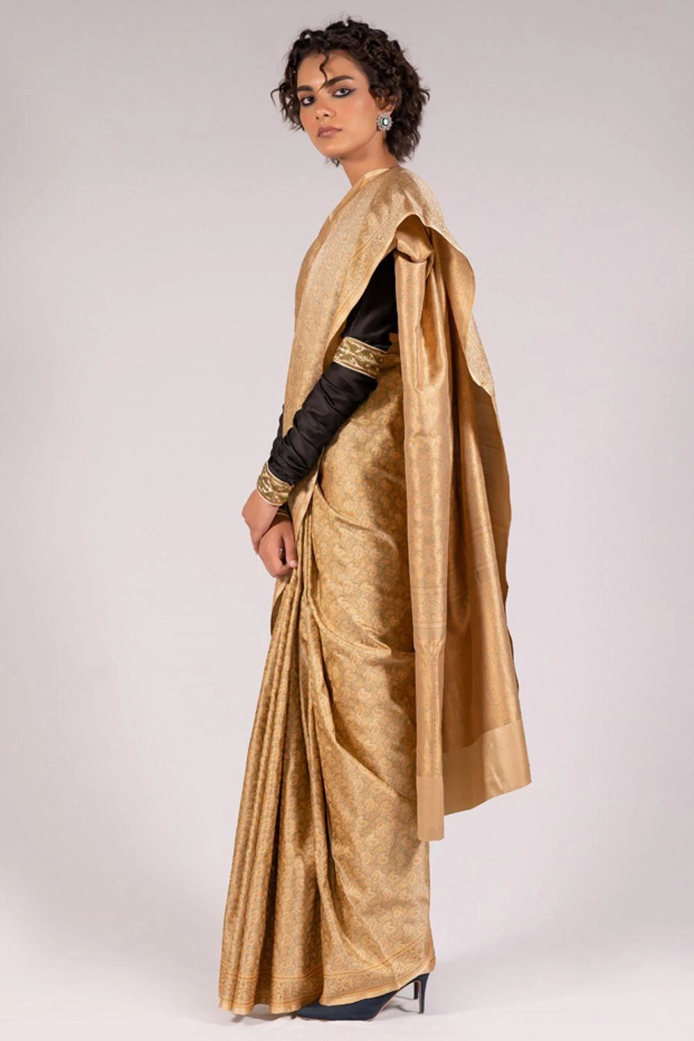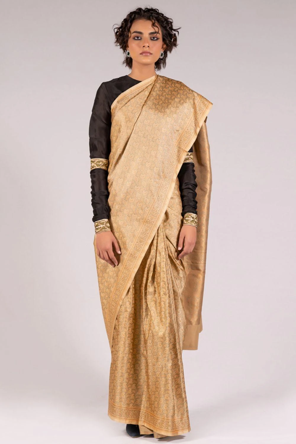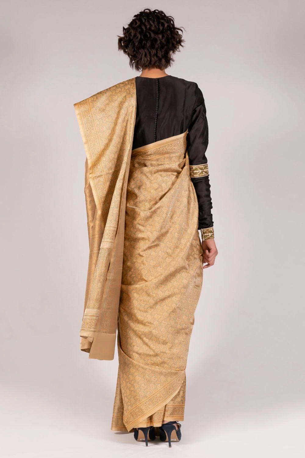 This round neck chanderi blouse is adorned with patchwork munga silk embroidery.This full sleeved piece is a versatile piece & can be styled with almost any sari.This piece is perfect for cooler evenings & can be accessorised with statement earrings.