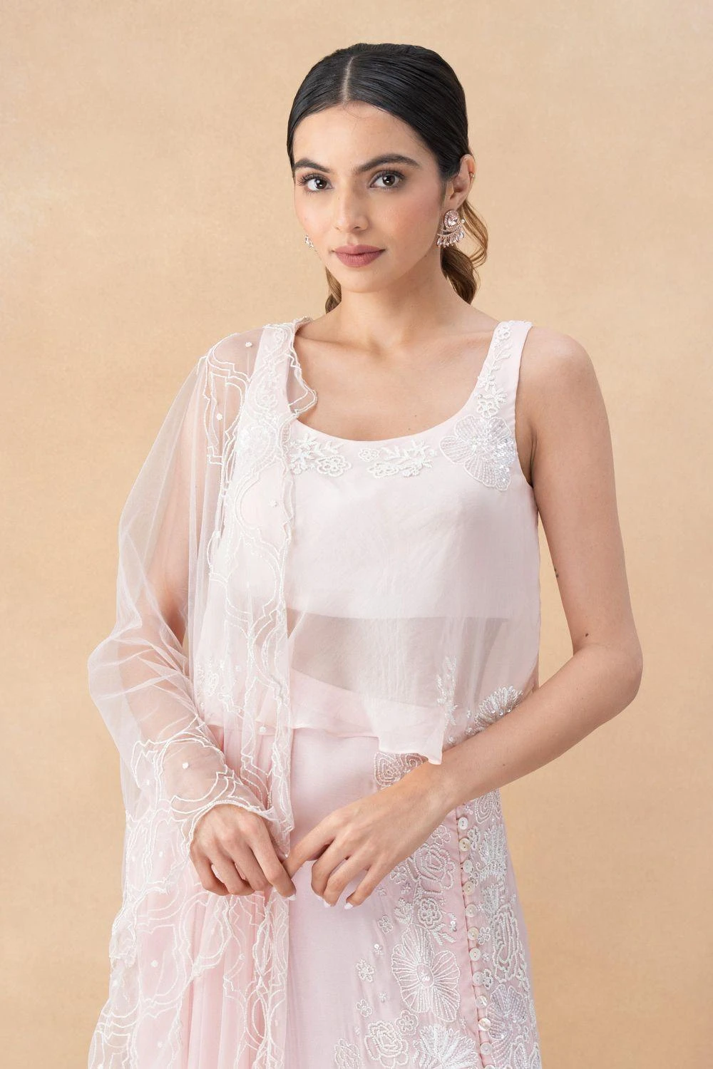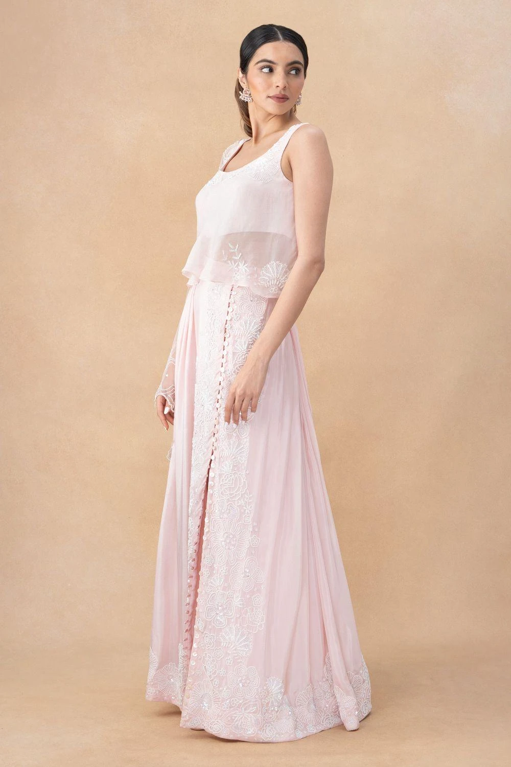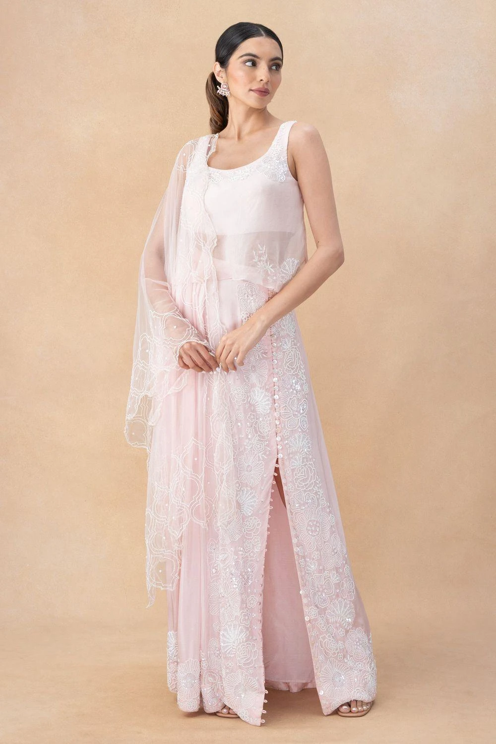 Radiate elegance in this Blush Pink Encrusted Swing Top paired with a matching skirt and dupatta. This ensemble exudes sophistication with its delicate embellishments, perfect for your special occasion.