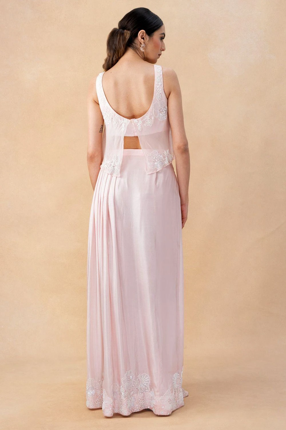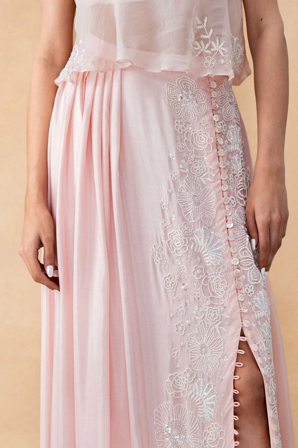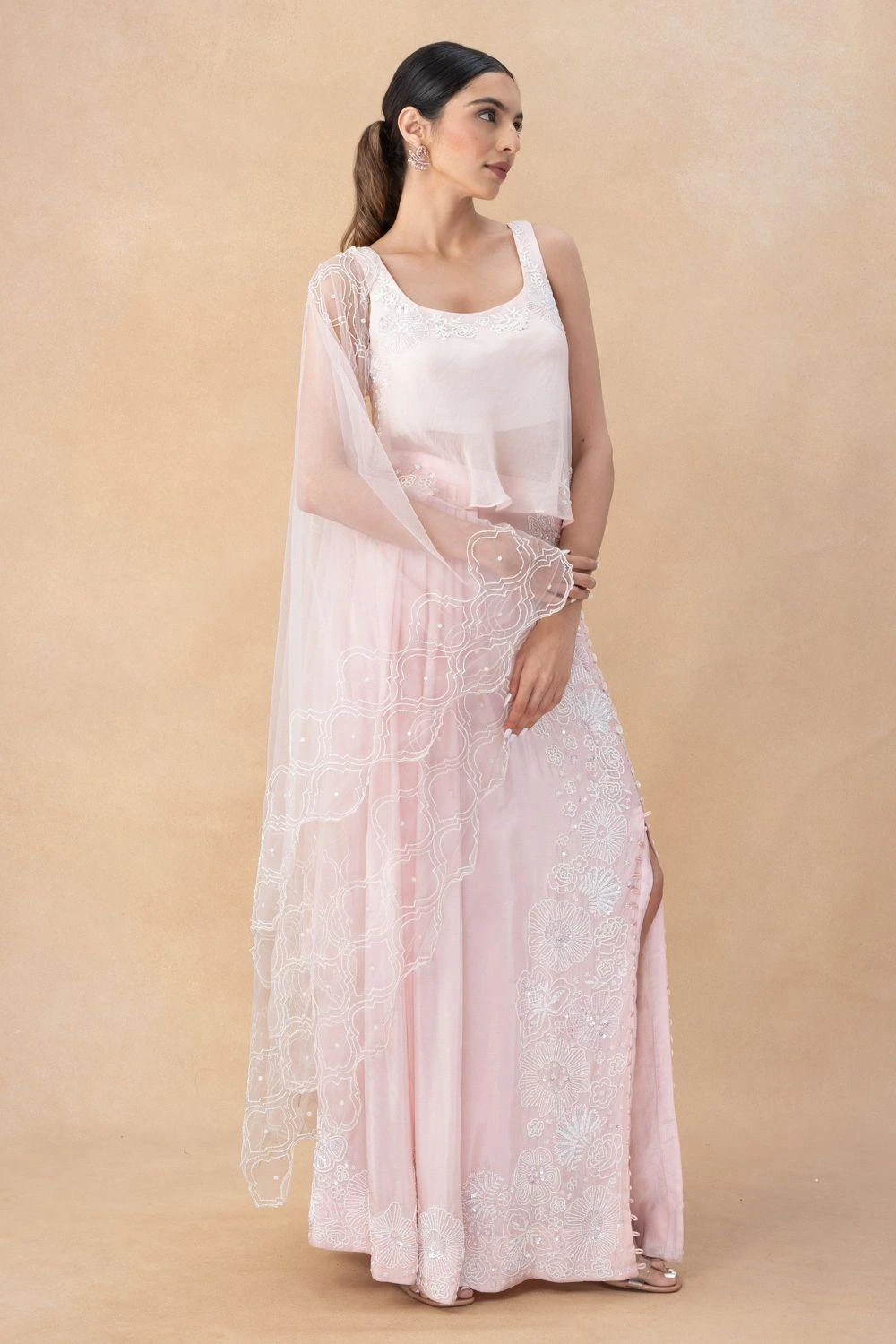 Radiate elegance in this Blush Pink Encrusted Swing Top paired with a matching skirt and dupatta. This ensemble exudes sophistication with its delicate embellishments, perfect for your special occasion.