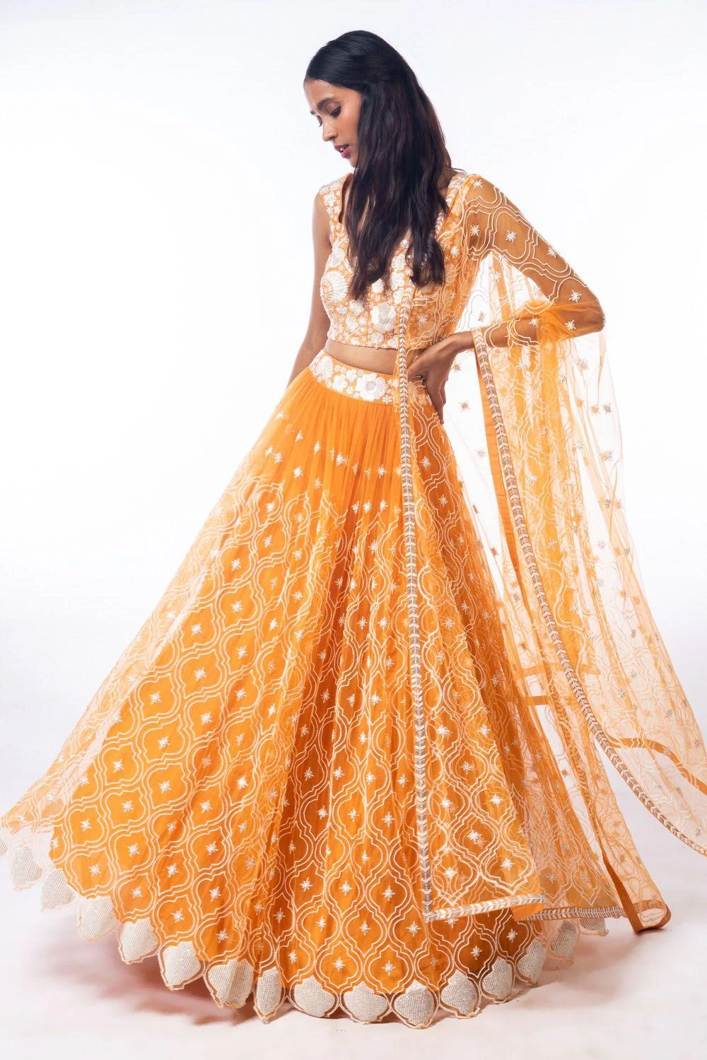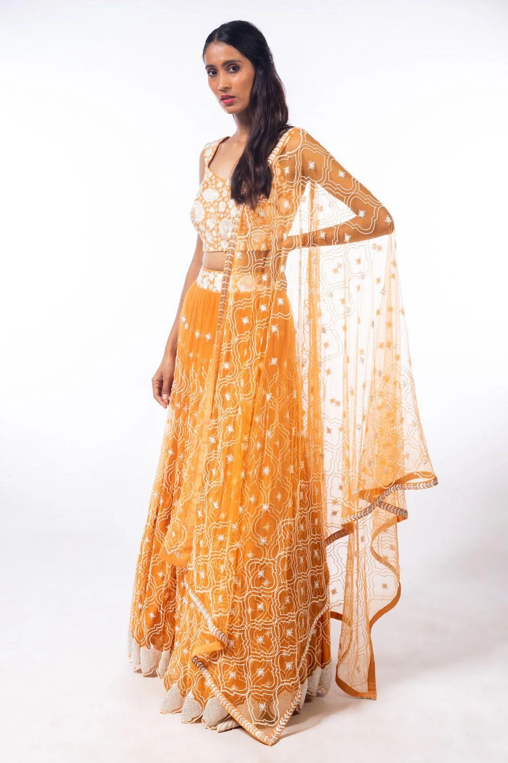 Look like a vision on your engagement day in this ethereal orange ensemble. It is cut in tulle and heavily embellished with sequin work on lehenga & dupatta and floral motifs on the blouse. Style it with a jadau necklace set to complete your look.