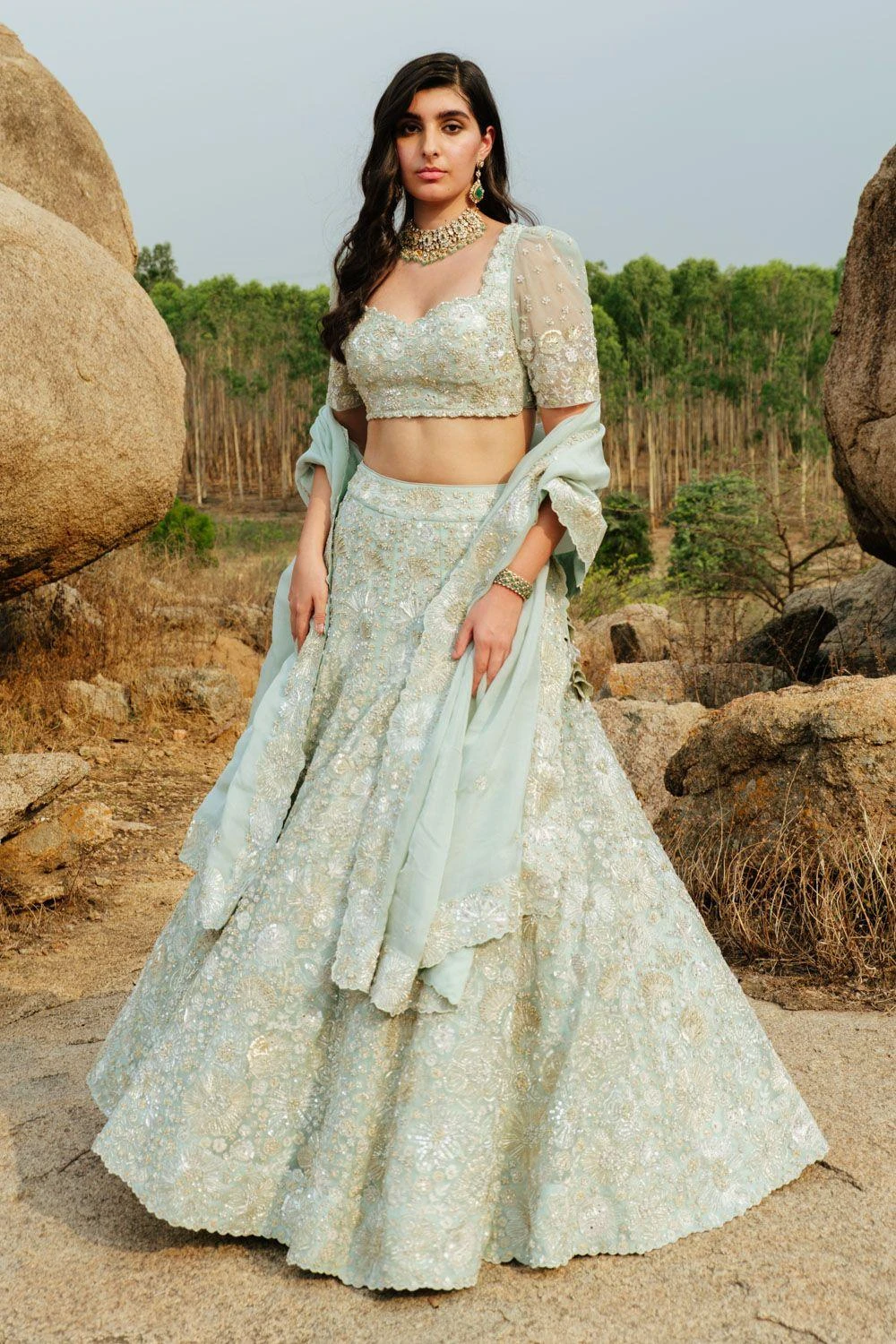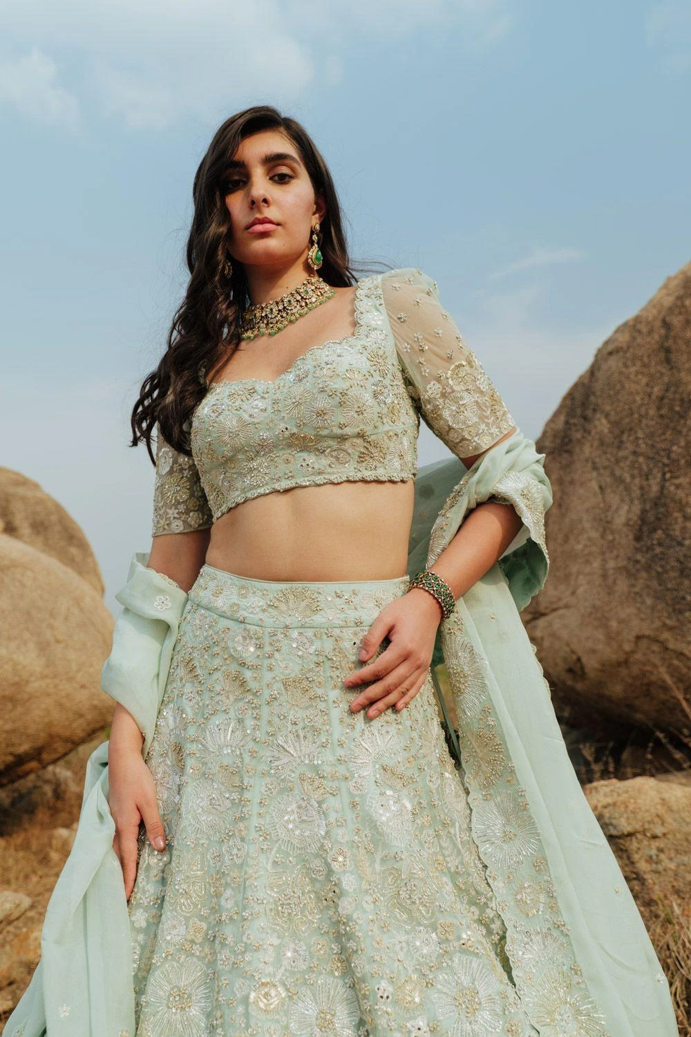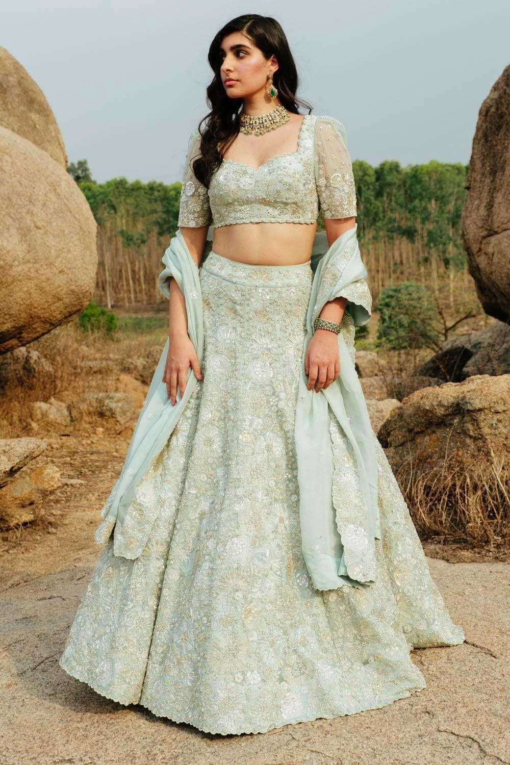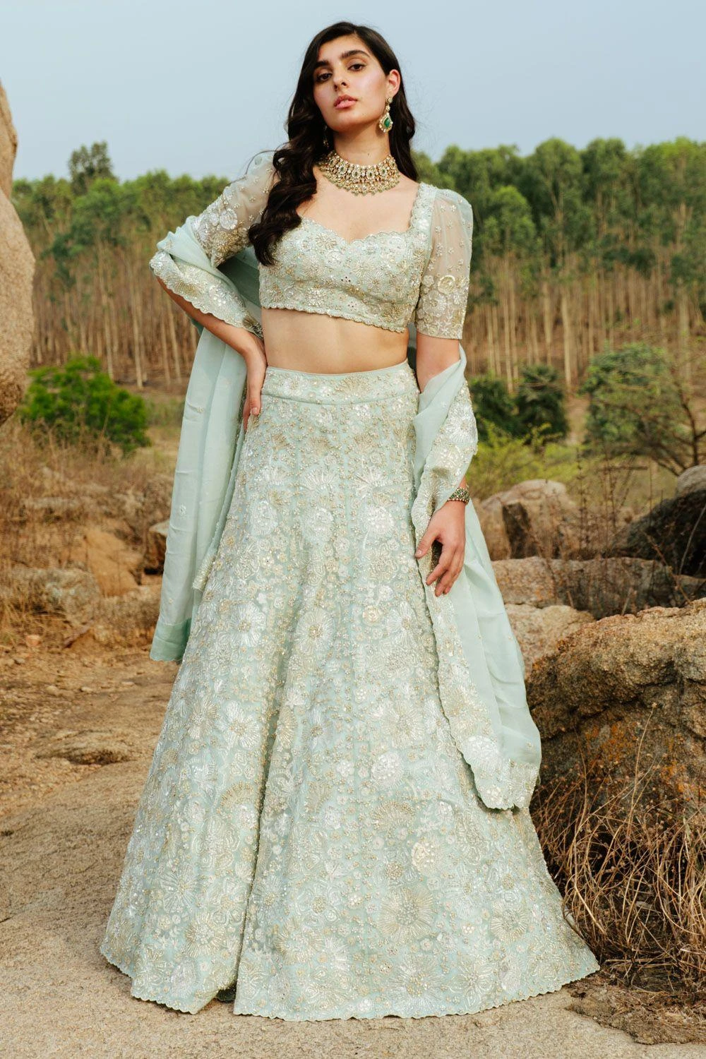 This green lehenga set will see you through all kinds of festivities. It features a floral embroidered lehenga paired with a blouse & a cutwork dupatta. This set is hand embroidered with zari, sadi, mirrors and sequin work.