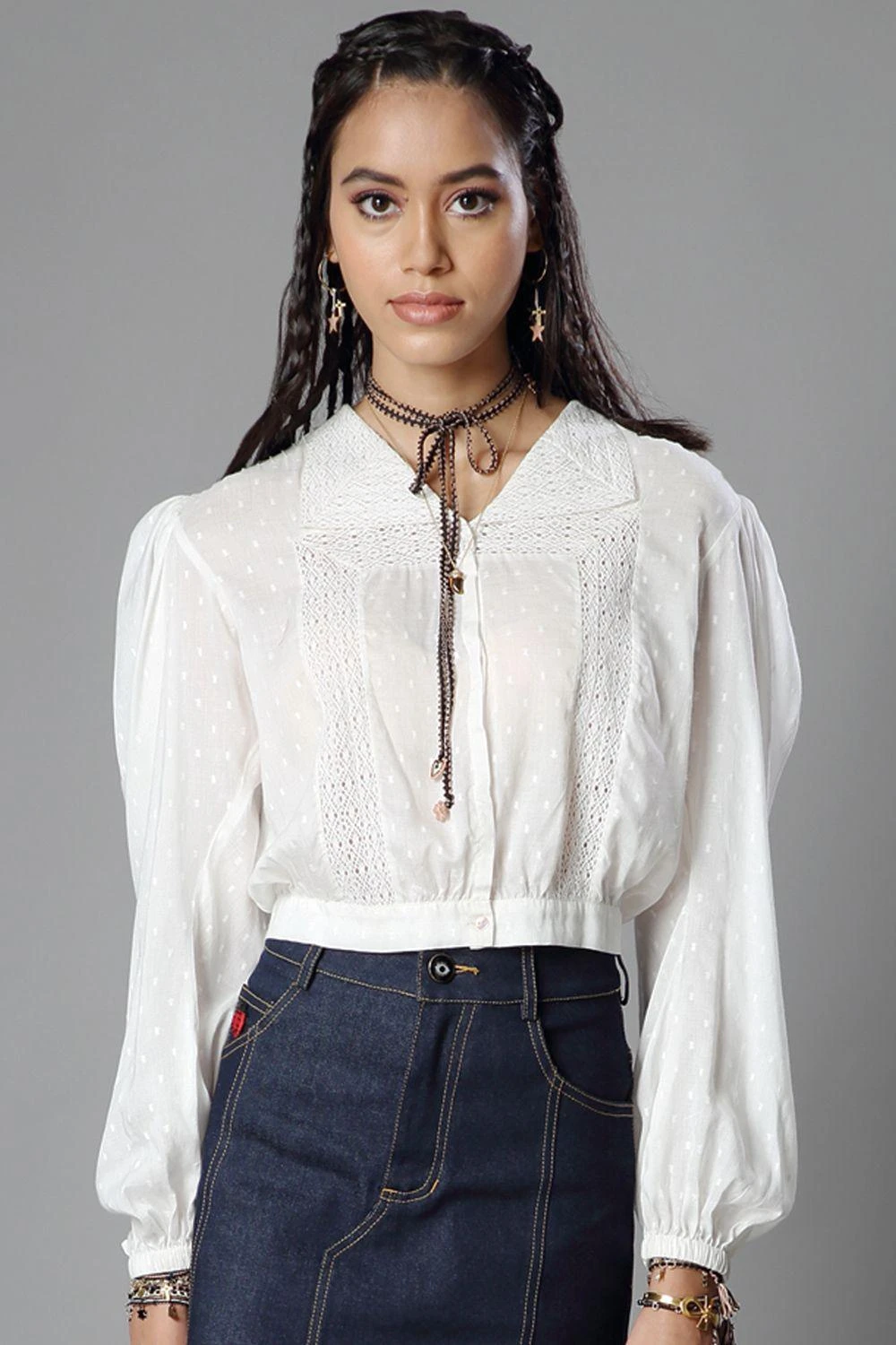 Whizz from the boardroom to the bar in this white top. Cut in organic viscose muslin, it features crochet laces for a playful, transparent look & puffed Juliet sleeves. Style this top with a pair of black trousers & gold hoops to complete the look.