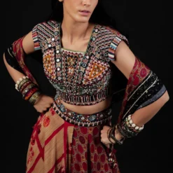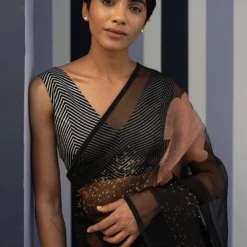 Step into luxury with this V-neck elbow sleeve Mulberry Silk blouse, adorned with elegant side zippers. Pair it with a coordinating sari from the collection to complete the set.